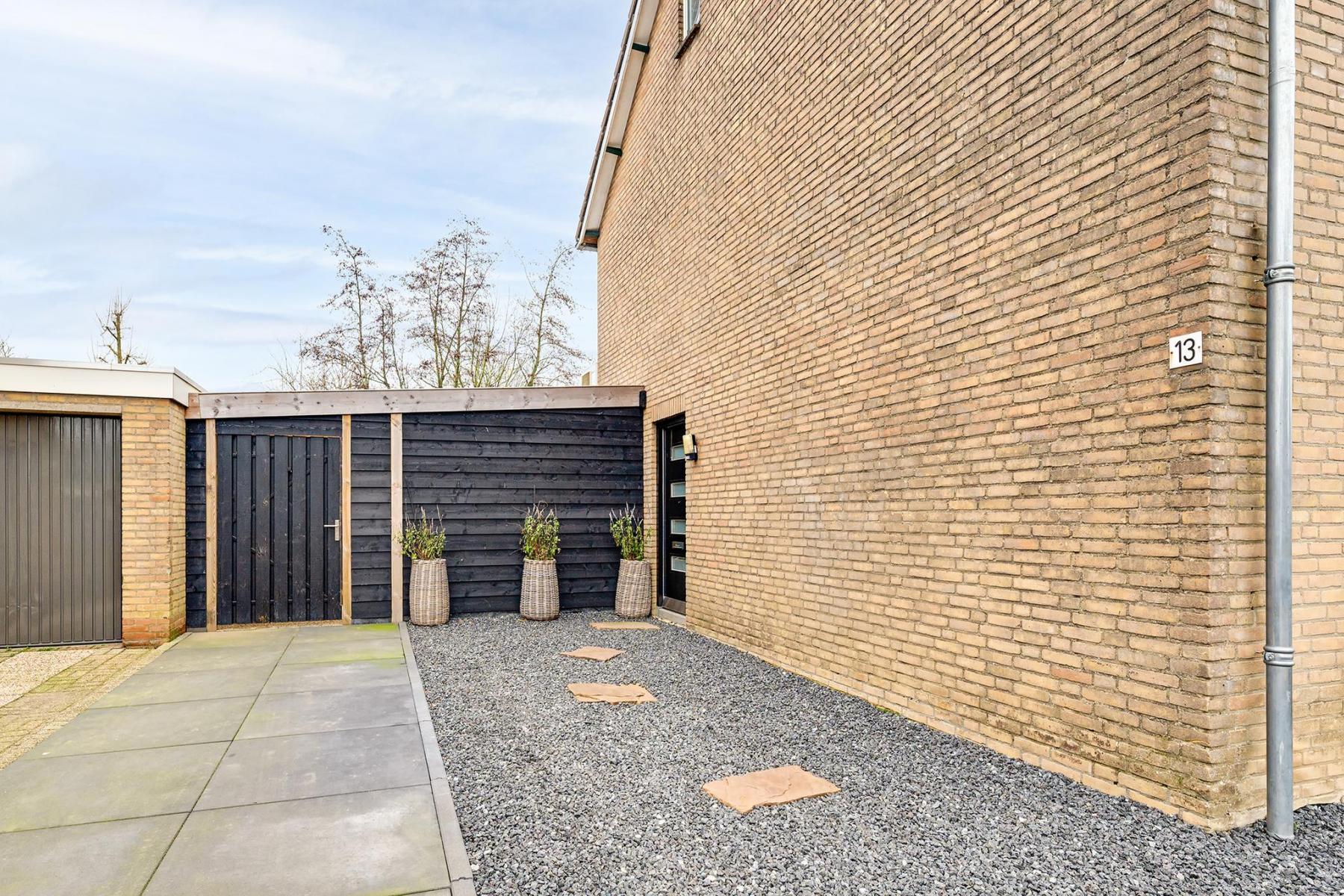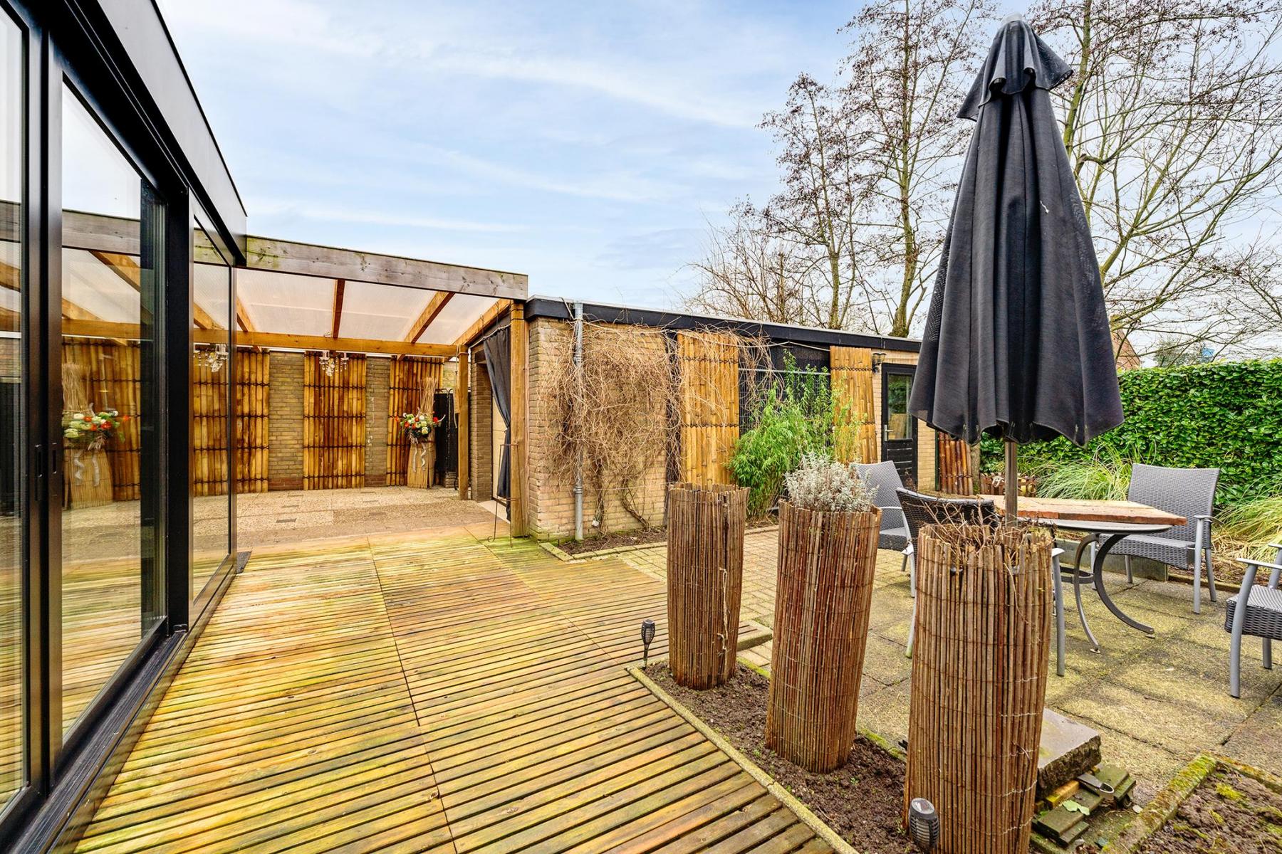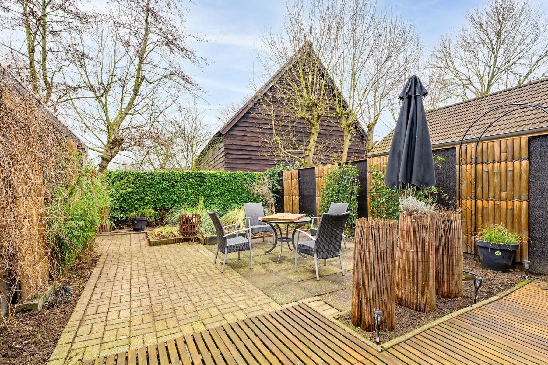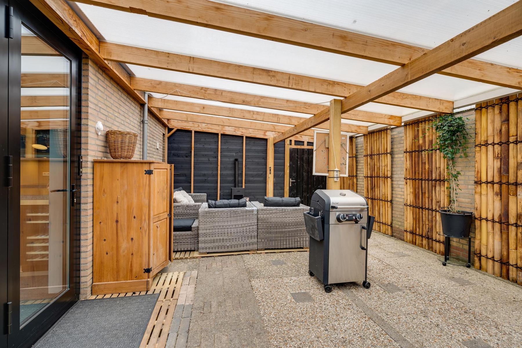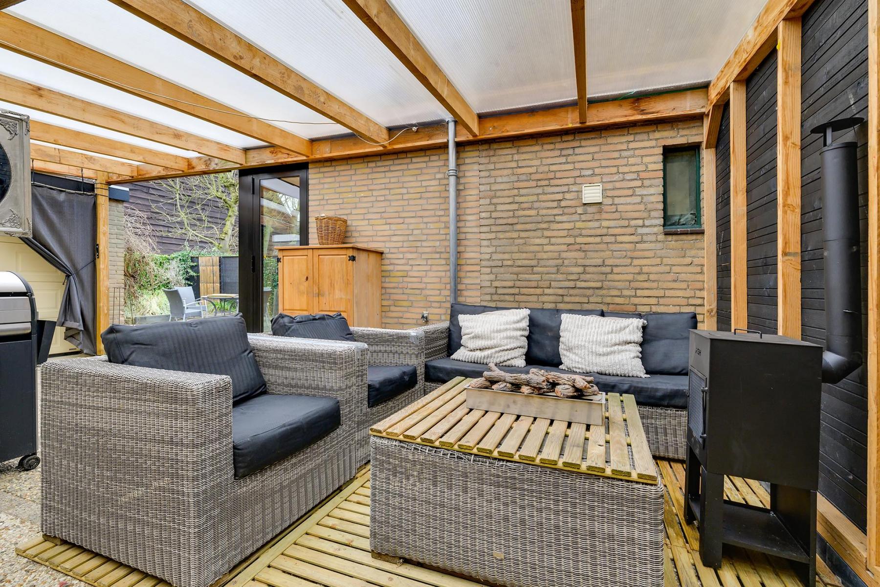 Onder de riante overkapping/veranda van ca. 5.00 x 8.00 kunt u heerlijk buiten zitten, ongeacht het weer. Er is een houtkachel aanwezig en meer dan voldoende ruimte voor een zithoek, zwembad of jaccuzi. Mocht u liever in de buitenlucht willen zitten, dan biedt deze tuin u meerdere mogelijkheden. Wilt u op het vlonderterras zitten achter de woning, of toch liever midden in de tuin op het betegelde terras? Alles is mogelijk! Door de groene haag en de bamboe schuttingdelen zit u in ieder geval altijd lekker beschut.