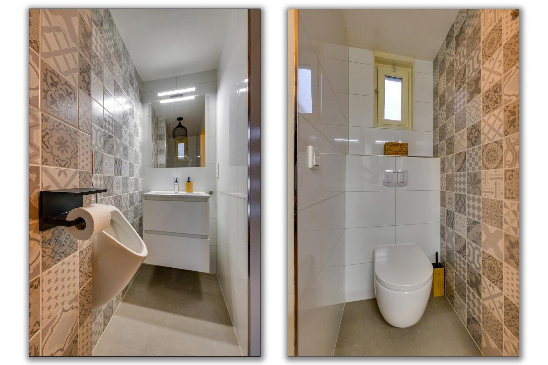 De entree van de woning bevindt zich aan de zijkant. Hier komt u binnen in de hal, die toegang geeft tot het toilet, een praktische uitgebreide elektriciteits-en bergkast/garderobe/en de woonkamer. De toiletruimte is voorzien van hangend toilet, urinoir en een wastafelmeubel.