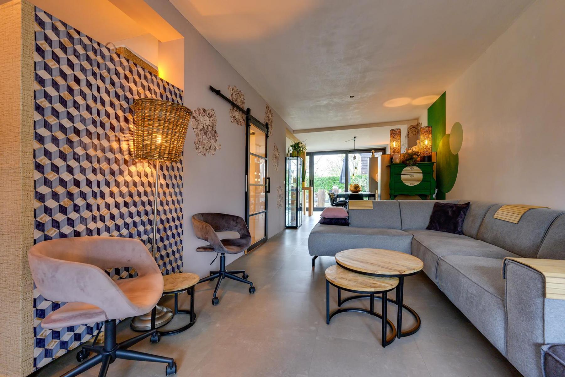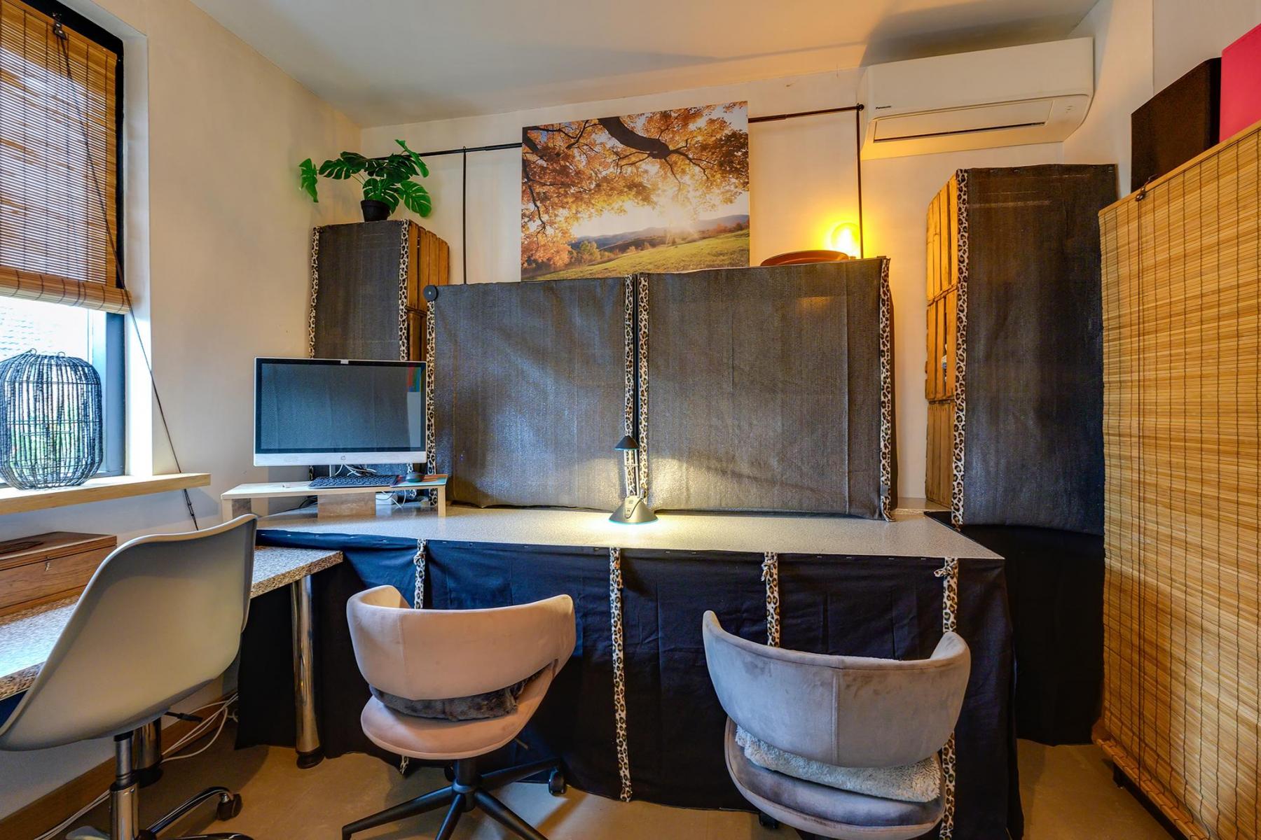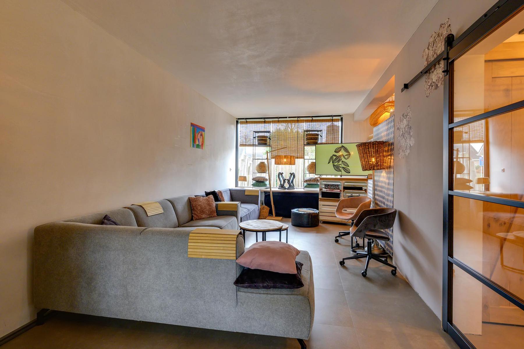 De riante woonkamer (ca. 24 m²) ligt aan de voorzijde van de woning. Hier heeft u een leuk uitzicht over de straat. De industriële schuifdeur geeft een ruimtelijk effect. In de L vorm van de woonkamer aan de straatzijde is nu een kantoor gecreëerd met losstaande room dividers.