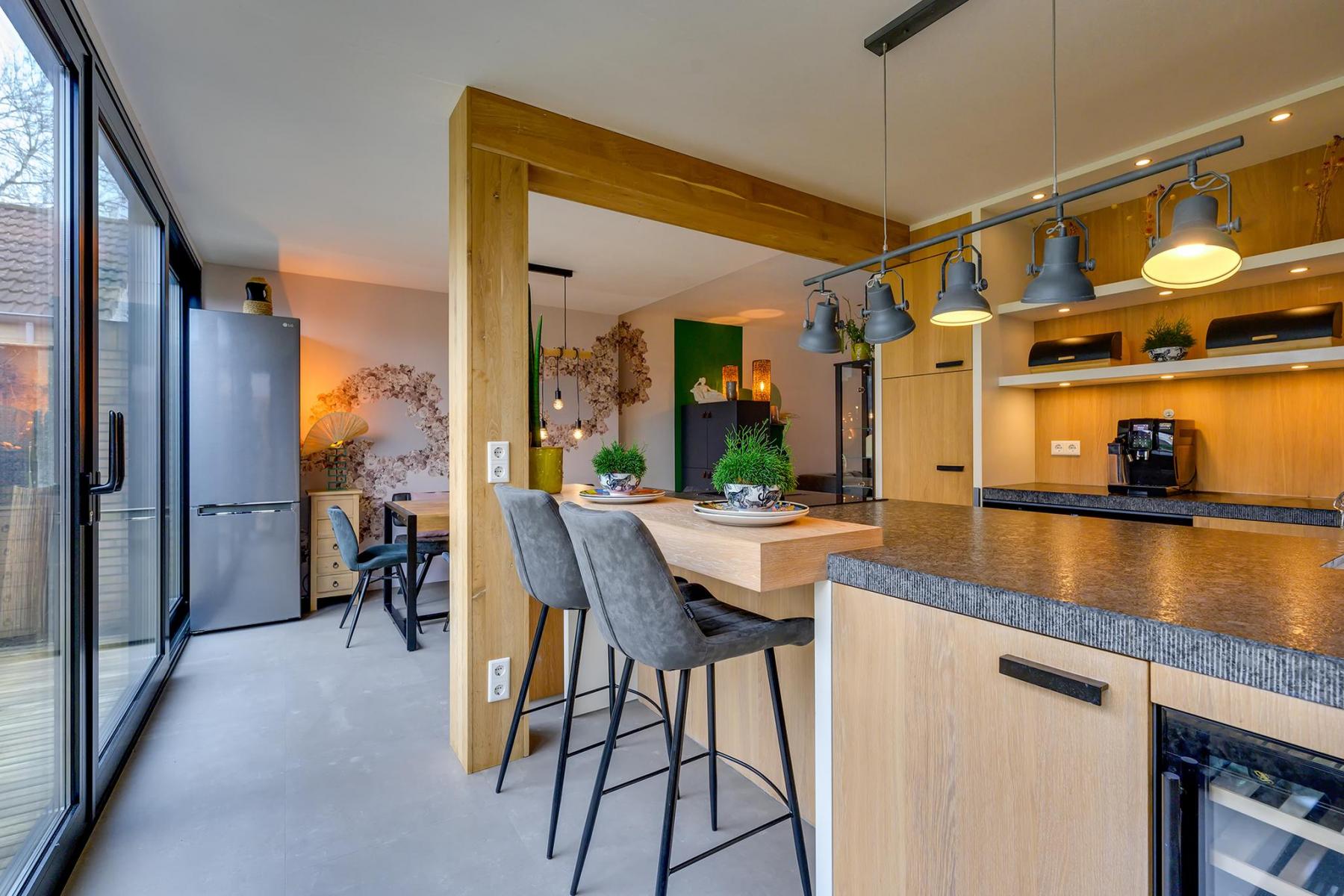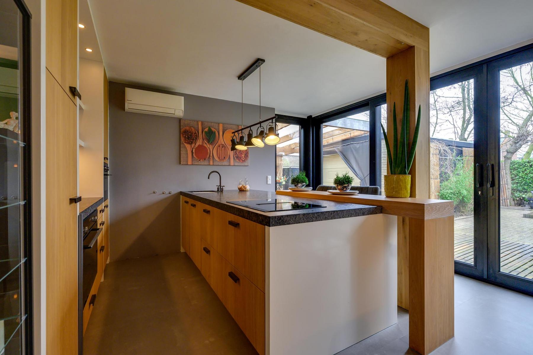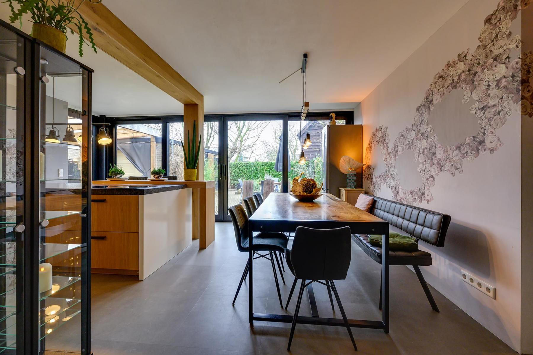 De luxe keuken en het eetgedeelte bevinden zich in de uitbouw. De keuken heeft een recht aanrechtblok, een spoel-/kookeiland en een bar. Qua apparatuur is de keuken voorzien van en close-in boiler, granieten aanrechtblad, spoelbak, inductie kookplaat met geïntegreerde afzuigkap, koelkast, grote oven, vaatwasser, combi-oven en wijnkast. Ook is hier airco aanwezig. Met voldoende plaats voor een grote eettafel en een schitterend uitzicht over de tuin, is dit een heerlijke ruimte in het huis!