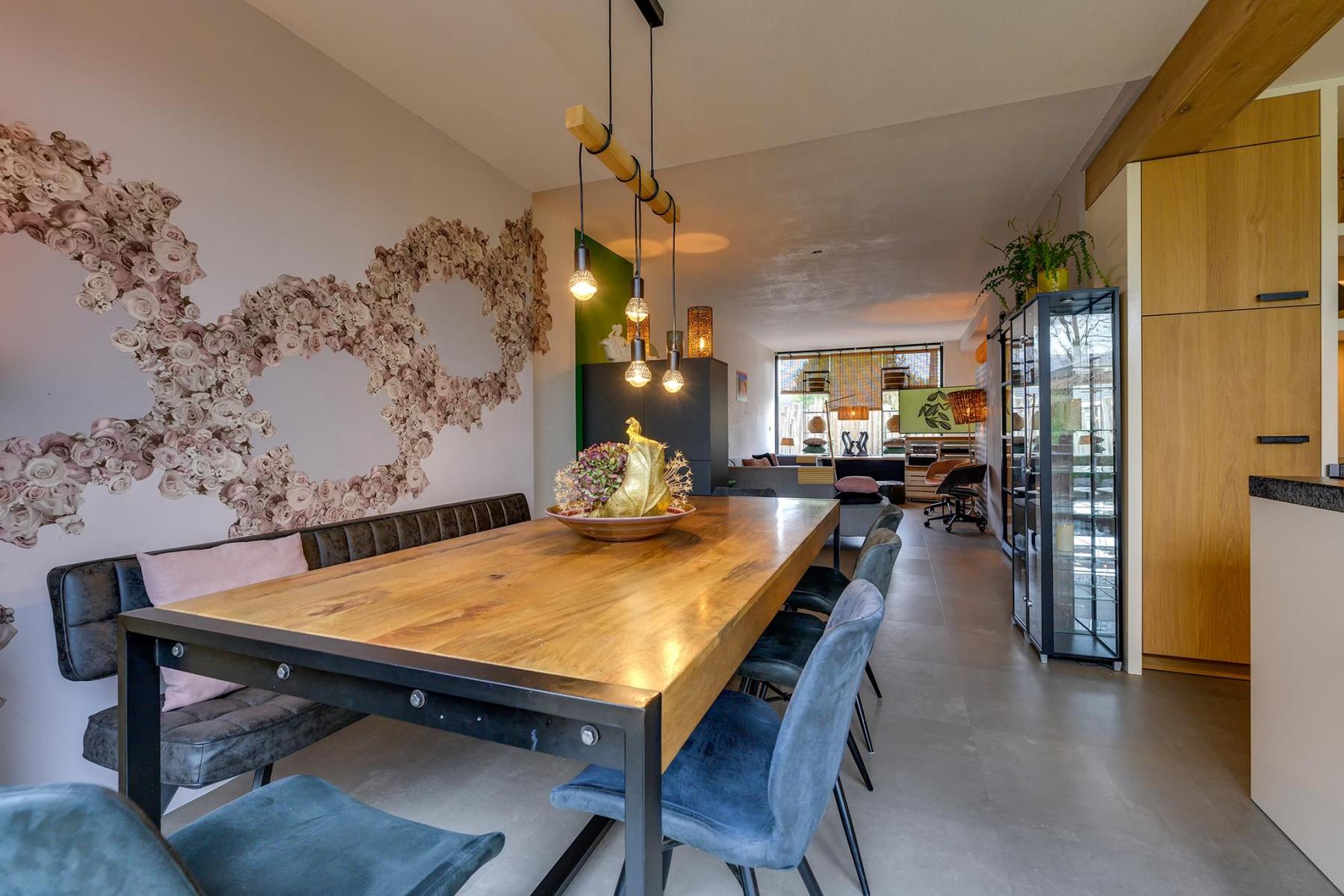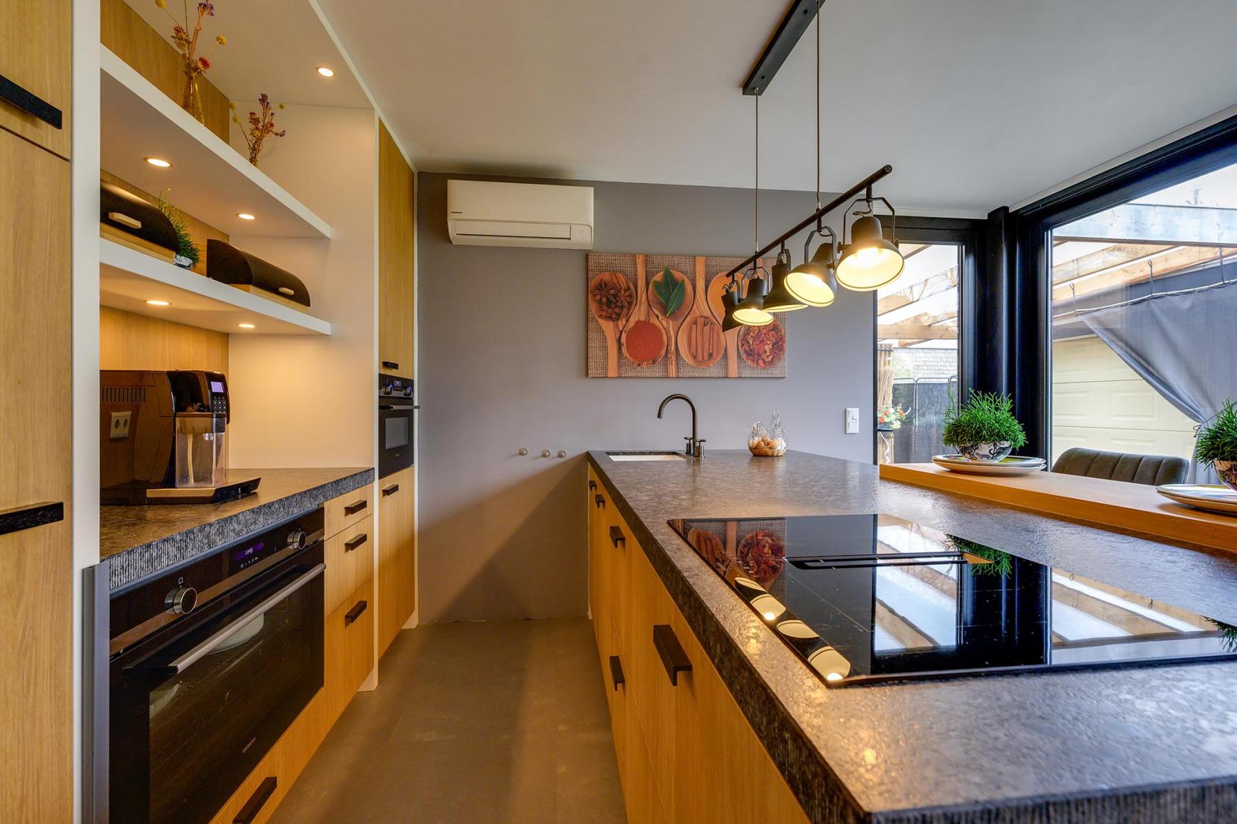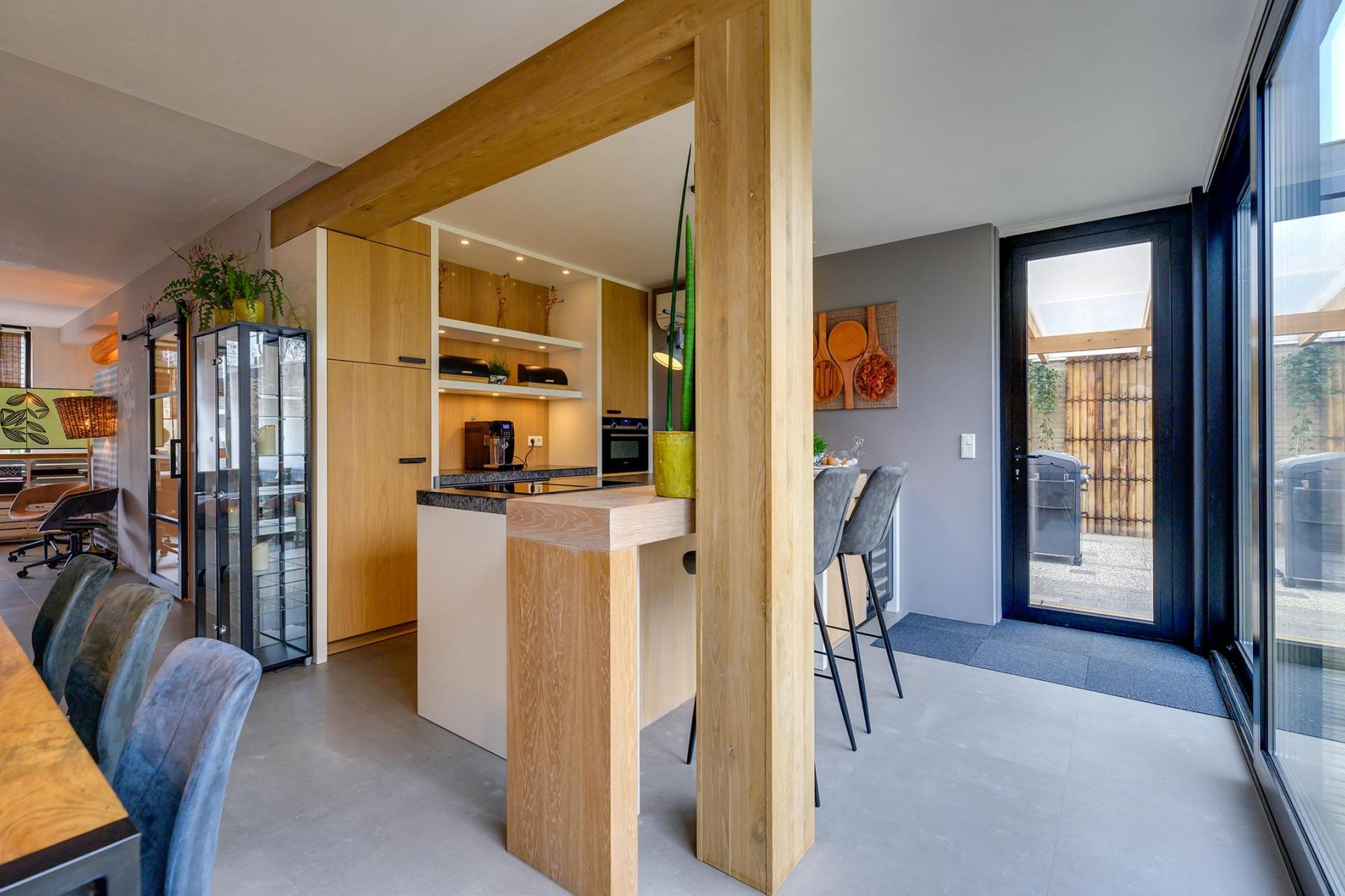 De luxe keuken en het eetgedeelte bevinden zich in de uitbouw. De keuken heeft een recht aanrechtblok, een spoel-/kookeiland en een bar. Qua apparatuur is de keuken voorzien van en close-in boiler, granieten aanrechtblad, spoelbak, inductie kookplaat met geïntegreerde afzuigkap, koelkast, grote oven, vaatwasser, combi-oven en wijnkast. Ook is hier airco aanwezig. Met voldoende plaats voor een grote eettafel en een schitterend uitzicht over de tuin, is dit een heerlijke ruimte in het huis!