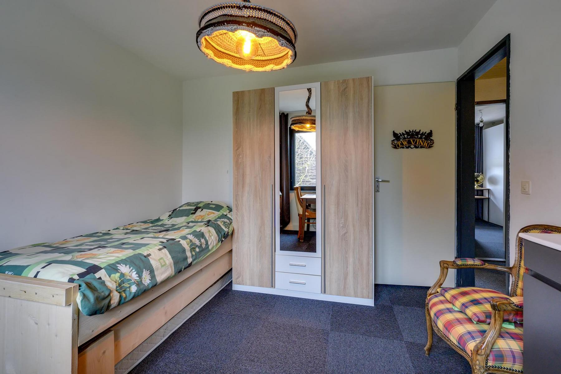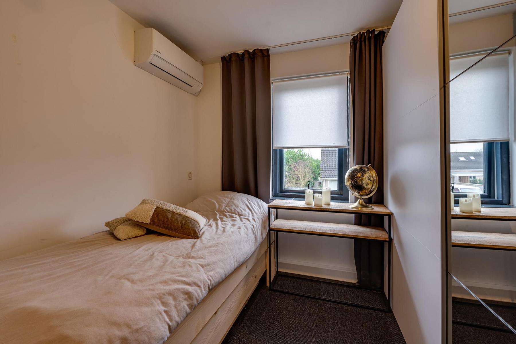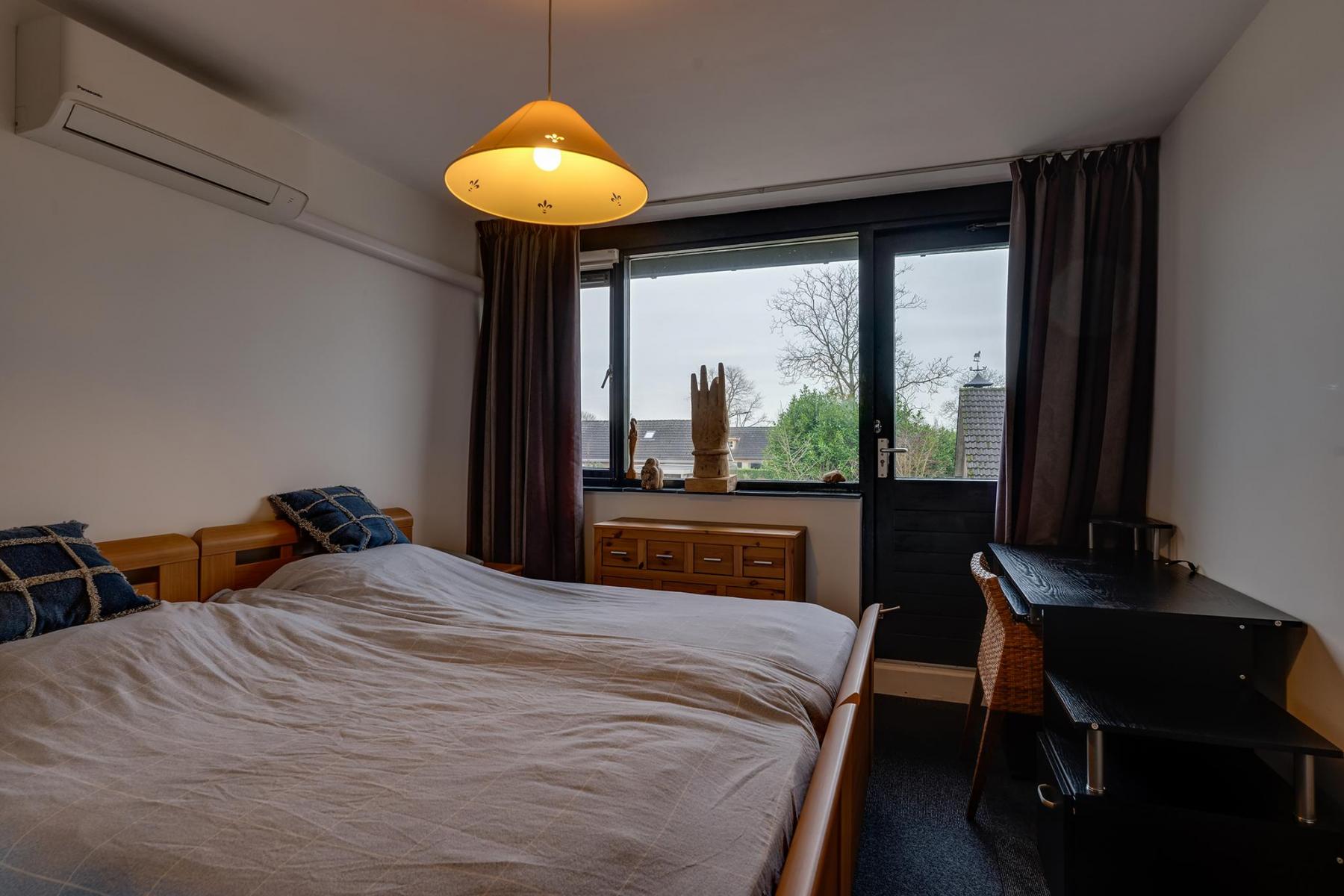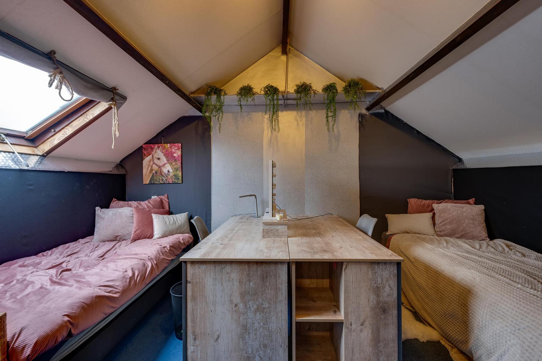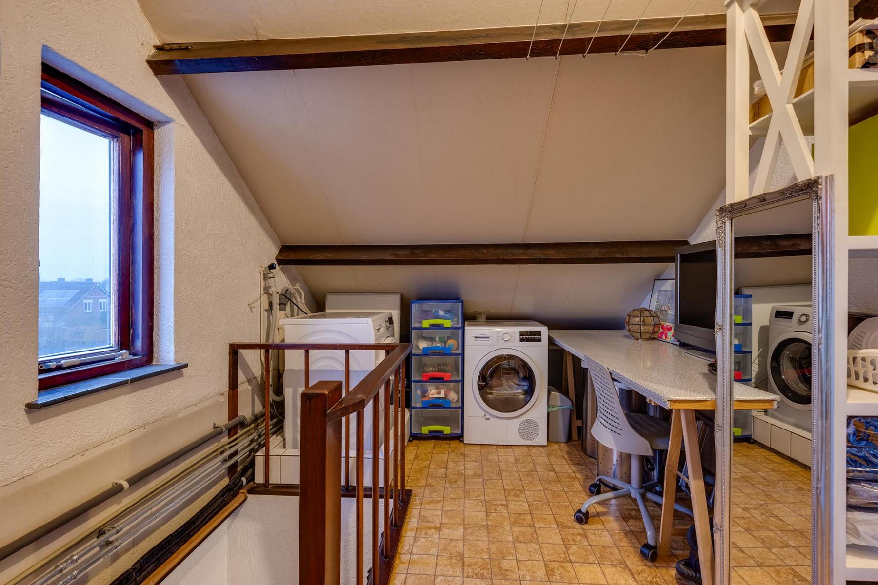 Via de vaste trap komt u op de overloop van de tweede verdieping. Hier bevinden zich de aansluitingen voor het witgoed, de hybryde CV- /warmtepompinstallatie en de warmteboiler. Daarnaast is er veel bergruimte gecreëerd. De slaapkamer op zolder is voorzien van een dakraam en veel bergruimte achter de knieschotten.