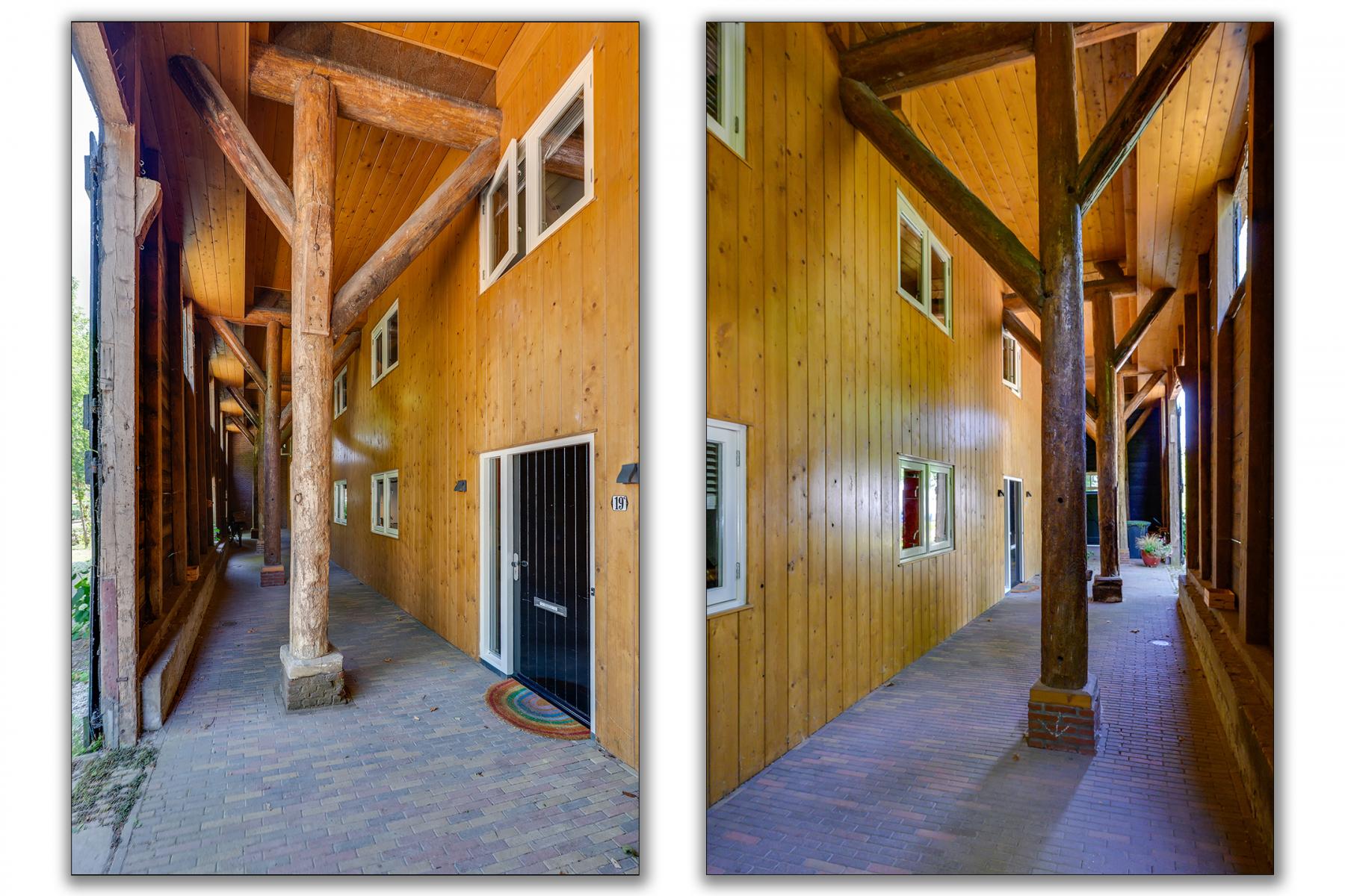 Vanaf de weg is de semi openbare arcade (galerij) bereikbaar die toegang geeft tot de woningen. In deze arcade zijn de spanten en gebinten nadrukkelijk aanwezig. Via deze galerij kom je binnen in de ruime ontvangsthal met meterkast en toiletruimte. De hal is voorzien van een betegelde vloer met vloerverwarming en als je verder loopt bereik je de eetkamer, keuken en woonkamer. De toiletruimte is voorzien van een hangend toilet en fonteintje.