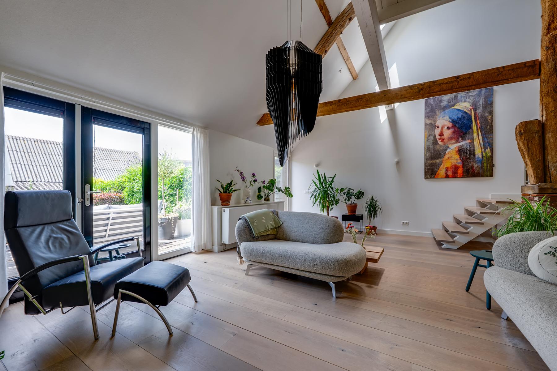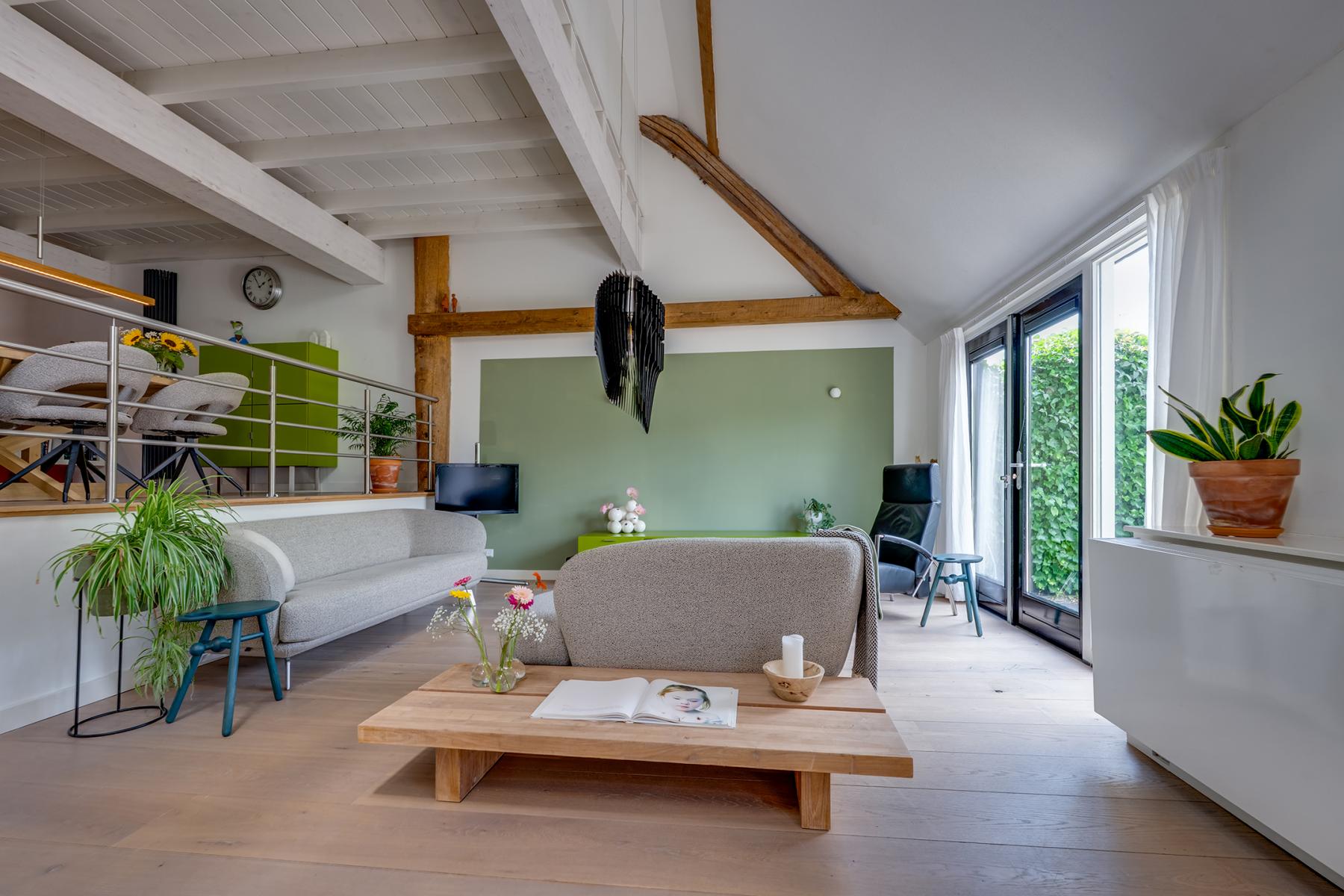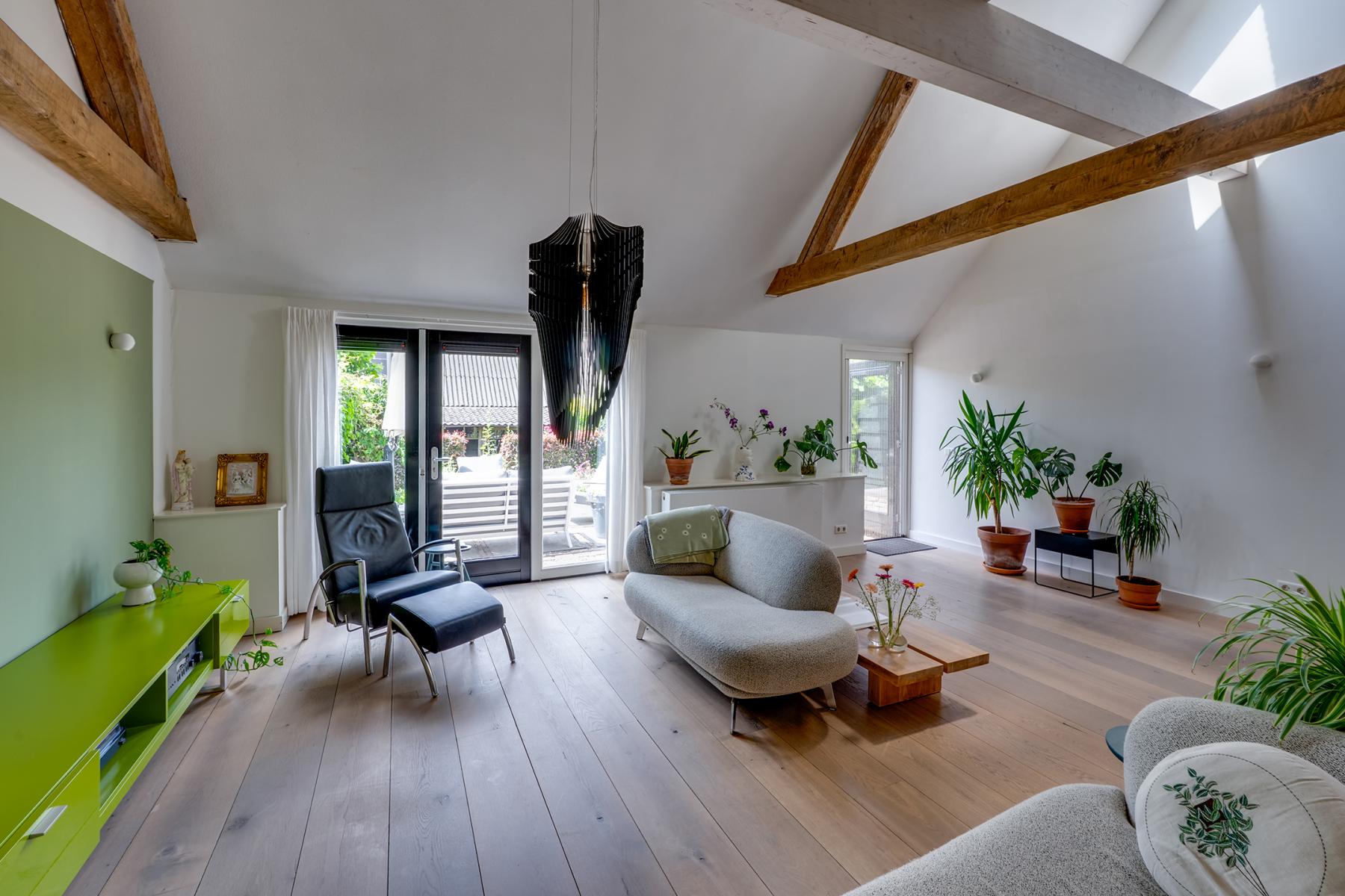 De modern ingerichte en sfeervolle woonkamer is een niveau lager gelegen. Deze ruimte is voorzien van massief eiken vloerdelen. De tuin, welke te bereiken is via de openslaande deuren, is als het ware een verlengstuk van de woonkamer. De keuken en woonkamer zijn prachtig met strak afgewerkte wanden en houten gebinten.
