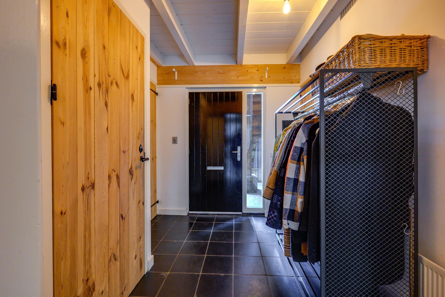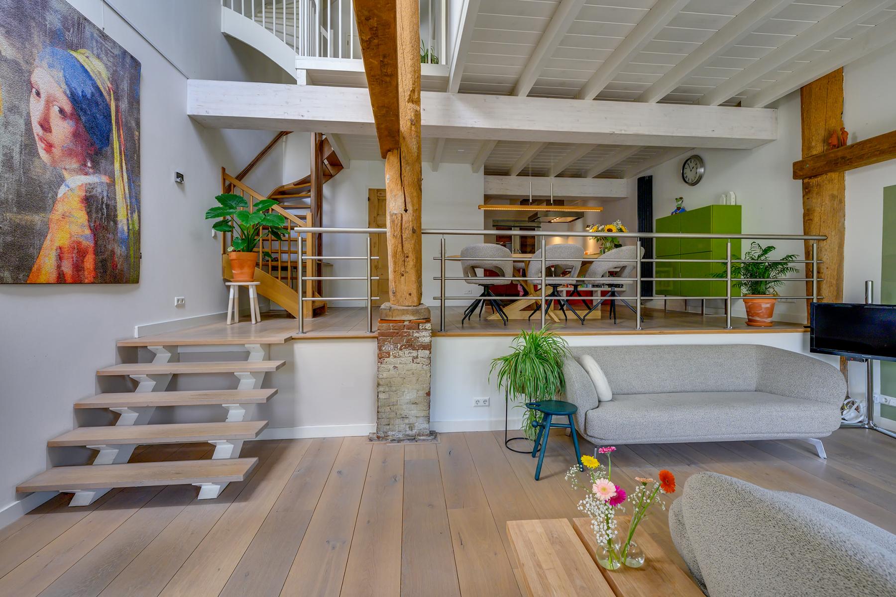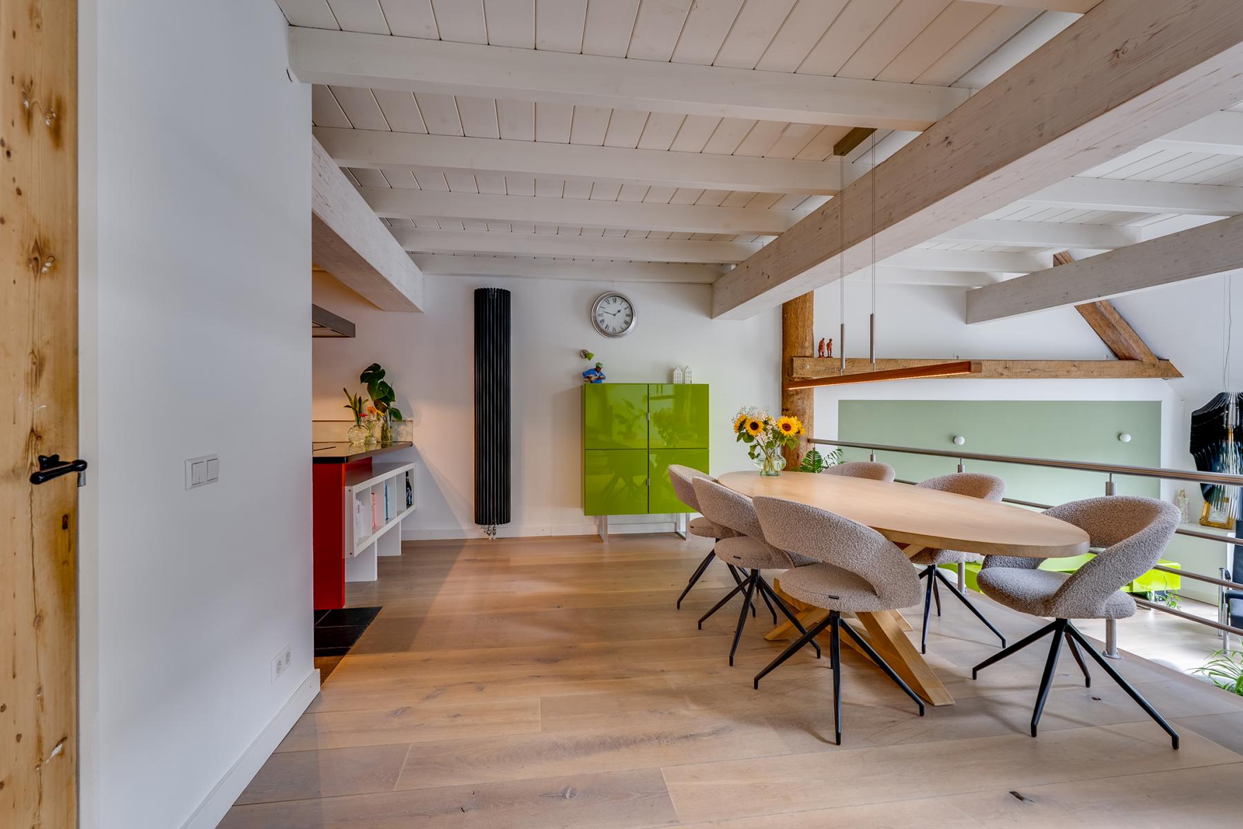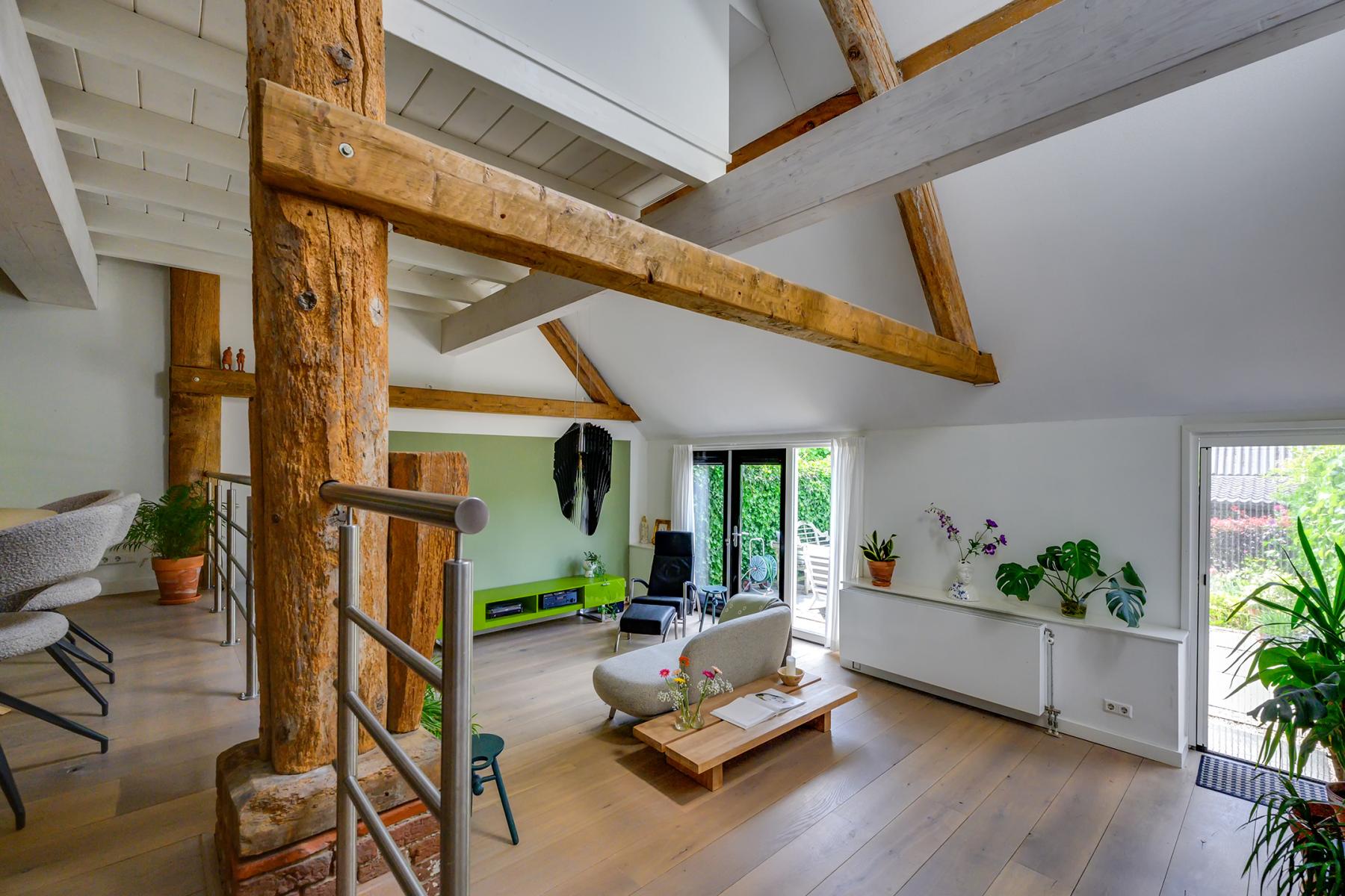 De modern ingerichte en sfeervolle woonkamer is een niveau lager gelegen. Deze ruimte is voorzien van massief eiken vloerdelen. De tuin, welke te bereiken is via de openslaande deuren, is als het ware een verlengstuk van de woonkamer. De keuken en woonkamer zijn prachtig met strak afgewerkte wanden en houten gebinten.