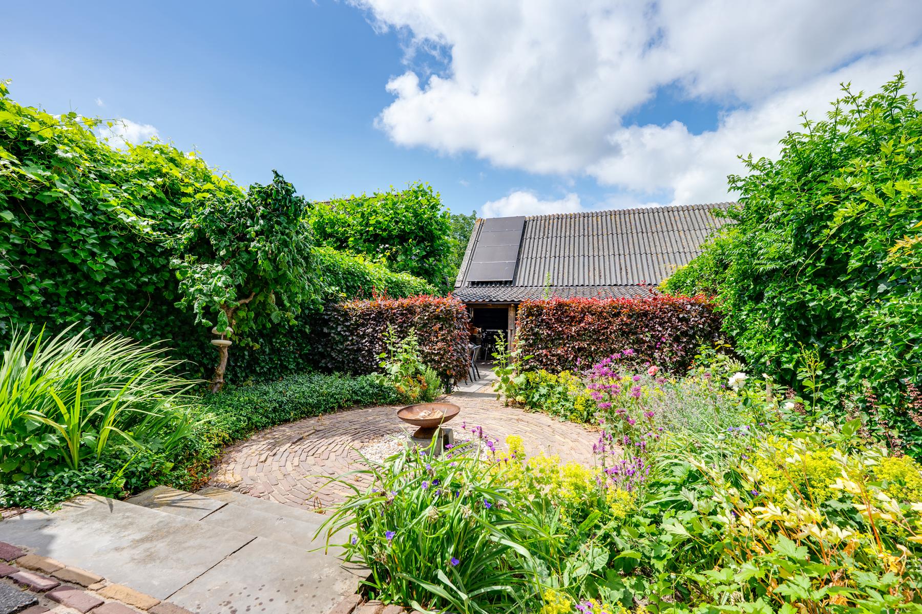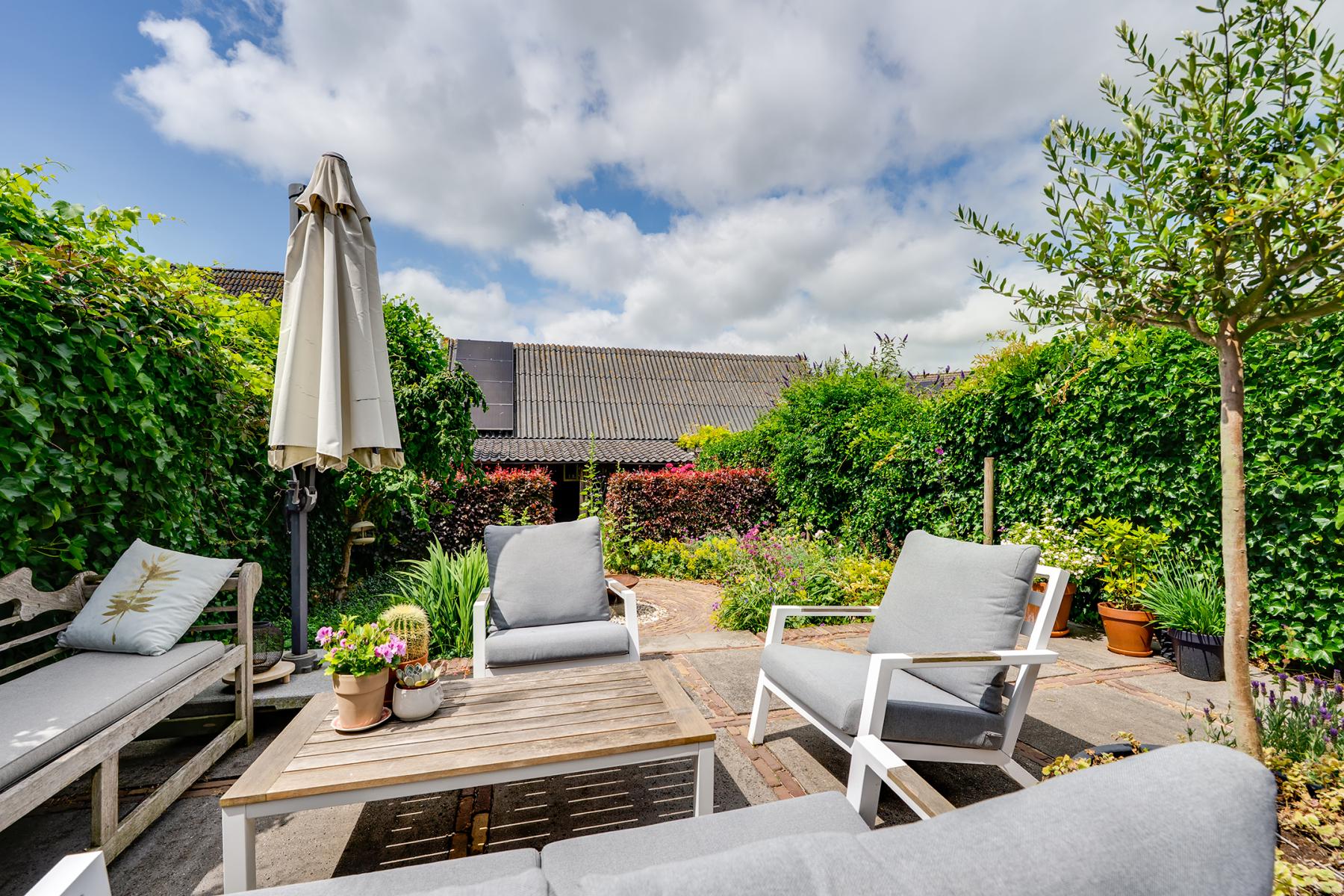 De fraai aangelegde en groene achtertuin is gelegen op het westen. Wat een genot is het om hier te zijn! Via de achterdeur of via de openslaande tuindeuren kom je in de met hedera omsloten zonnige tuin. De tuin is voorzien van een bestraat terras, sierbestrating en achterin de tuin een overkapping, welke toegang geeft tot de berging met zolder. De berging is voorzien van elektra en water. Voorstander van zonnepanelen? Deze kunnen op het dag van de berging geplaatst worden. Via een poort heb je toegang tot het gezamenlijke erf met een ruim aantal parkeerplaatsen en een opstelplaats voor de afvalcontainers.