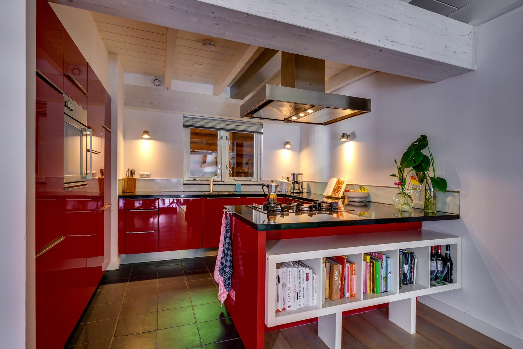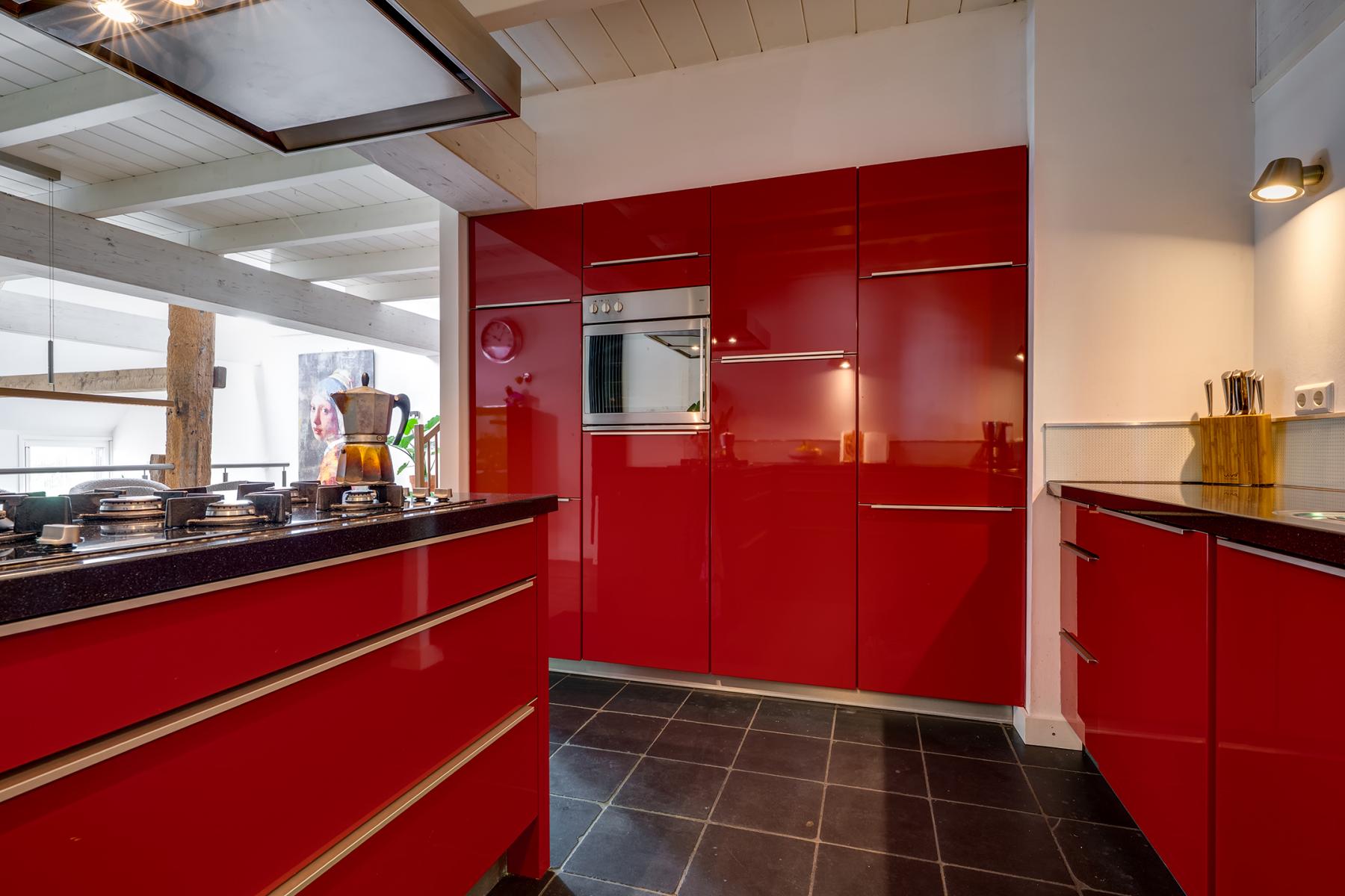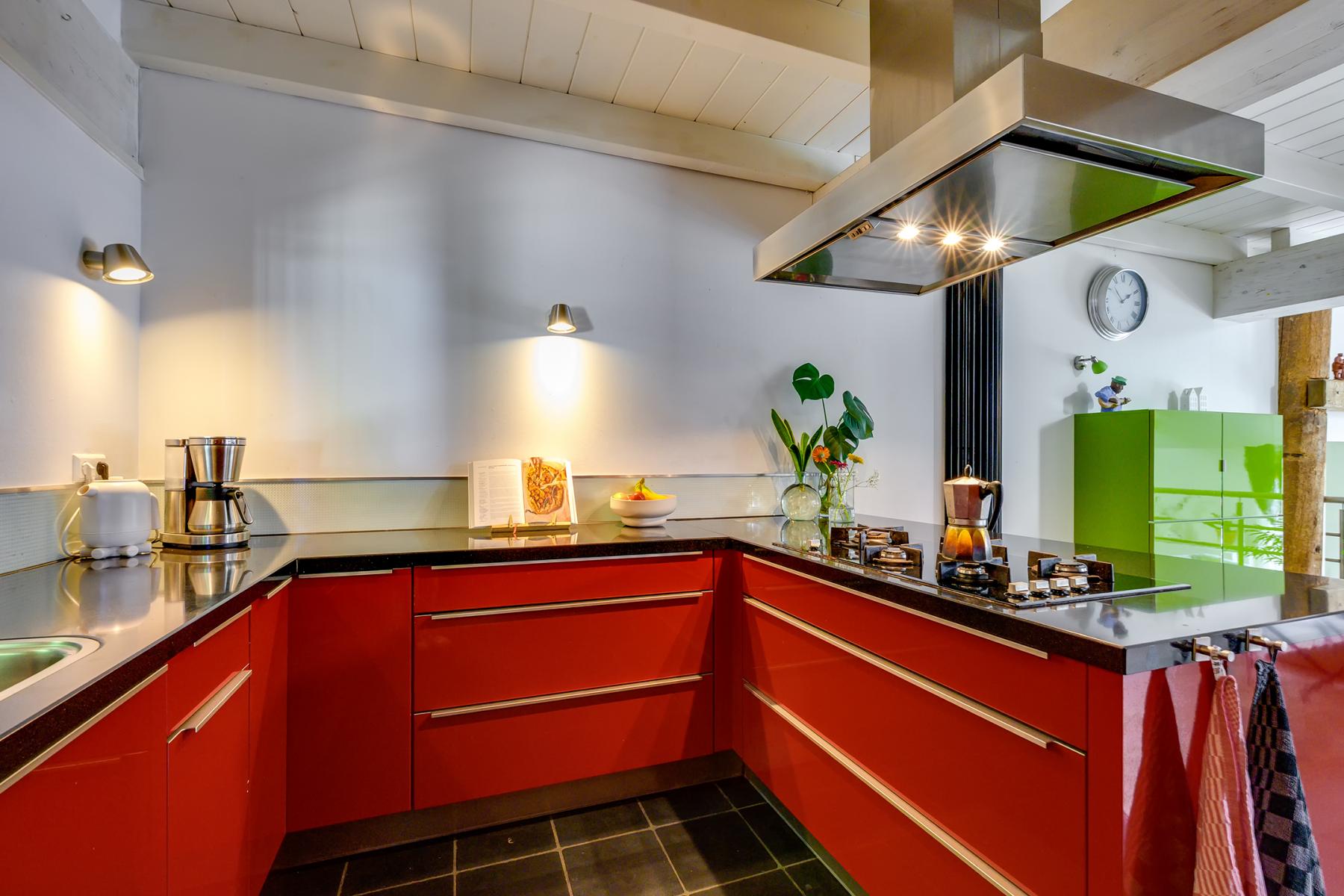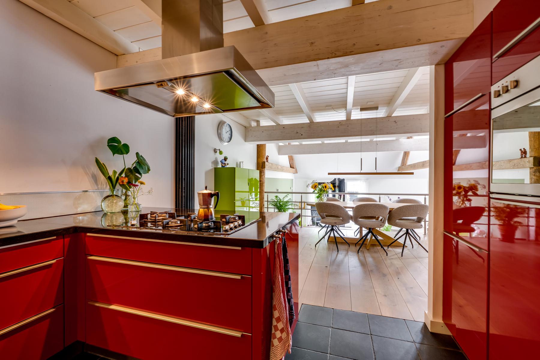 De fijne leefkeuken is voorzien van een antracietgrijze betegelde vloer (met vloerverwarming). De opvallende keuken, uitgevoerd in een hoogglans rode kleurstelling met composiet aanrechtblad, staat in hoekopstelling met een schiereiland met o.a. veel kastruimte. De keuken beschikt qua apparatuur over een 5-pits gasstel en afzuigkap, carrouselkast, 1,5 spoelbak, vaatwasser, koelkast, vriezer en oven. In de eetkamer bevindt zich een open houten trap naar de eerste verdieping.