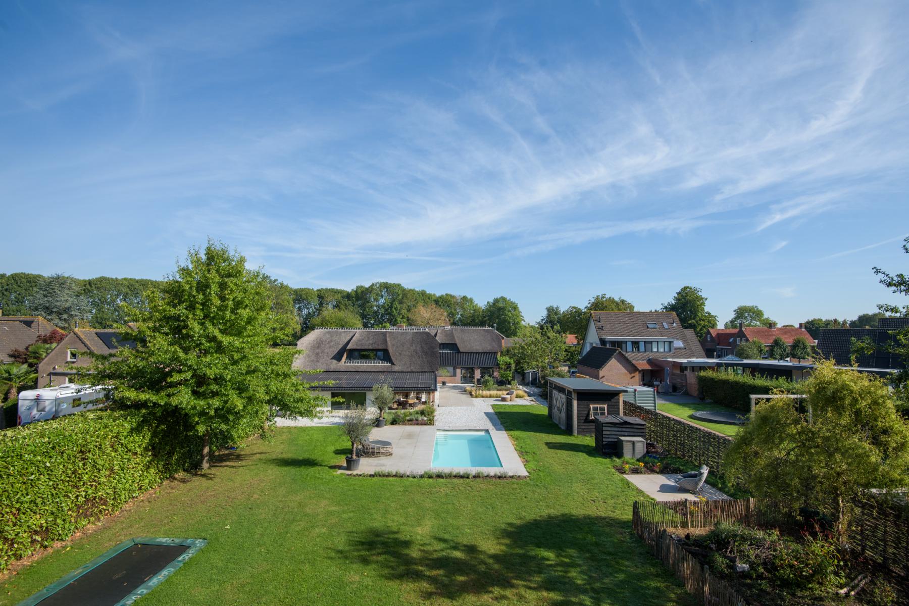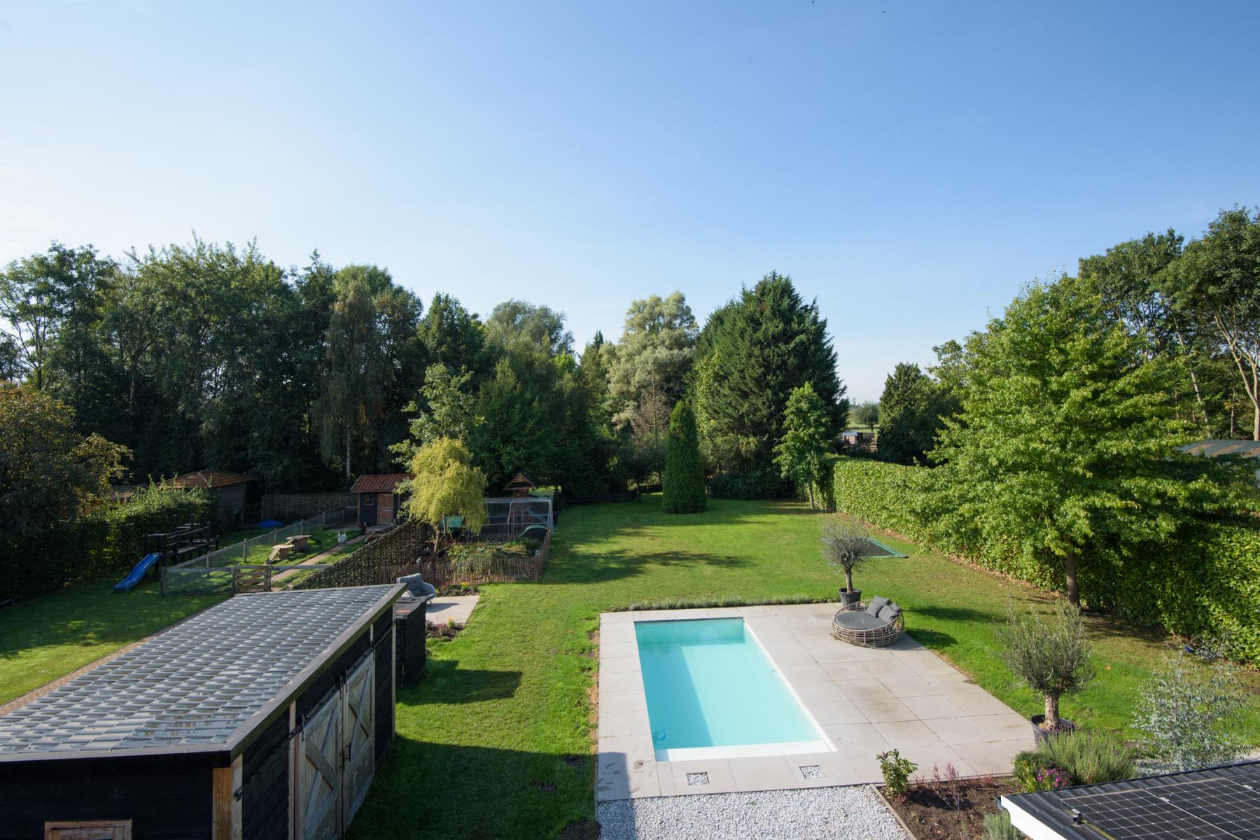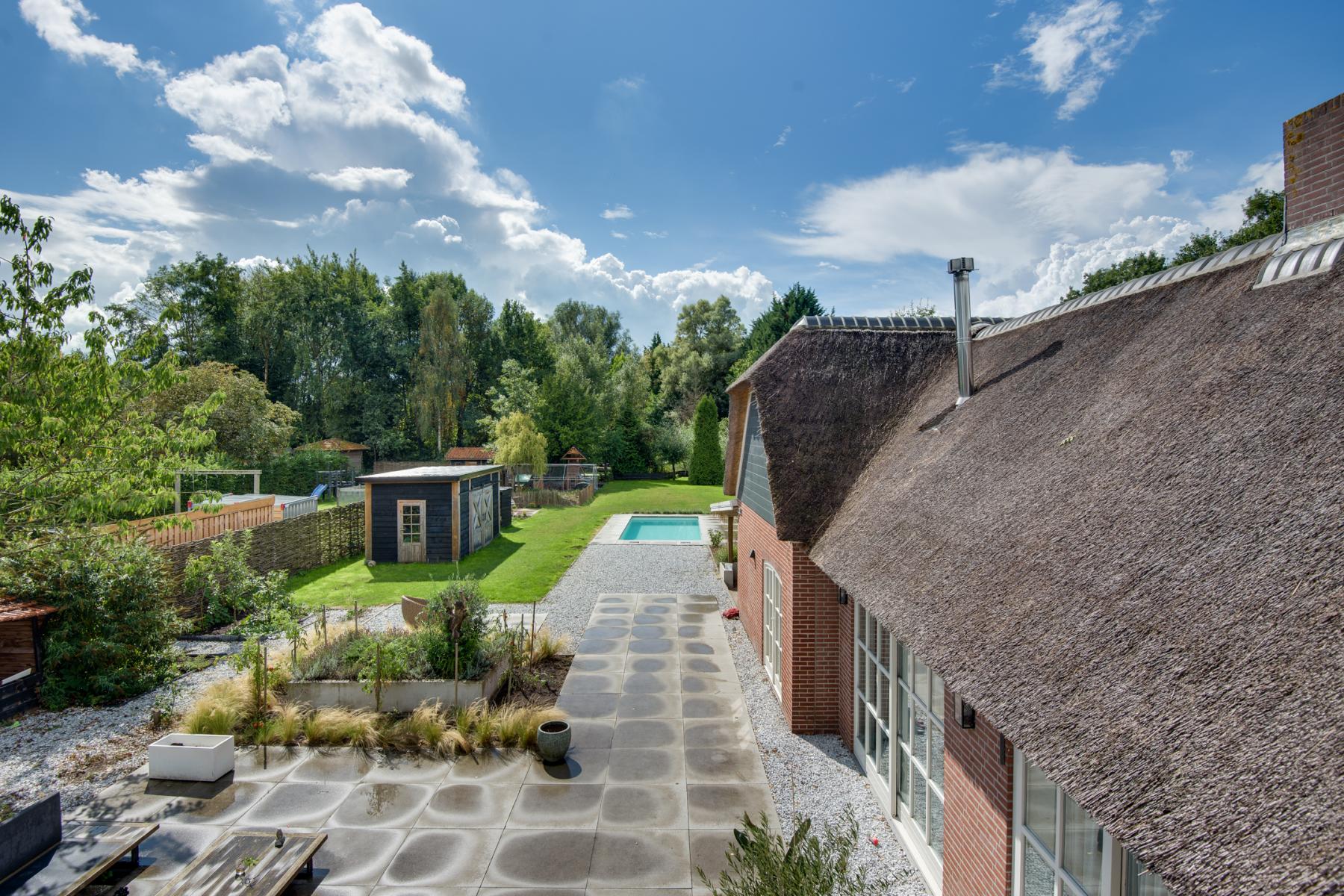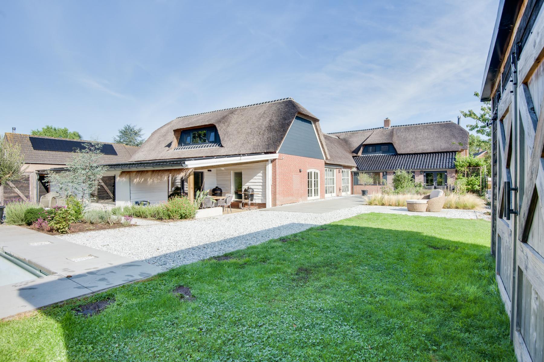De tuin rondom het huis is werkelijk een oase van rust. Goed onderhouden, voorzien van grote vrijstaande bijpassende berging, speels aangelegd en vol verrassende plekjes om te zitten, spelen of wandelen. Er zijn terrassen bij het huis, een overkapping, een verwarmd zwembad met warmtepomp, maar ook een natuurvijver met diverse wandelpaadjes; perfect voor zonnige dagen. U kunt zelfs een wandeling in uw eigen bos maken! Ook paarden (of andere dieren) liefhebbers kunnen hier terecht. De paarden kun je ruimschoots van een eigen plek voorzien. Vanuit het achterste stuk tuin heeft u in het voorjaar en in de zomer zicht op broedende ooievaars.
