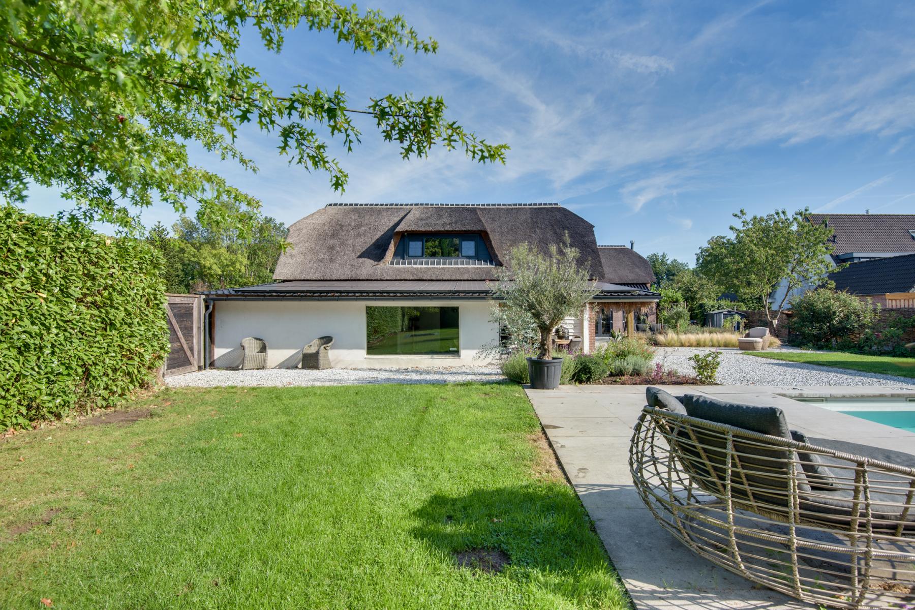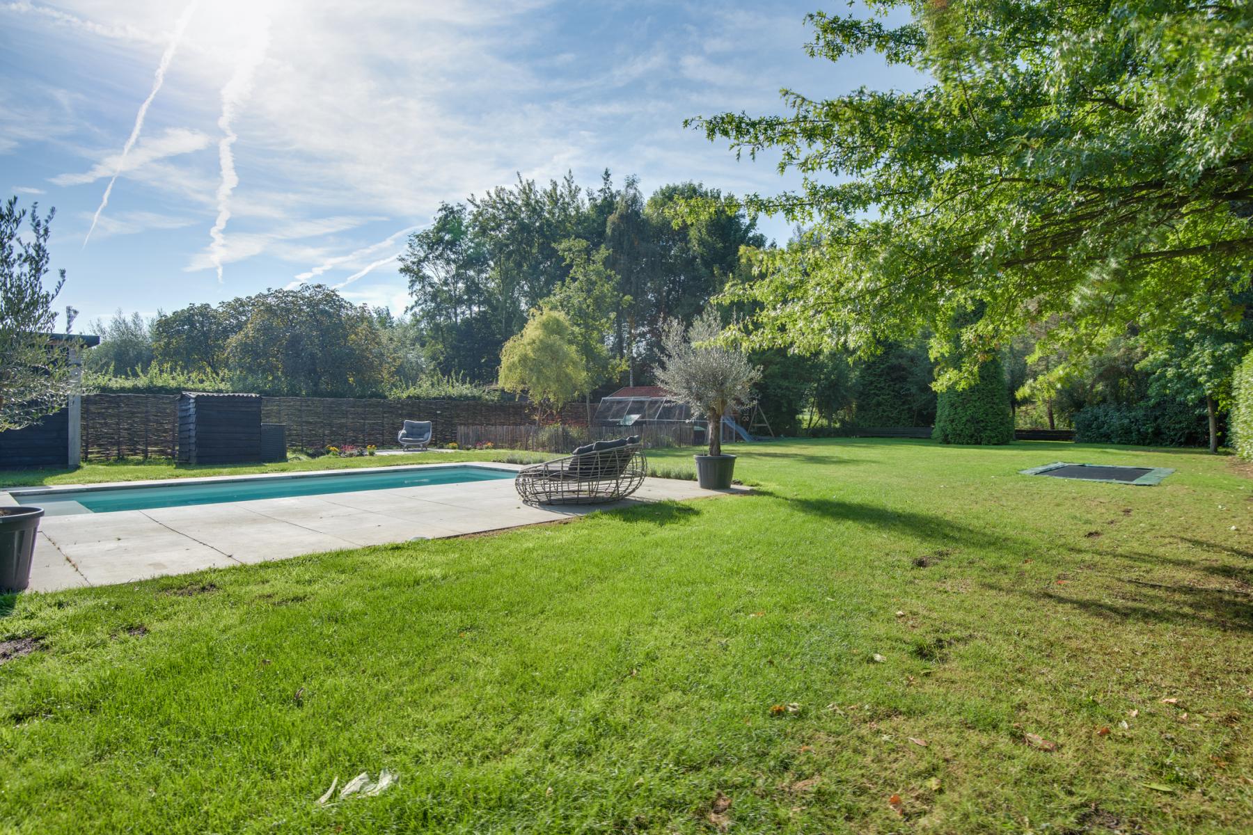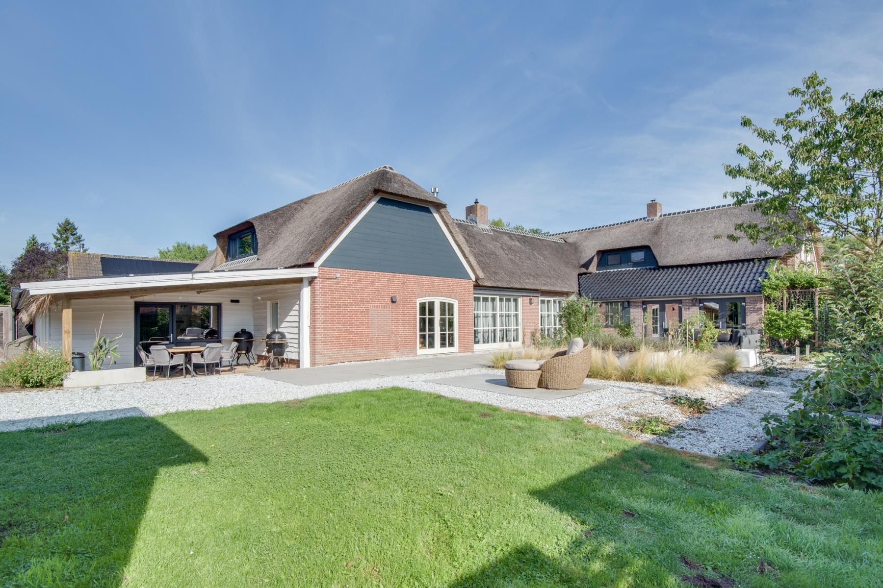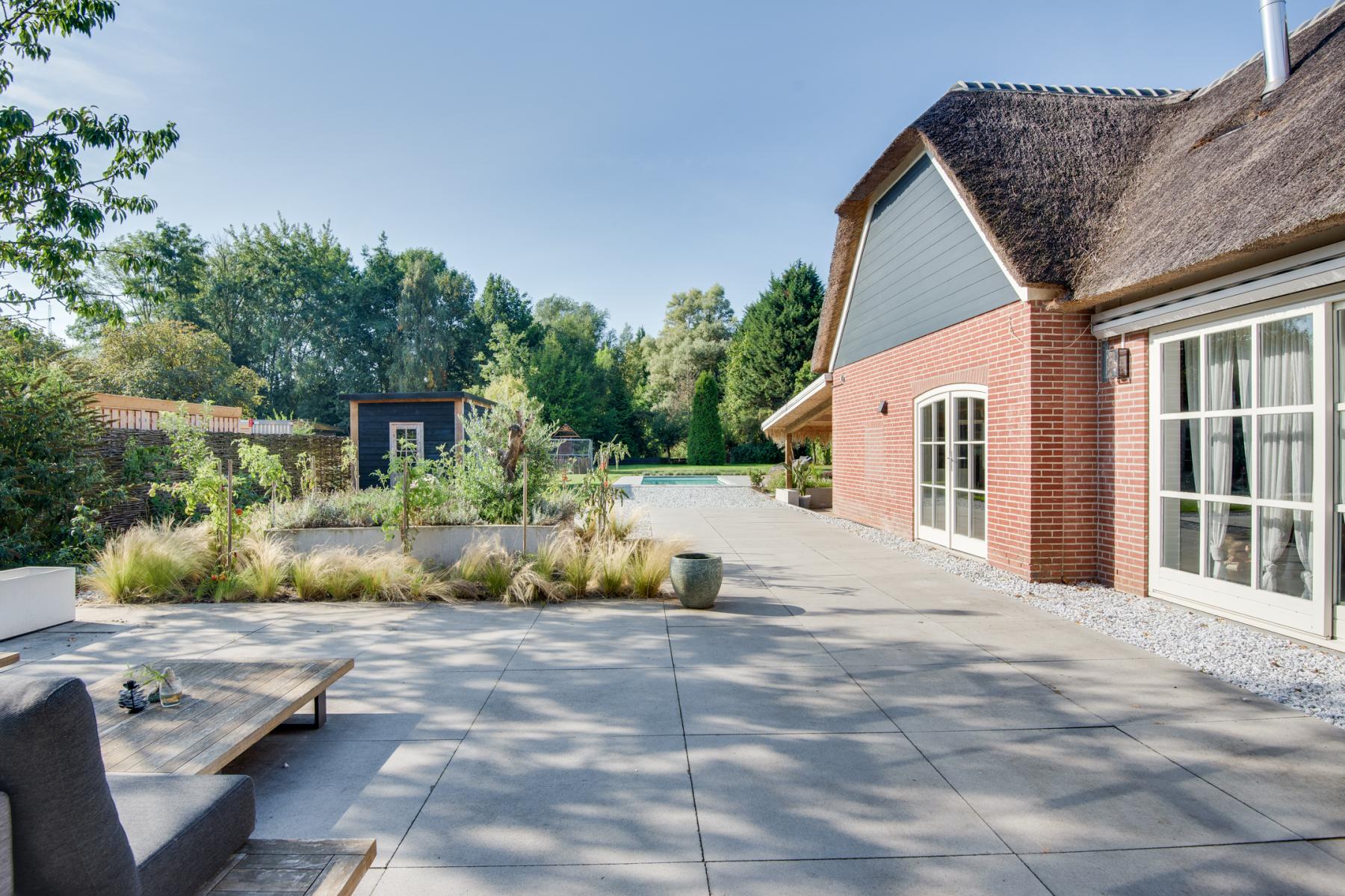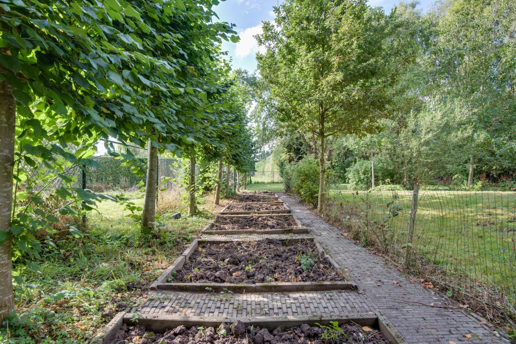 De tuin rondom het huis is werkelijk een oase van rust. Goed onderhouden, voorzien van grote vrijstaande bijpassende berging, speels aangelegd en vol verrassende plekjes om te zitten, spelen of wandelen. Er zijn terrassen bij het huis, een overkapping, een verwarmd zwembad met warmtepomp, maar ook een natuurvijver met diverse wandelpaadjes; perfect voor zonnige dagen. U kunt zelfs een wandeling in uw eigen bos maken! Ook paarden (of andere dieren) liefhebbers kunnen hier terecht. De paarden kun je ruimschoots van een eigen plek voorzien. Vanuit het achterste stuk tuin heeft u in het voorjaar en in de zomer zicht op broedende ooievaars.