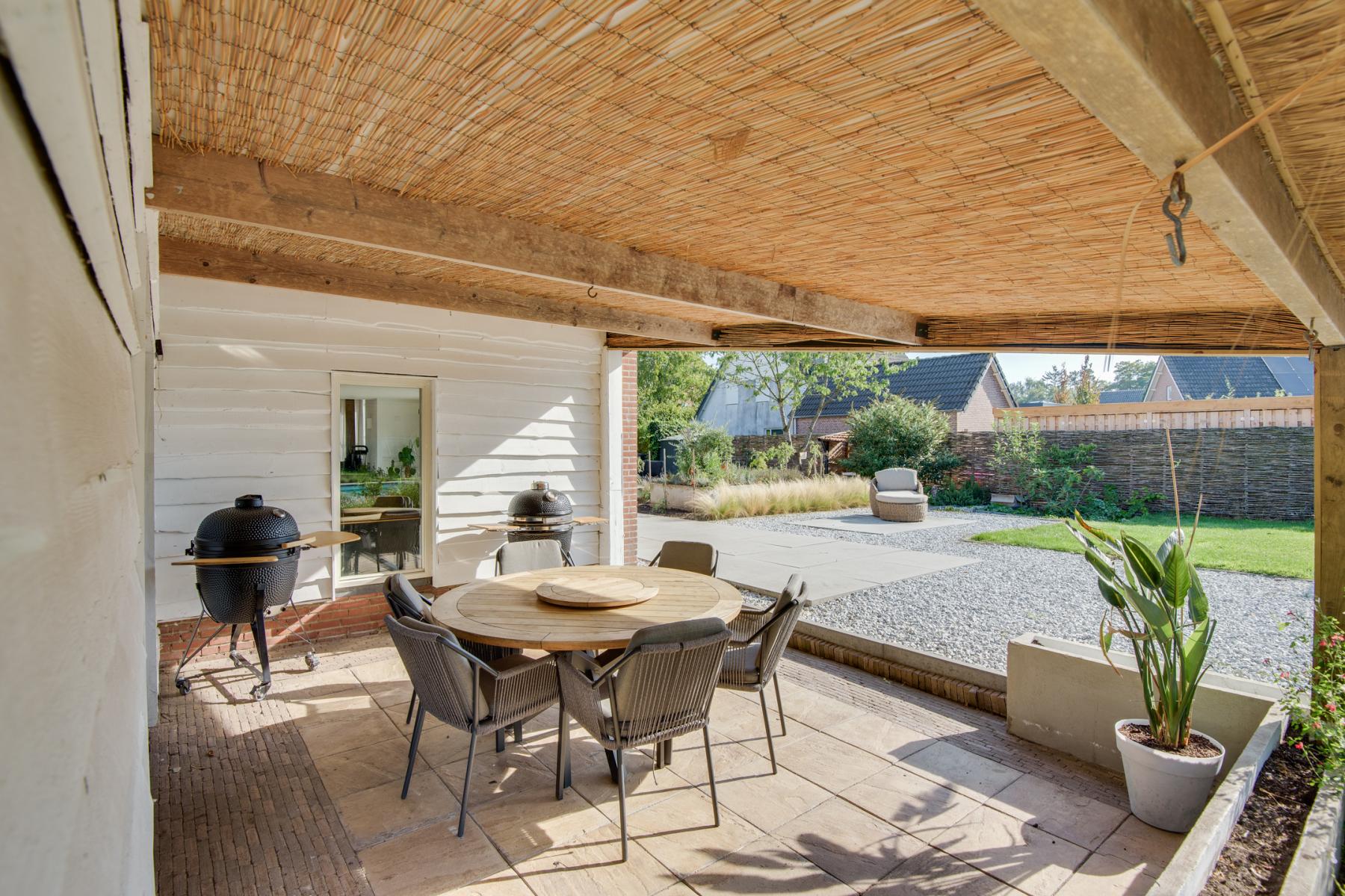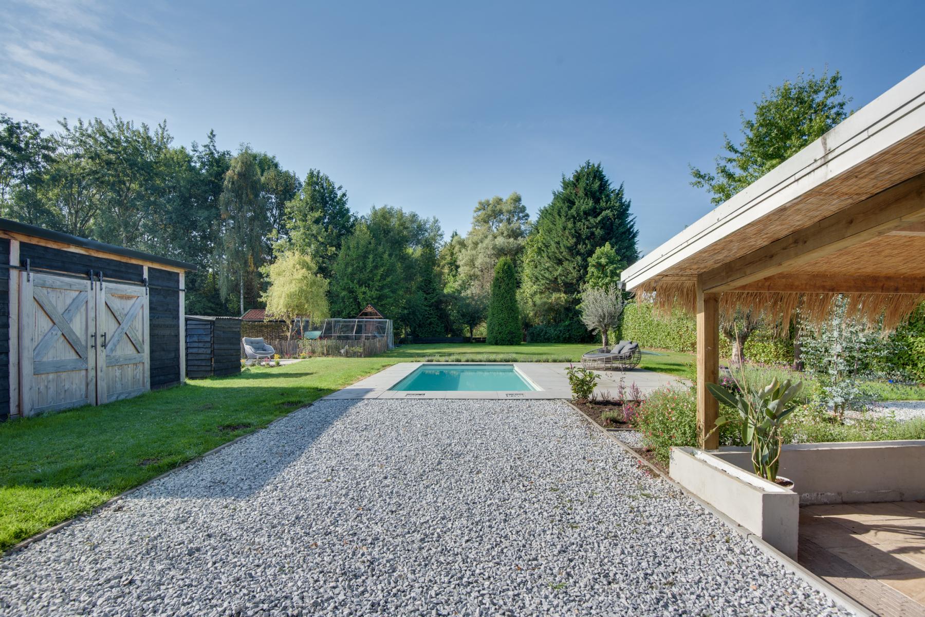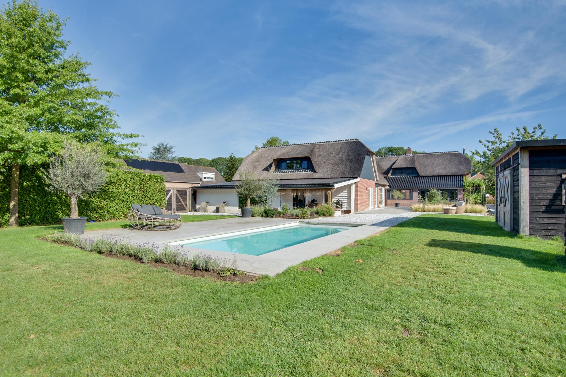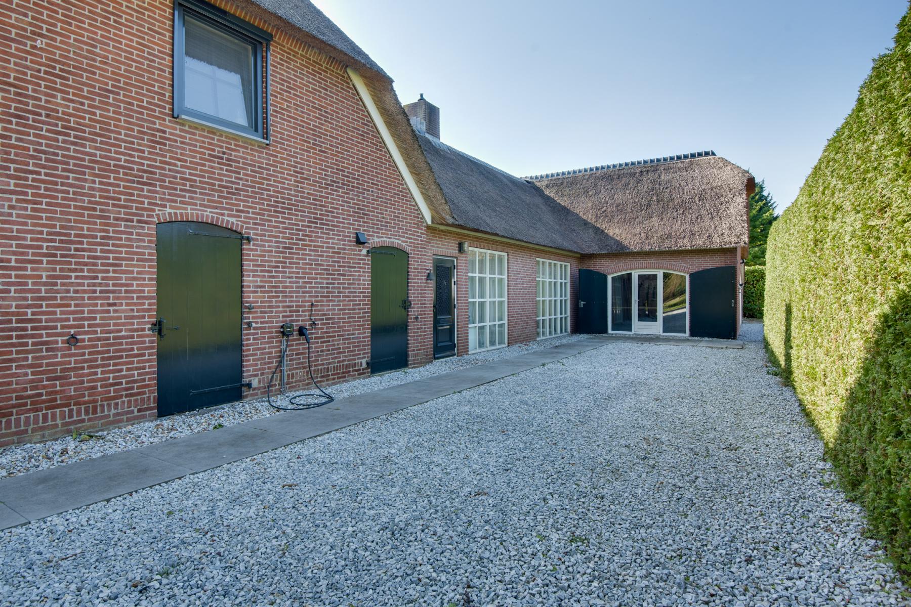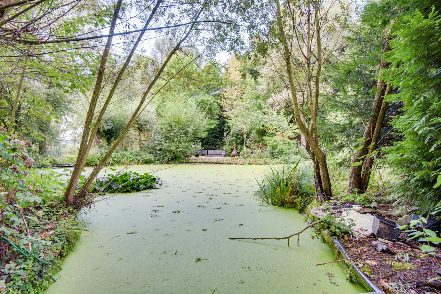 De tuin rondom het huis is werkelijk een oase van rust. Goed onderhouden, voorzien van grote vrijstaande bijpassende berging, speels aangelegd en vol verrassende plekjes om te zitten, spelen of wandelen. Er zijn terrassen bij het huis, een overkapping, een verwarmd zwembad met warmtepomp, maar ook een natuurvijver met diverse wandelpaadjes; perfect voor zonnige dagen. U kunt zelfs een wandeling in uw eigen bos maken! Ook paarden (of andere dieren) liefhebbers kunnen hier terecht. De paarden kun je ruimschoots van een eigen plek voorzien. Vanuit het achterste stuk tuin heeft u in het voorjaar en in de zomer zicht op broedende ooievaars.