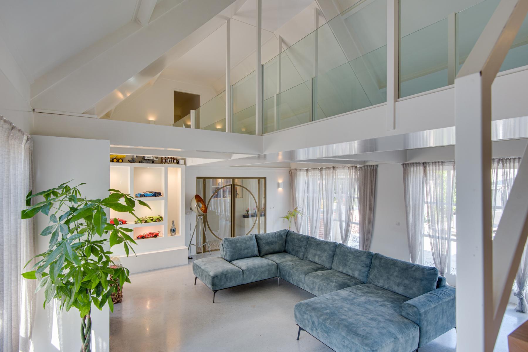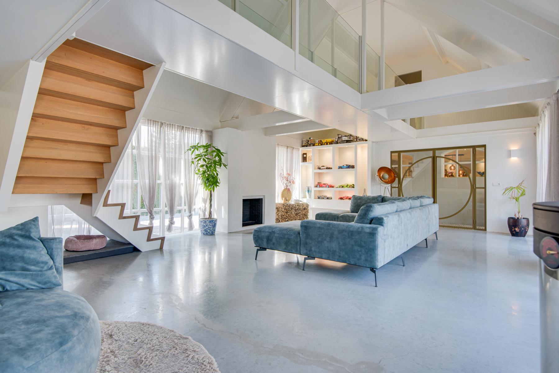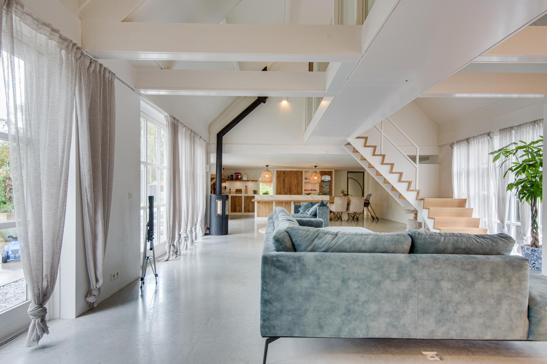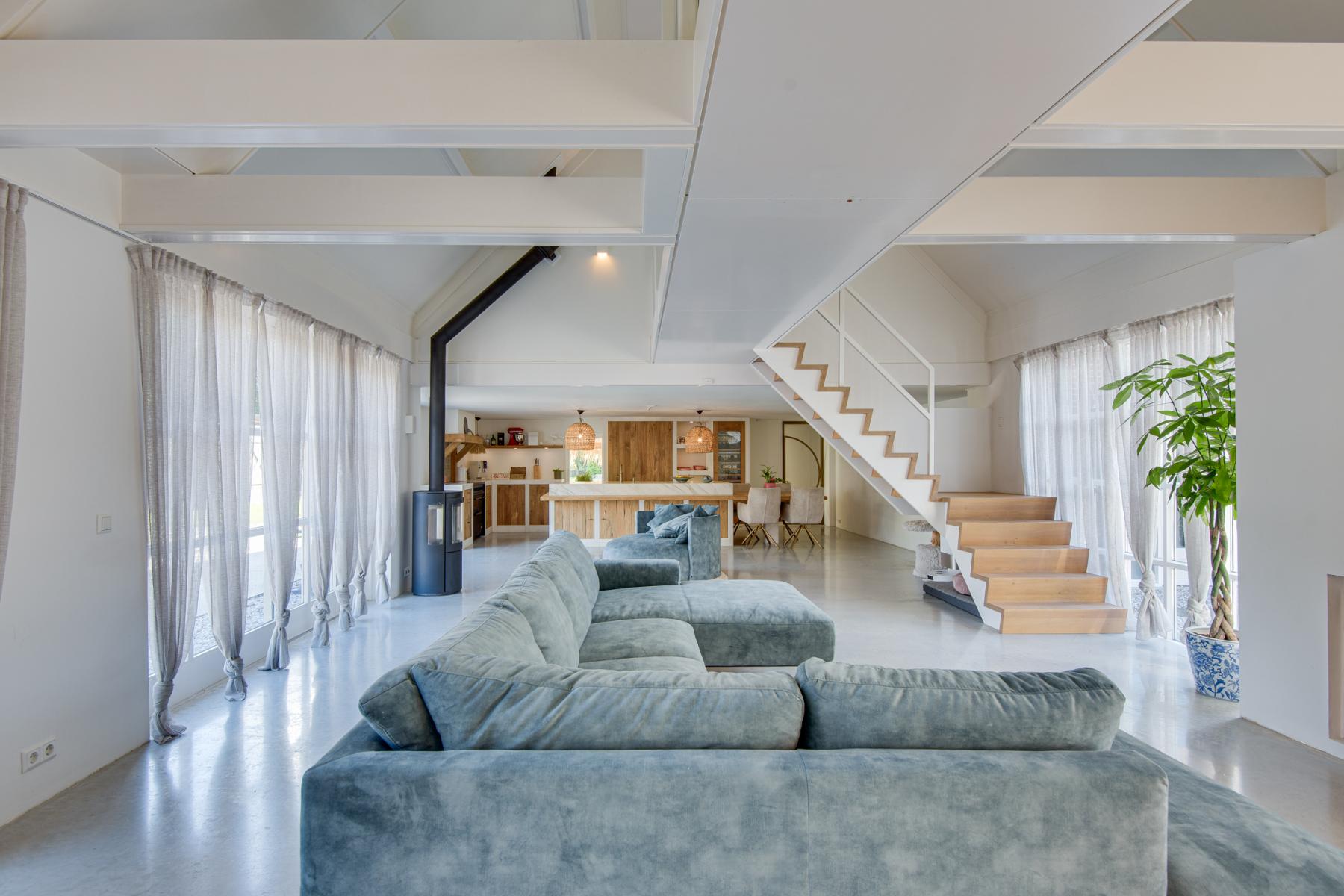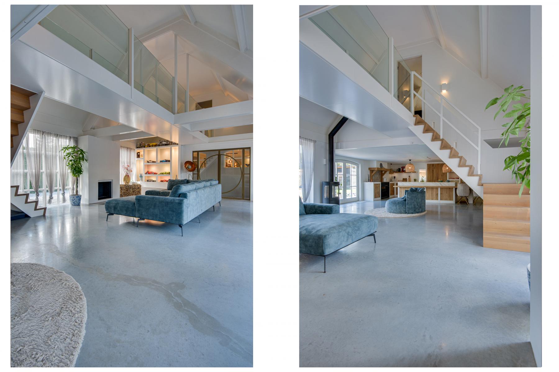 Wanneer u via de prachtige stalen deur de zeer ruime, lichte en open living instapt voelt u direct de charme van deze heerlijke ruimte die is voorzien van een woonbetonvloer met vloerverwarming, houtkachel, gestuukte wanden, vaste (volledig op maat gemaakte) houten trap, 2 schuifpuien en nog 2 grote raampartijen die samen zorgen dat dit een prachtig lichte ruimte is. Ook ziet u de strak gestuukte schouw. Maar de ware eyecatcher van deze ruimte vindt u boven uw hoofd waar een prachtige loopbrug is gesitueerd.