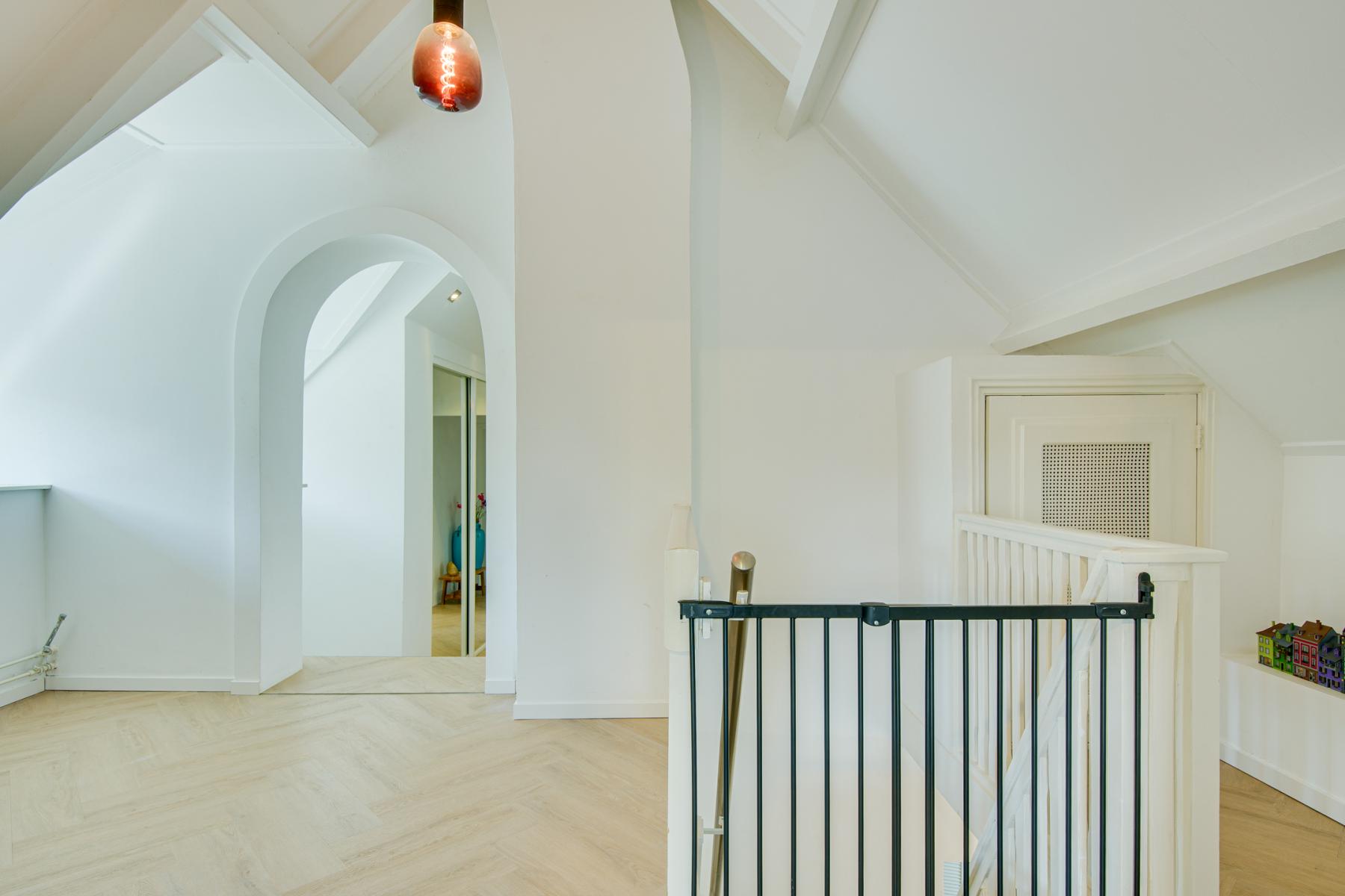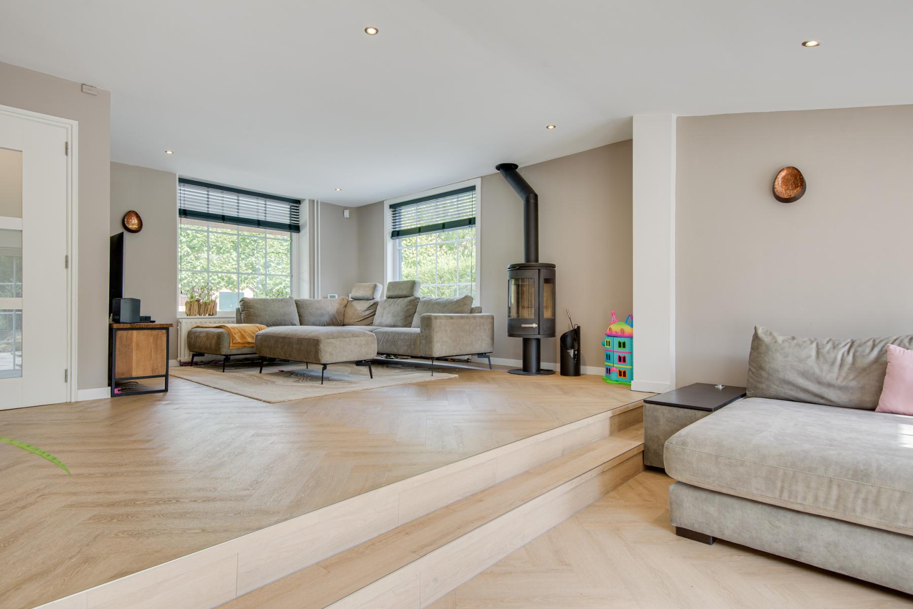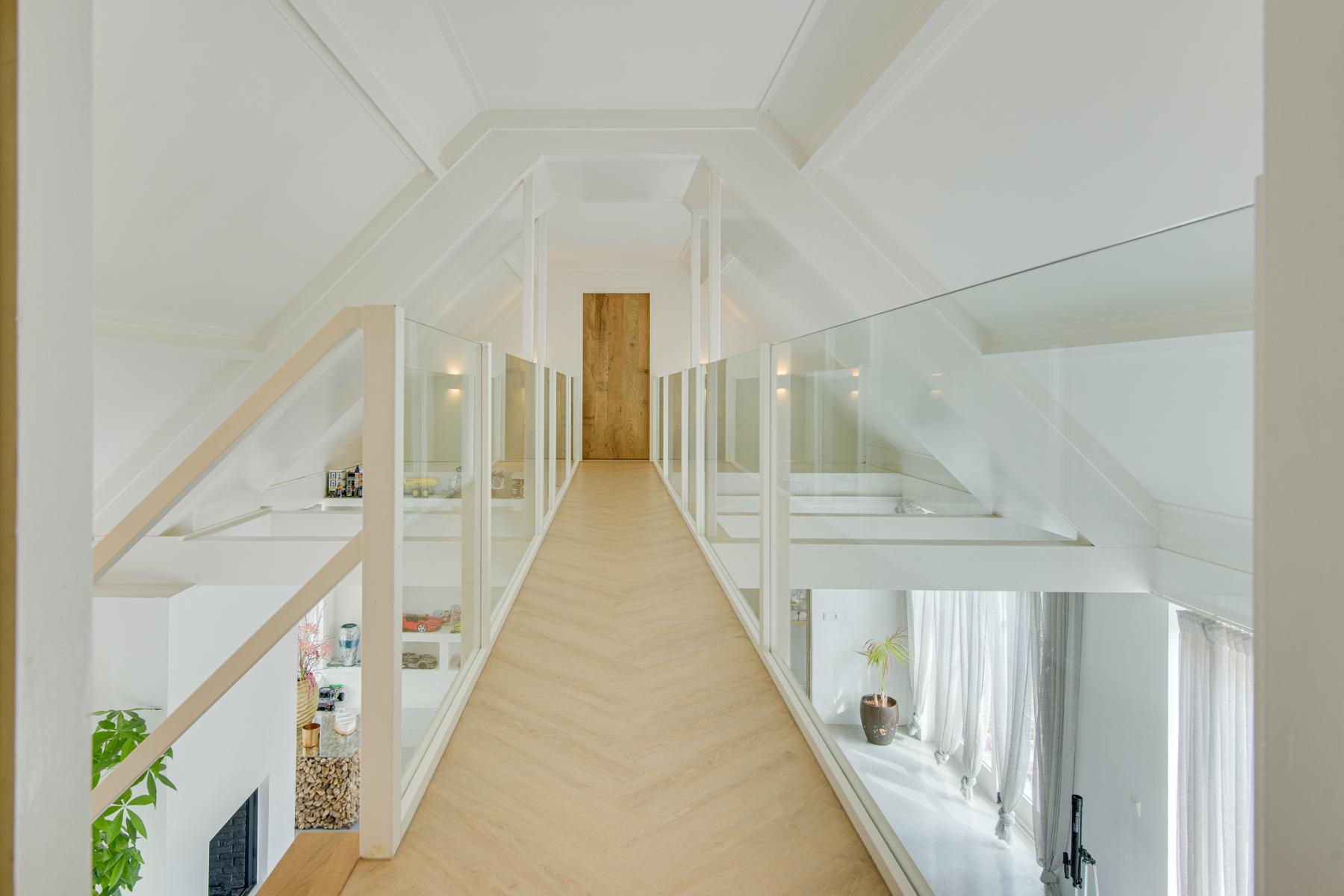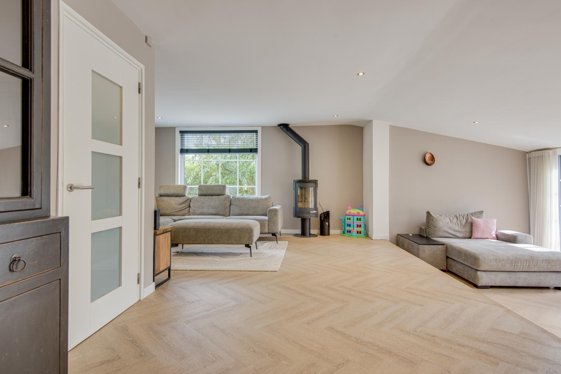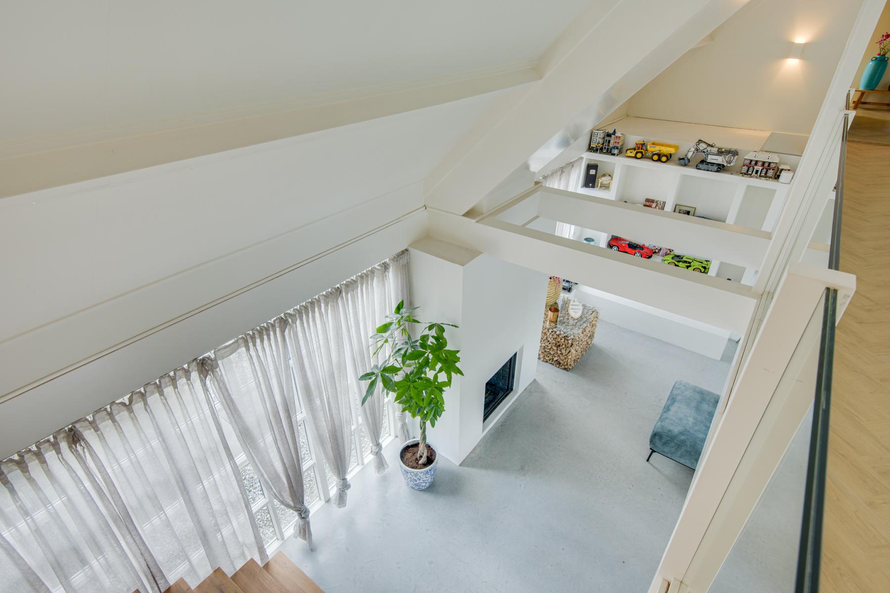 Wanneer u via de prachtige stalen deur de zeer ruime, lichte en open living instapt voelt u direct de charme van deze heerlijke ruimte die is voorzien van een woonbetonvloer met vloerverwarming, houtkachel, gestuukte wanden, vaste (volledig op maat gemaakte) houten trap, 2 schuifpuien en nog 2 grote raampartijen die samen zorgen dat dit een prachtig lichte ruimte is. Ook ziet u de strak gestuukte schouw. Maar de ware eyecatcher van deze ruimte vindt u boven uw hoofd waar een prachtige loopbrug is gesitueerd.