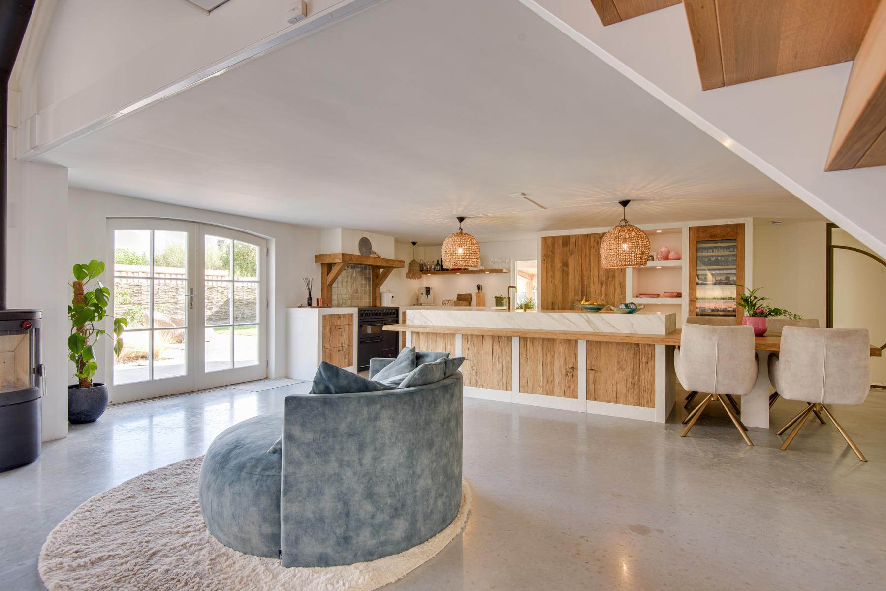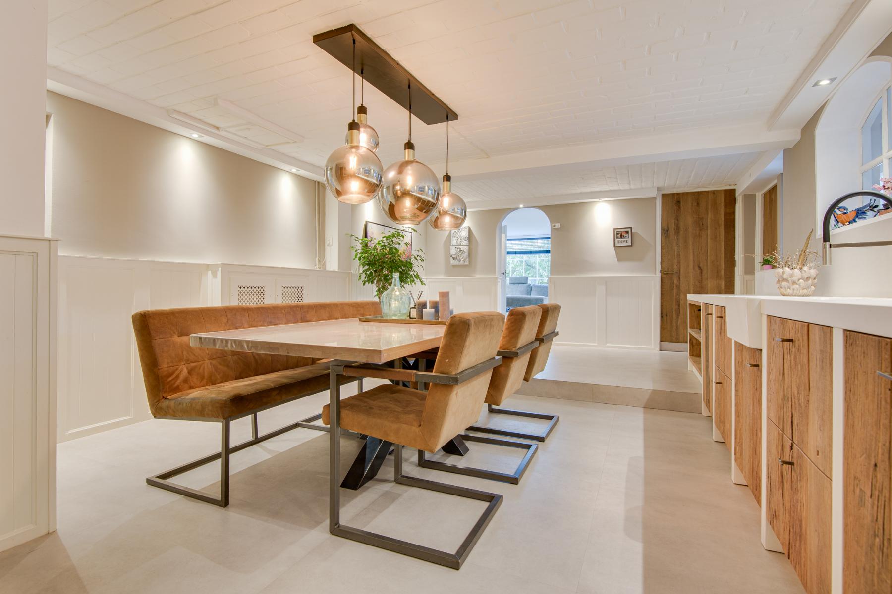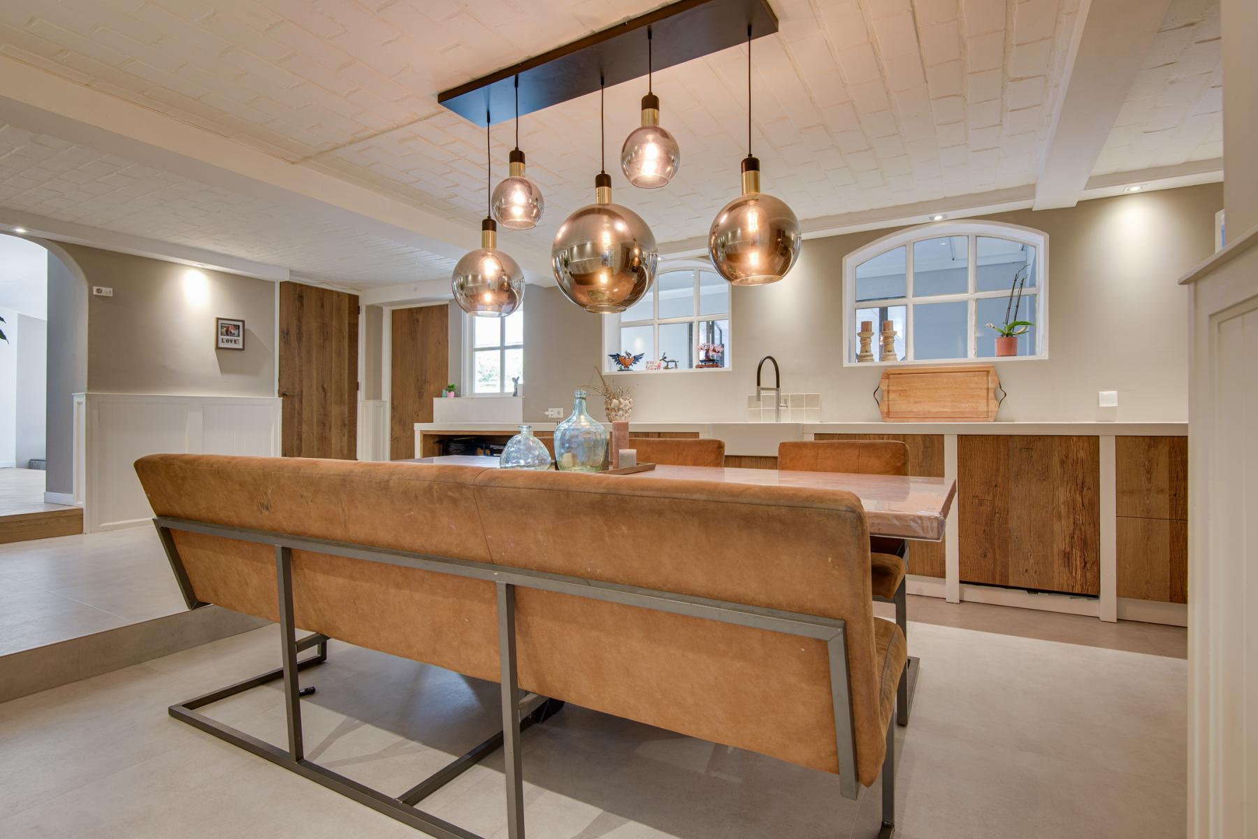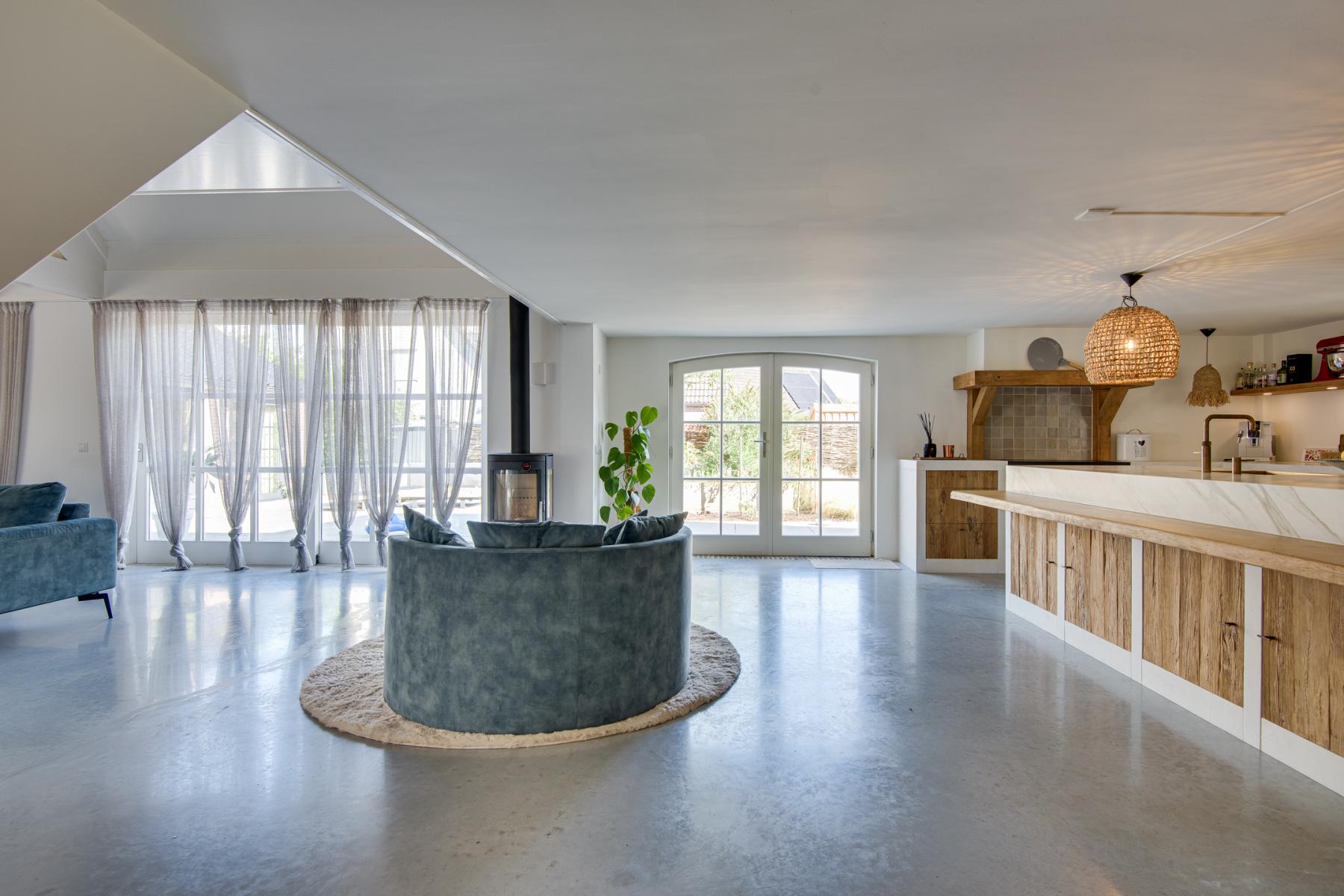 Aansluitend gaat u naar de sfeervolle woonkeuken met authentieke boerderijraampjes. De ruimte is voorzien van PVC-vloer met vloerverwarming, vaste kast en een luxe op maat gemaakt keukenblok met iepenhouten elementen. Verder is dit keukenblok voorzien van een inductie kookplaat, grote oven van het merk Steel, afzuigkap, ingebouwde koelkast met vriezer en een vaatwasser.