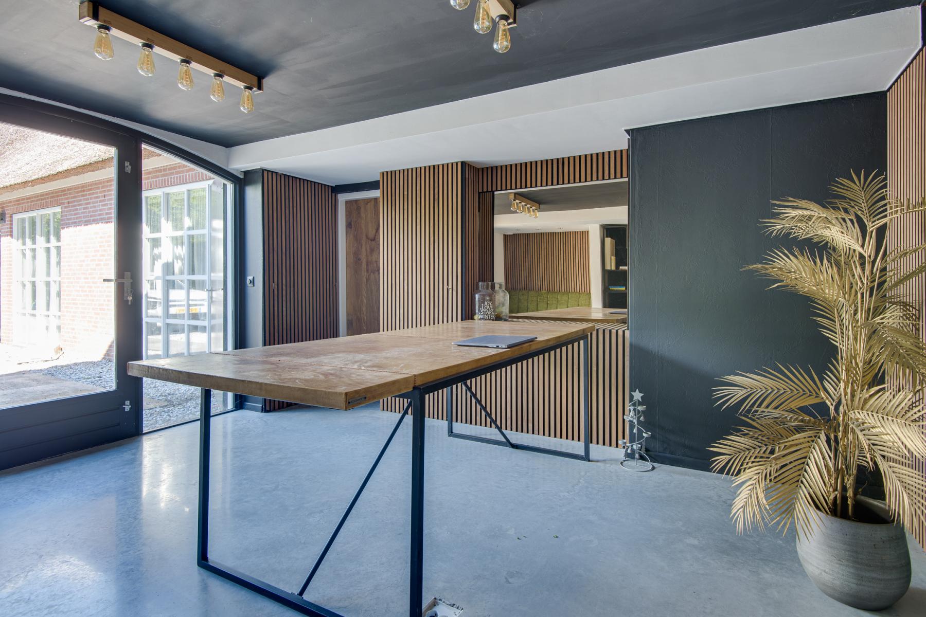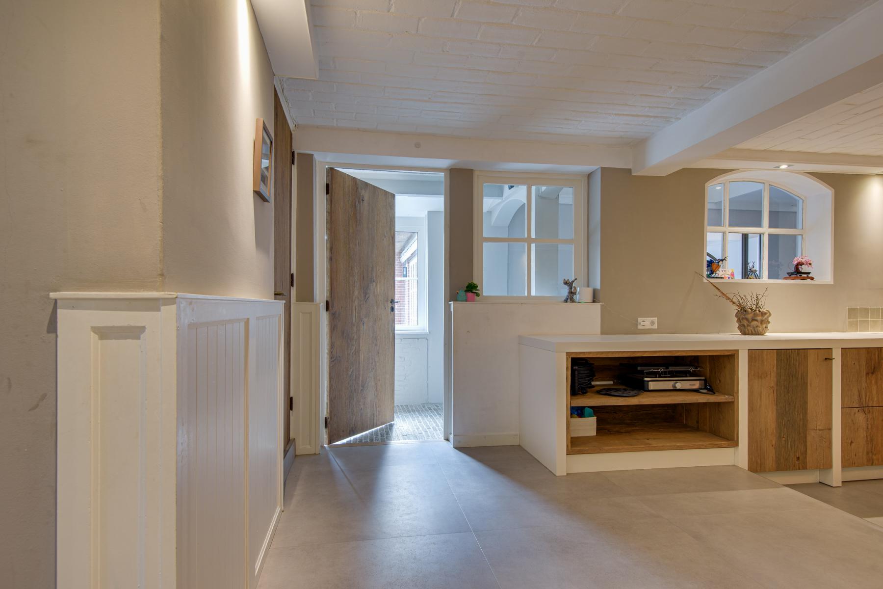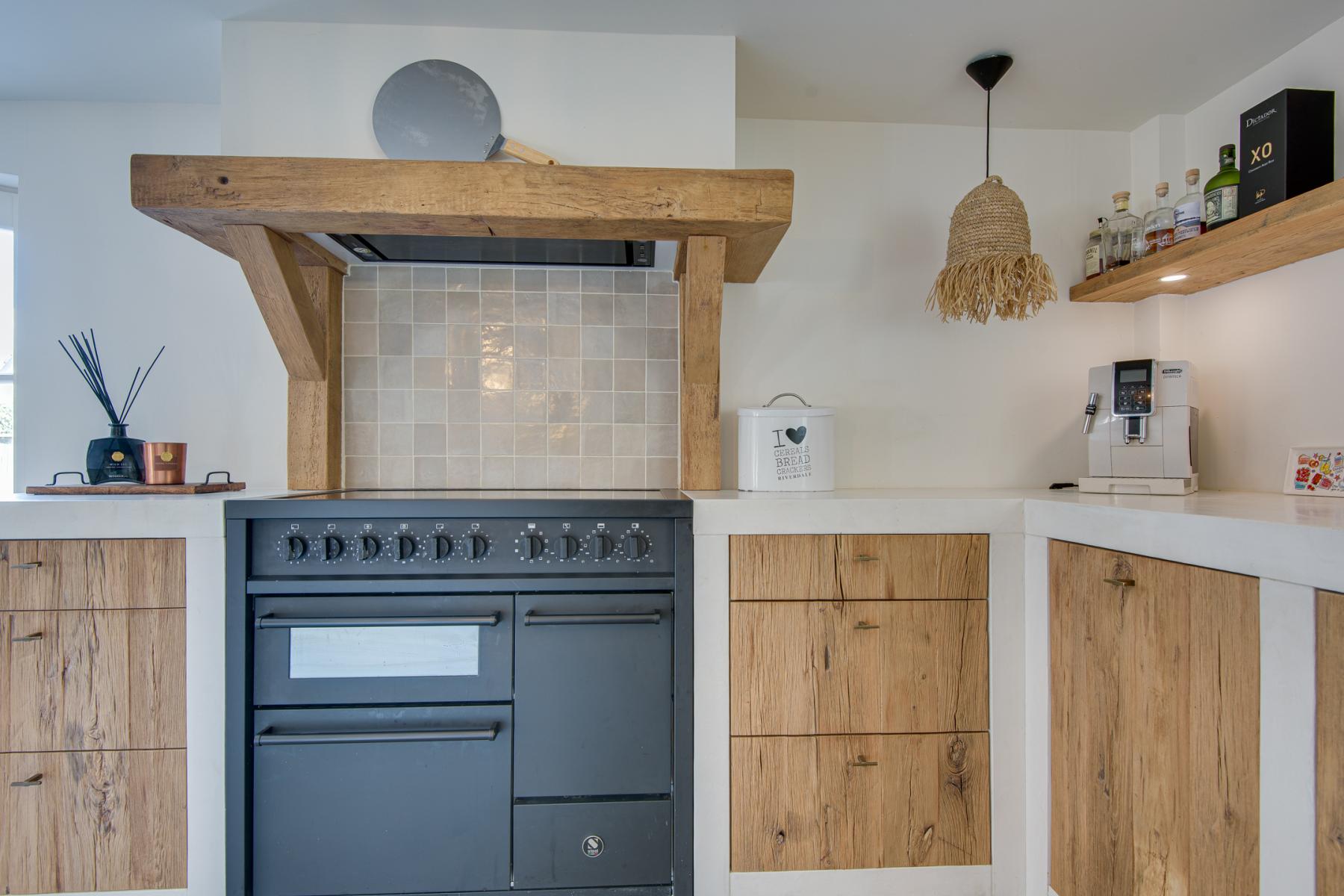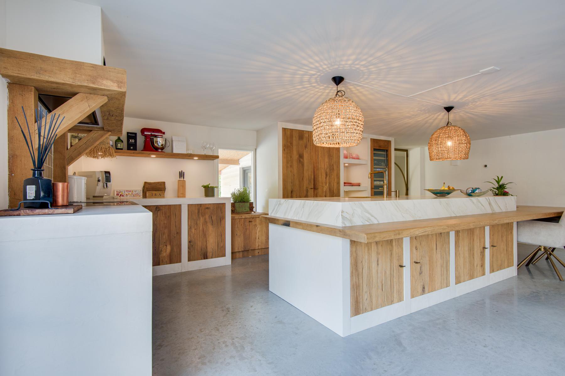 Aansluitend gaat u naar de sfeervolle woonkeuken met authentieke boerderijraampjes. De ruimte is voorzien van PVC-vloer met vloerverwarming, vaste kast en een luxe op maat gemaakt keukenblok met iepenhouten elementen. Verder is dit keukenblok voorzien van een inductie kookplaat, grote oven van het merk Steel, afzuigkap, ingebouwde koelkast met vriezer en een vaatwasser.