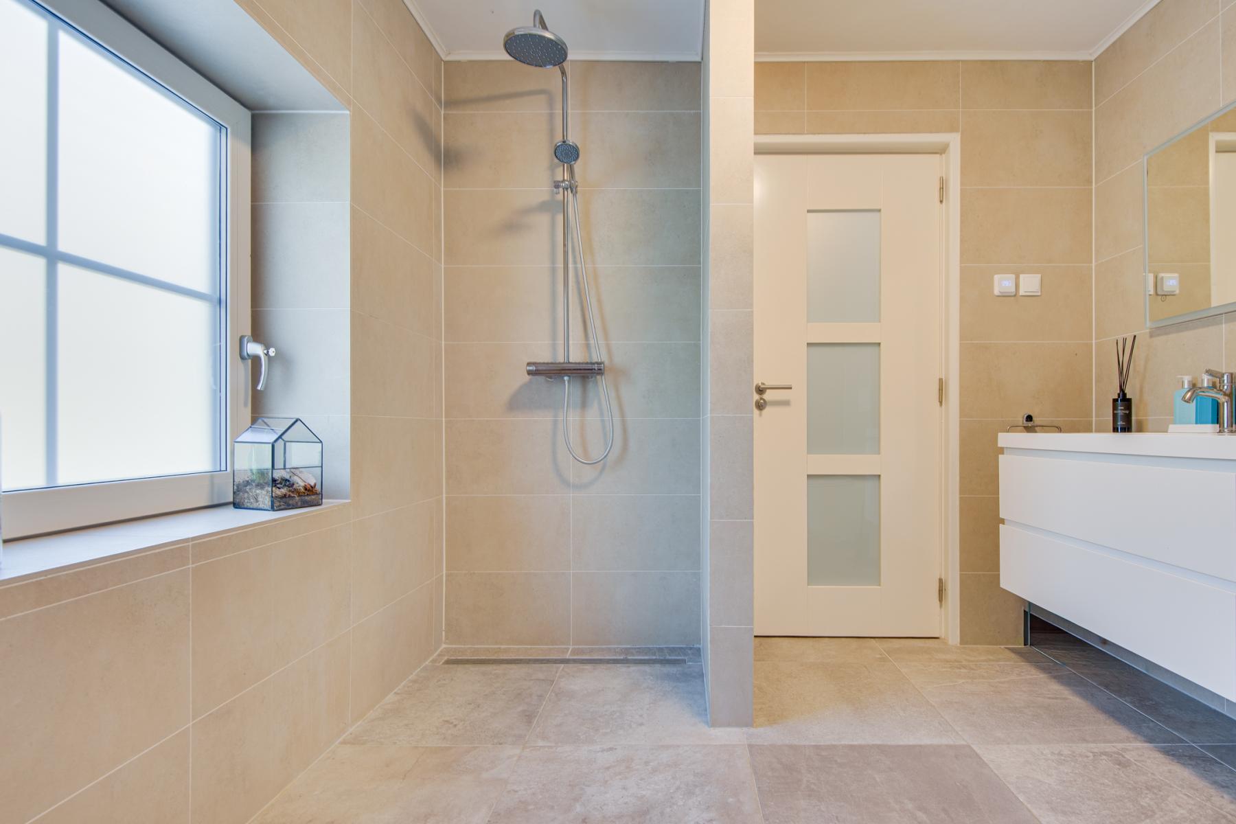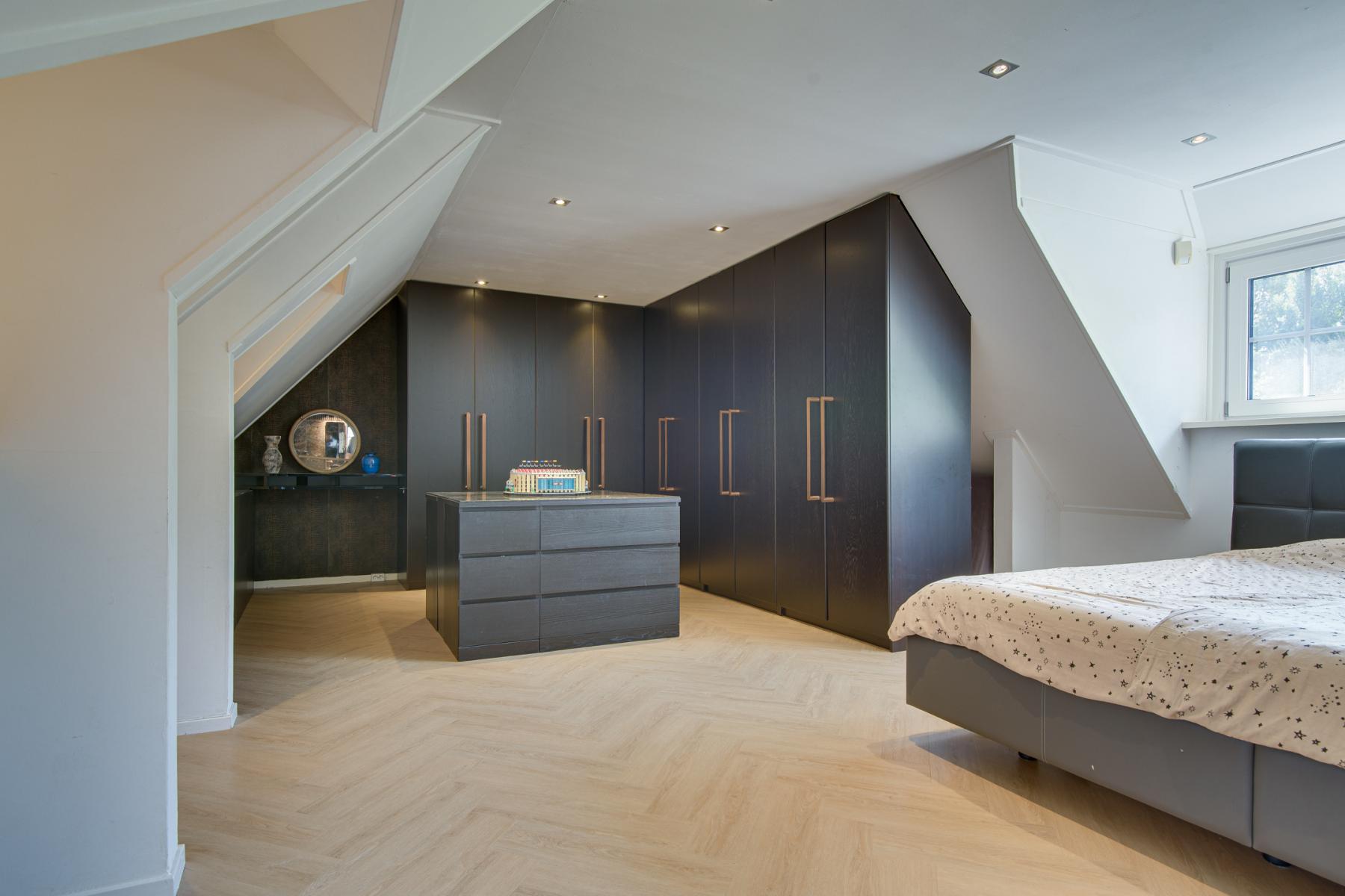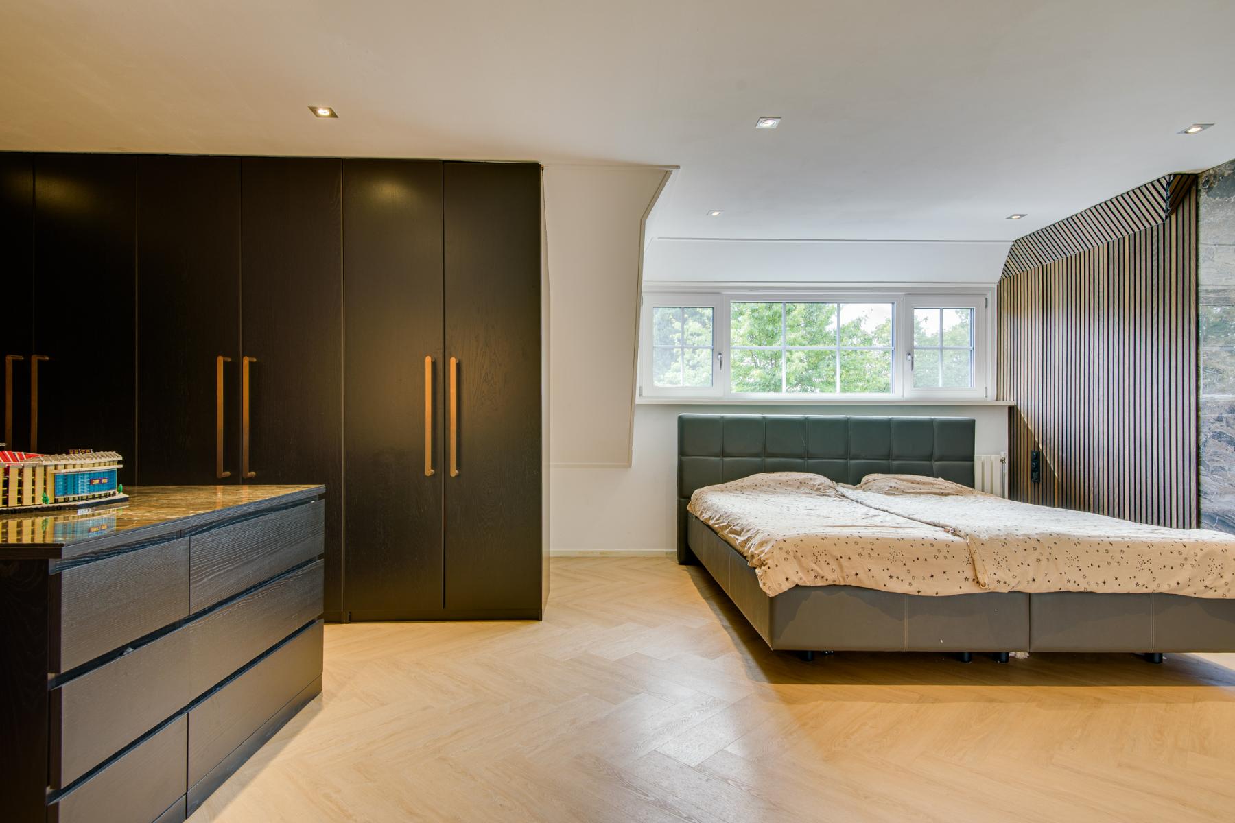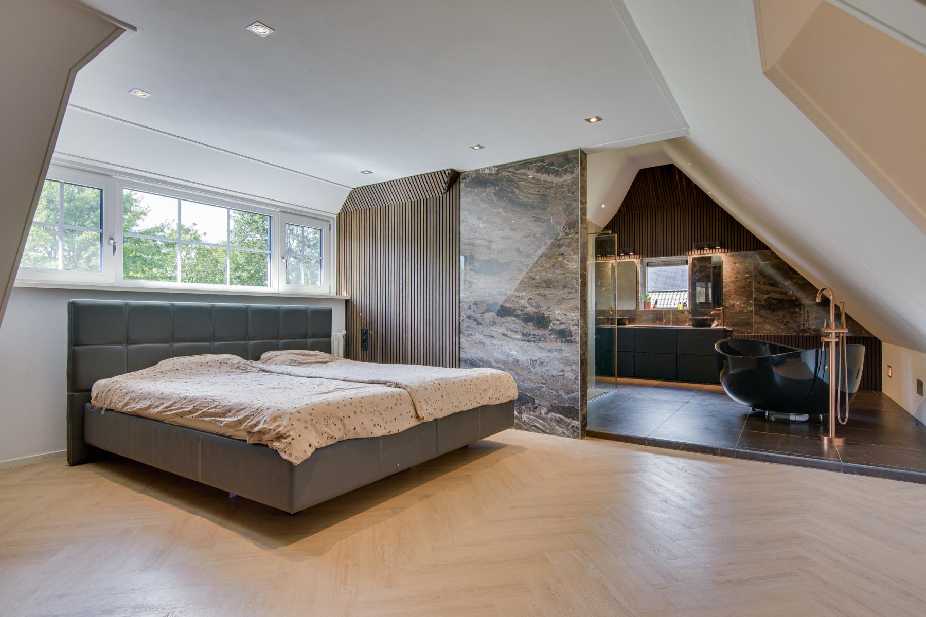 Via de woonkeuken heeft u toegang tot een slaapkamer met houten vloerdelen, gestuukt plafond, inbouwverlichting, verduisterende plisségordijnen en vaste kast. Deze slaapkamer heeft een eigen geheel betegelde badkamer met inloop douche, wastafelmeubel en hangend toilet.