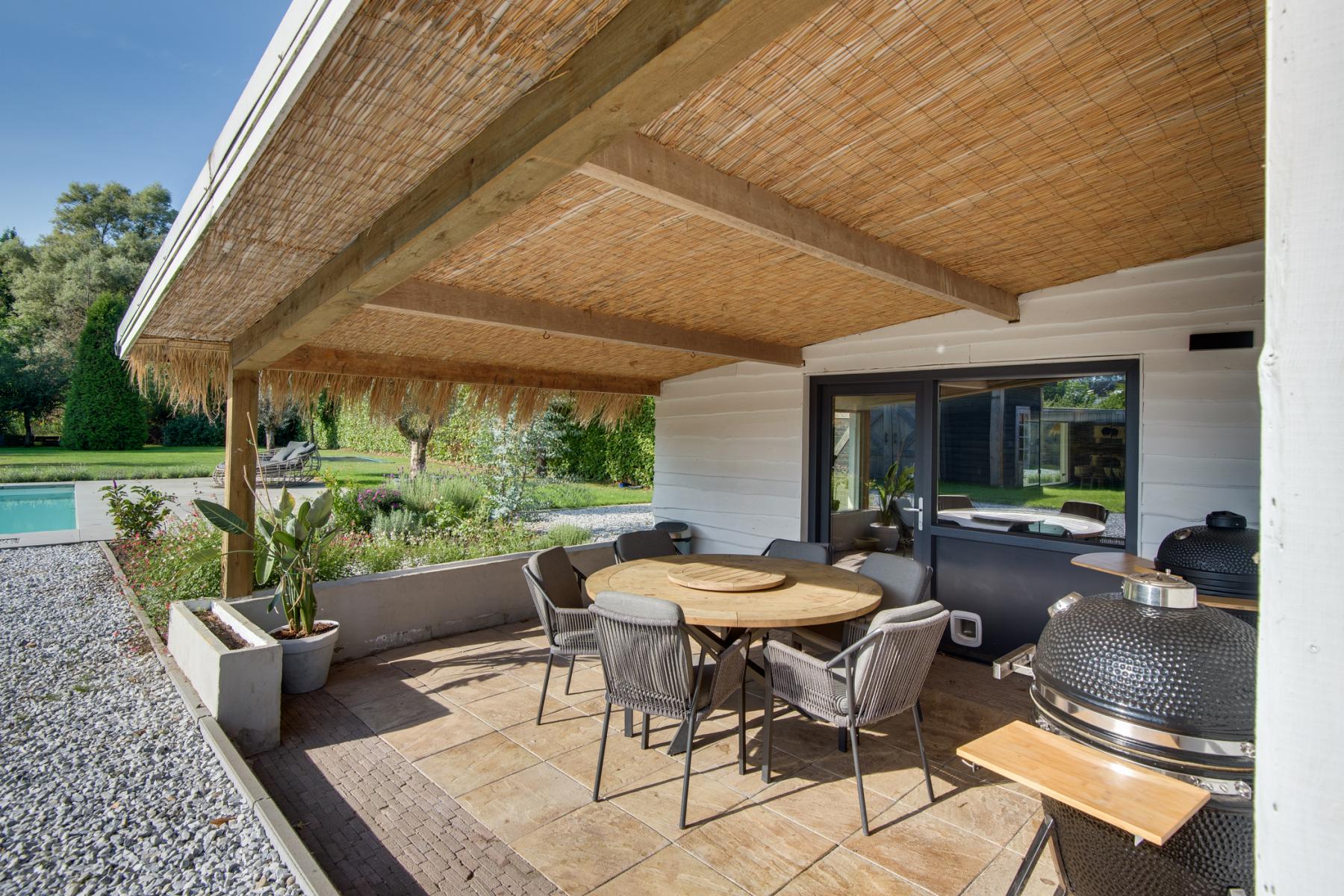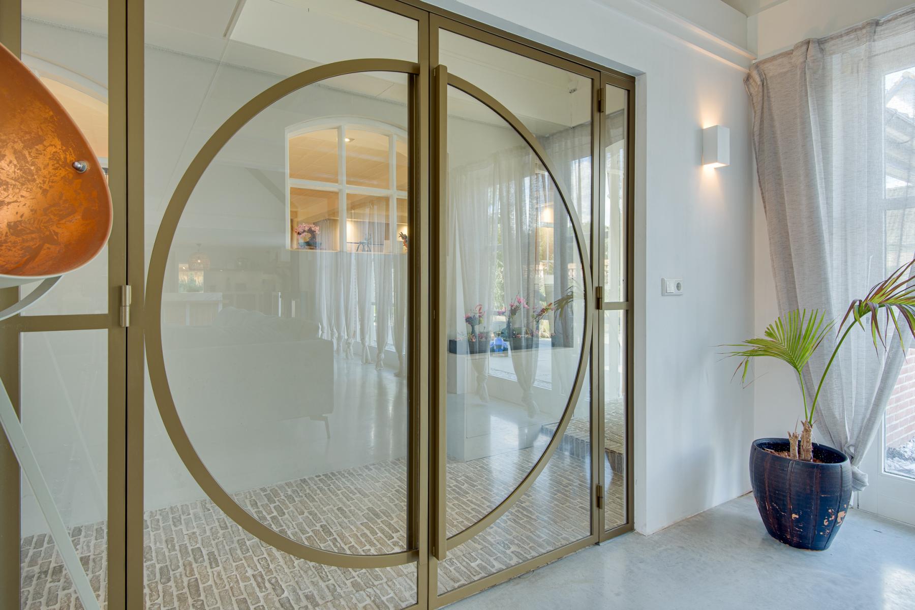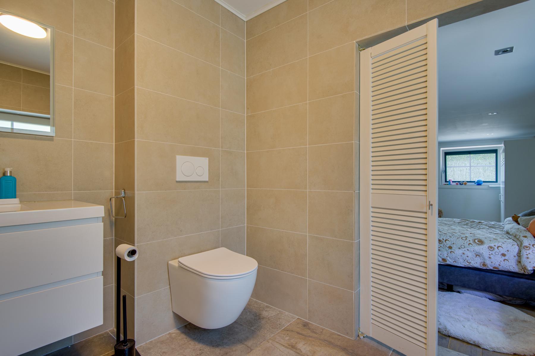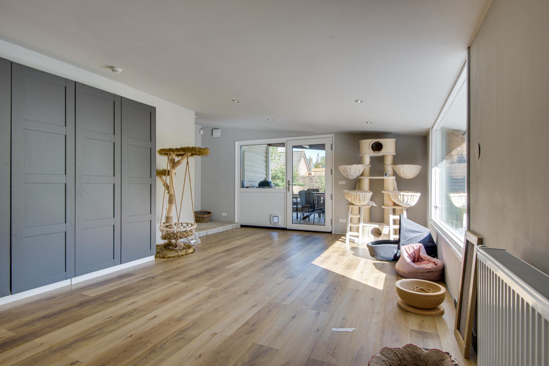 Aangrenzend aan de keuken gaat u via een eveneens prachtige stalen deur naar de volgende ruimte. Deze ruimte geeft uitzicht over het zwembad en het gazon. Deze ruimte zou prima kunnen dienen als serre, gym of als berging. Ook bevindt zich hier de wasruimte met aansluitpunt voor was apparatuur en de omvormer van de zonnepanelen. Naast de wasruimte is een gestuukte toiletruimte met hangend toilet en geheel betegelde badkamer met inloop douche.