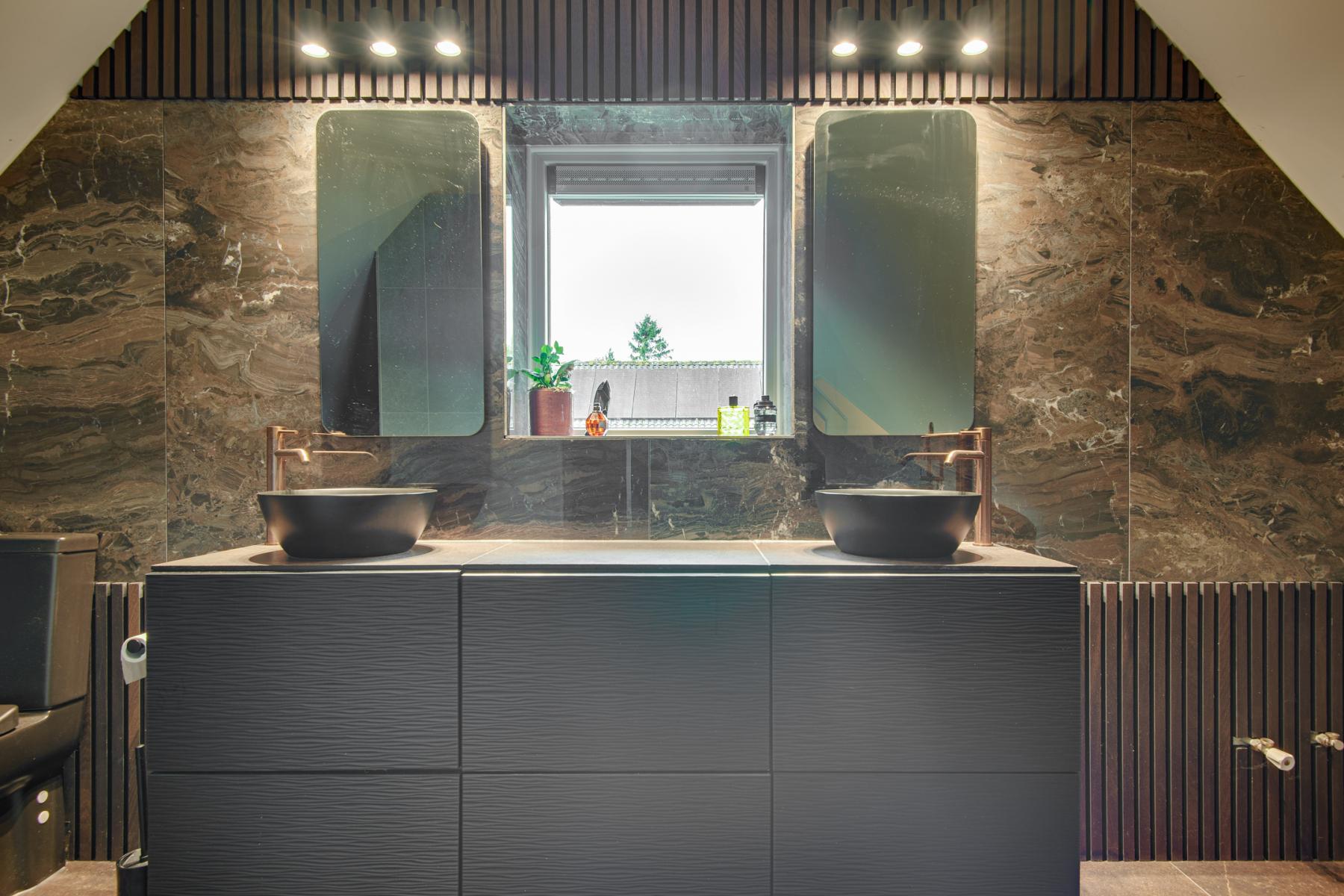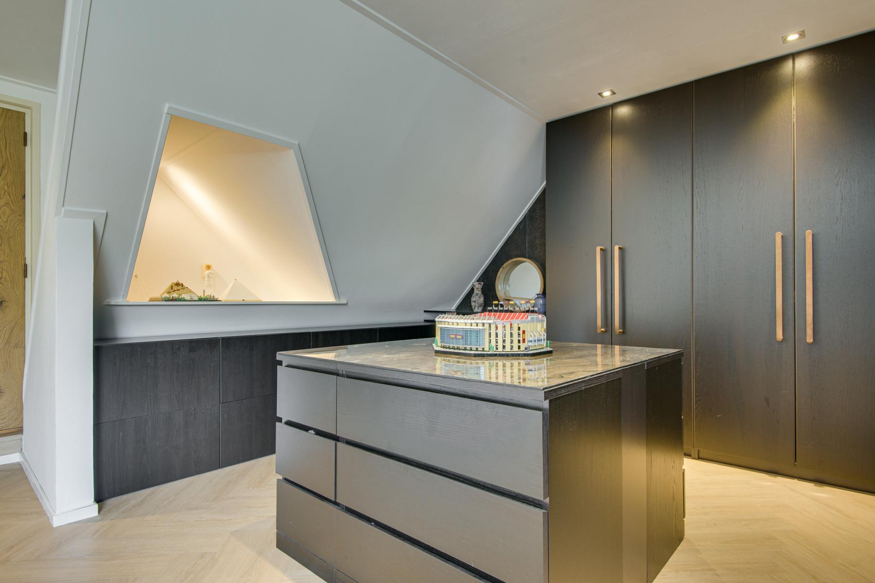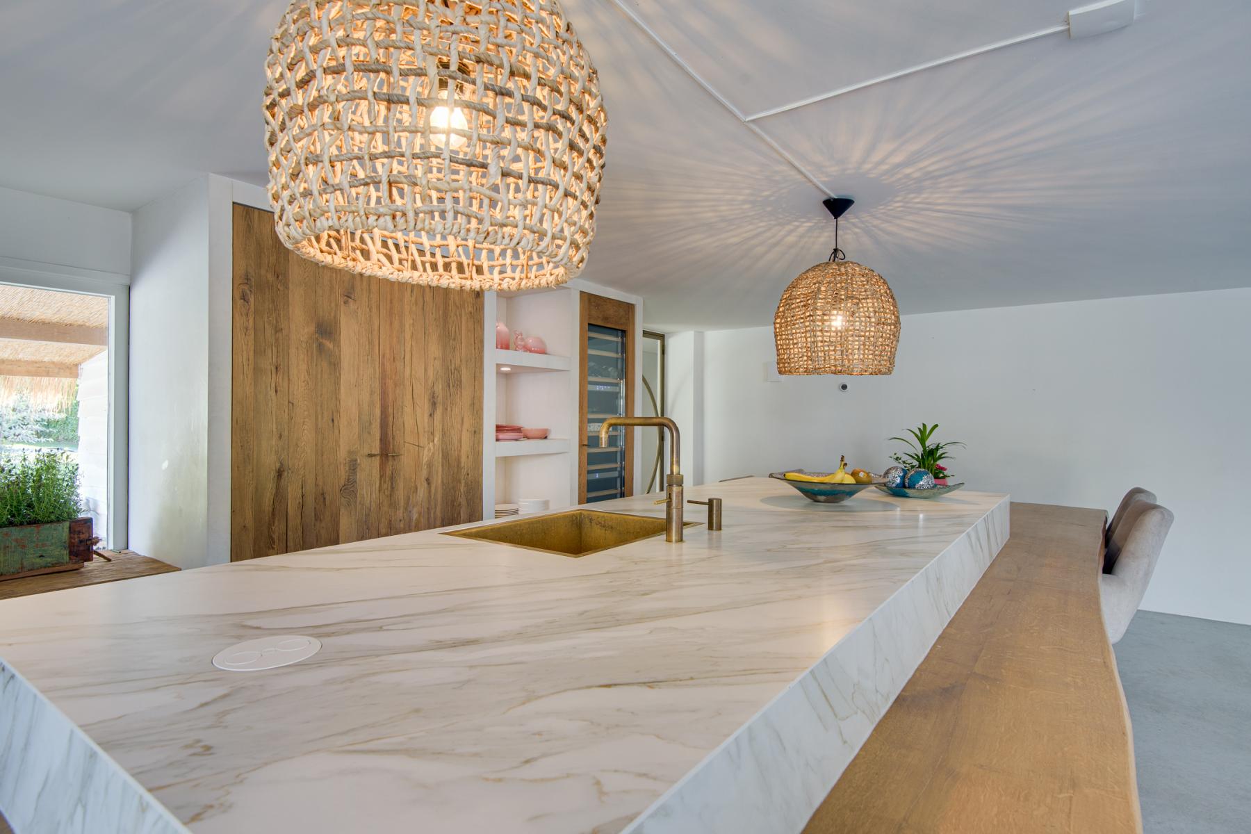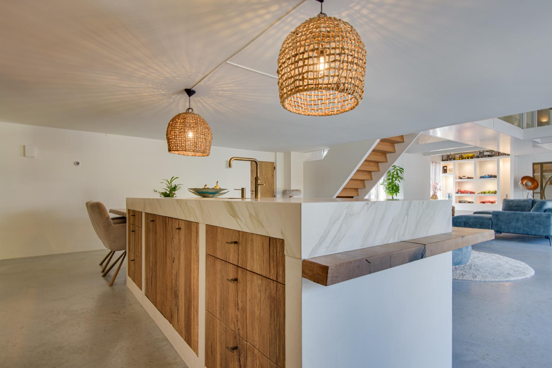 In deze zeer indrukwekkende open ruimte vindt u ook de schitterende woonkeuken. Een andere absolute eyecatcher in deze ruimte is het op maat gemaakt luxe keukenblok wat is voorzien van massief iepenhouten elementen, een keramisch aanrechtblad en een boomstammen keukentafel. De keuken is verder voorzien van een Steel inductie kookplaat met oven, pizza oven en grote oven, een vaatwasser, afzuigkap, grote koelkast en aparte vriezer, wijnkast, Quooker en koperen spoelbak (Julius Baller). Tevens zijn er openslaande tuindeuren aanwezig.
