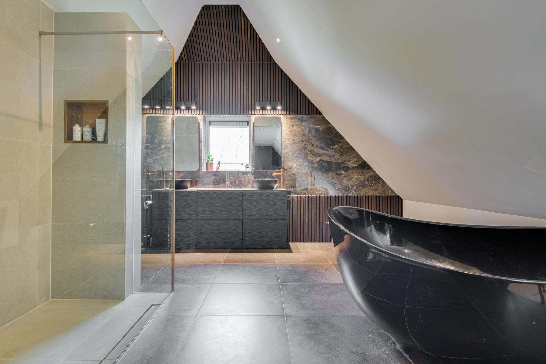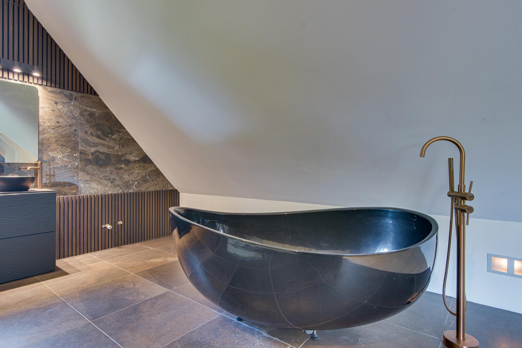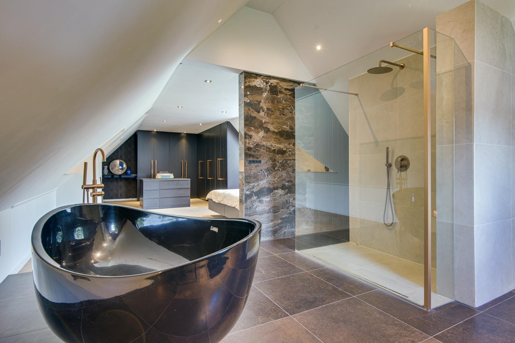 Via de vaste trap in de living is de master bedroom met en suite badkamer te bereiken. Dit is een zeer ruim opgezette slaapkamer met PVC-vloer, vaste kastenwand/kleedkamer, een dakkapel met elektrische 100% verduisterende screens en een luxe badkamer met tegelvloer, grote inloop douche, vrijstaand ligbad, staand toilet en dubbel wastafelmeubel. Al met al een ruimte om helemaal te ontspannen en te genieten.