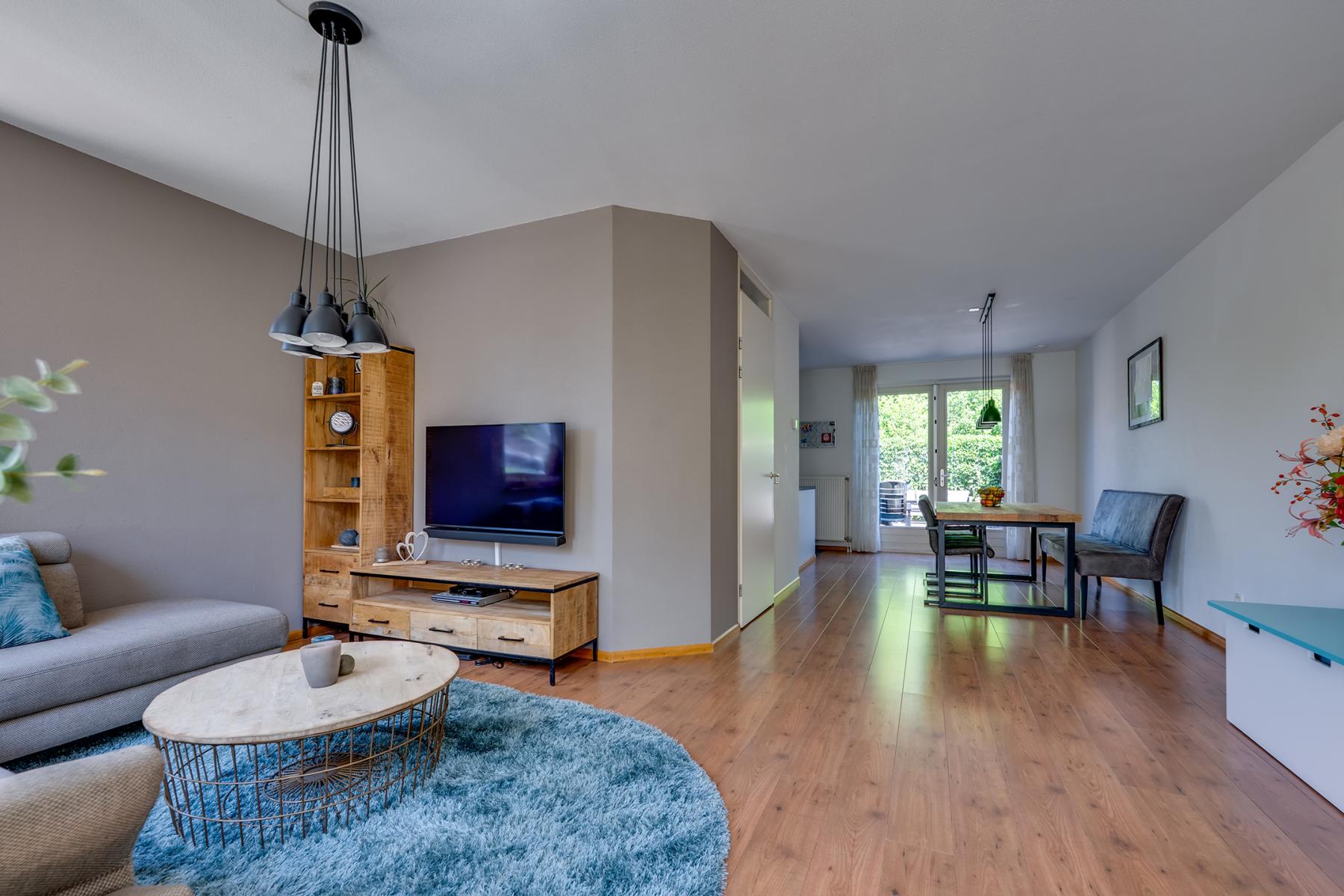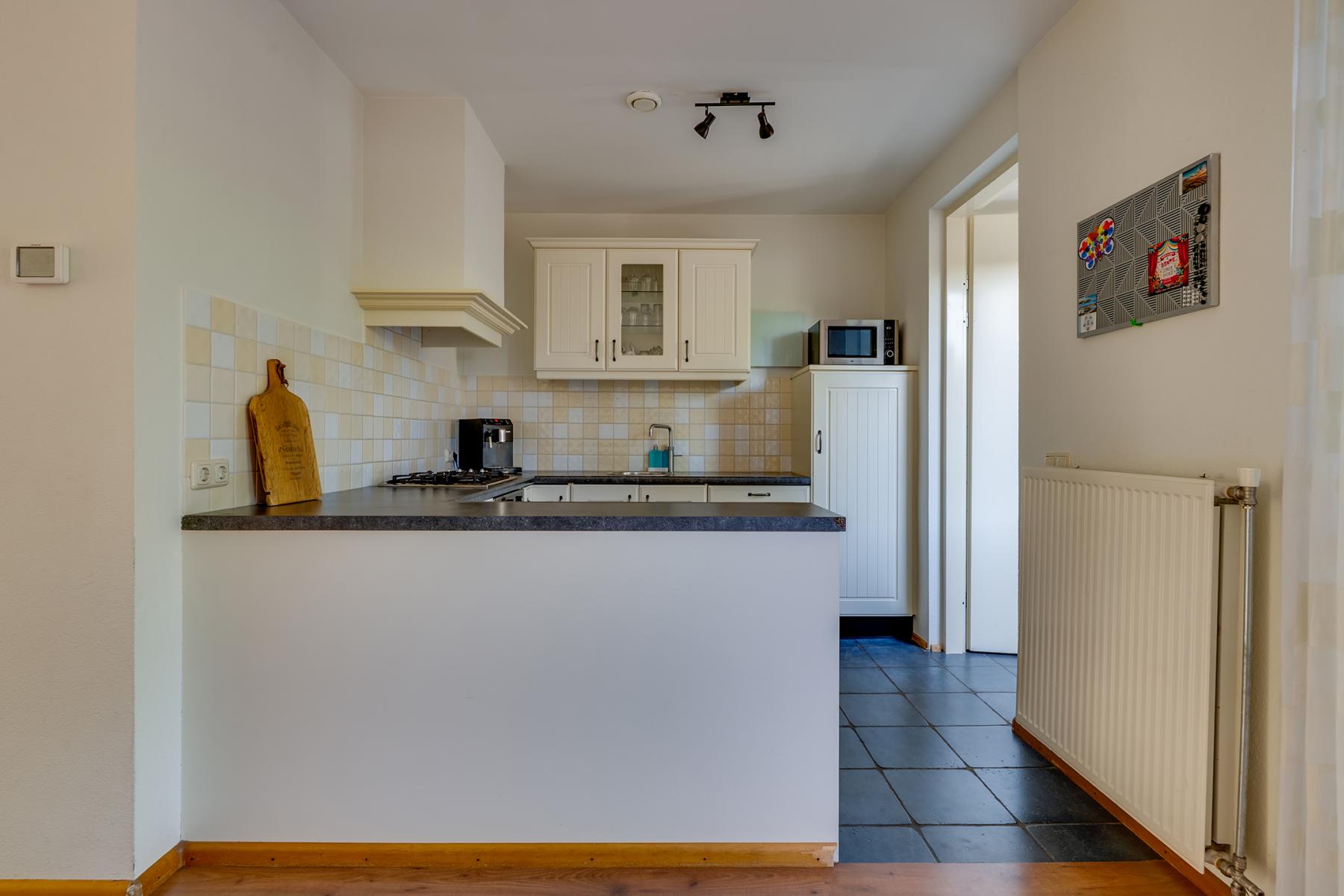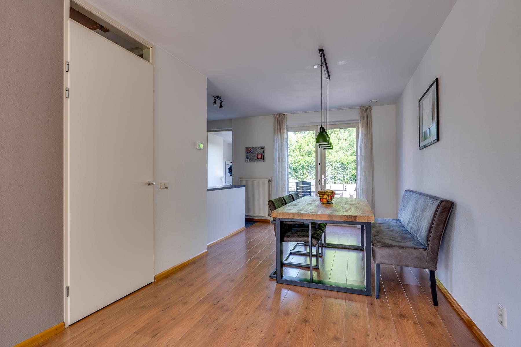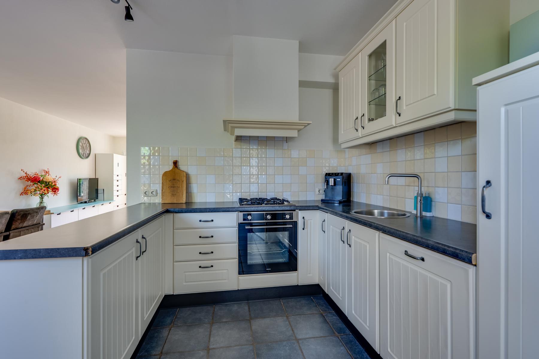Je komt binnen in een lichte en sfeervolle woonkamer met grote ramen die zorgen voor een prettige lichtinval. De open keuken grenst aan de eetkamer en is van alle gemakken voorzien: een Quooker, spoelbak, carrouselkast, 4-pits gaskookplaat, afzuigkap, oven, koelkast en een vaatwasser.