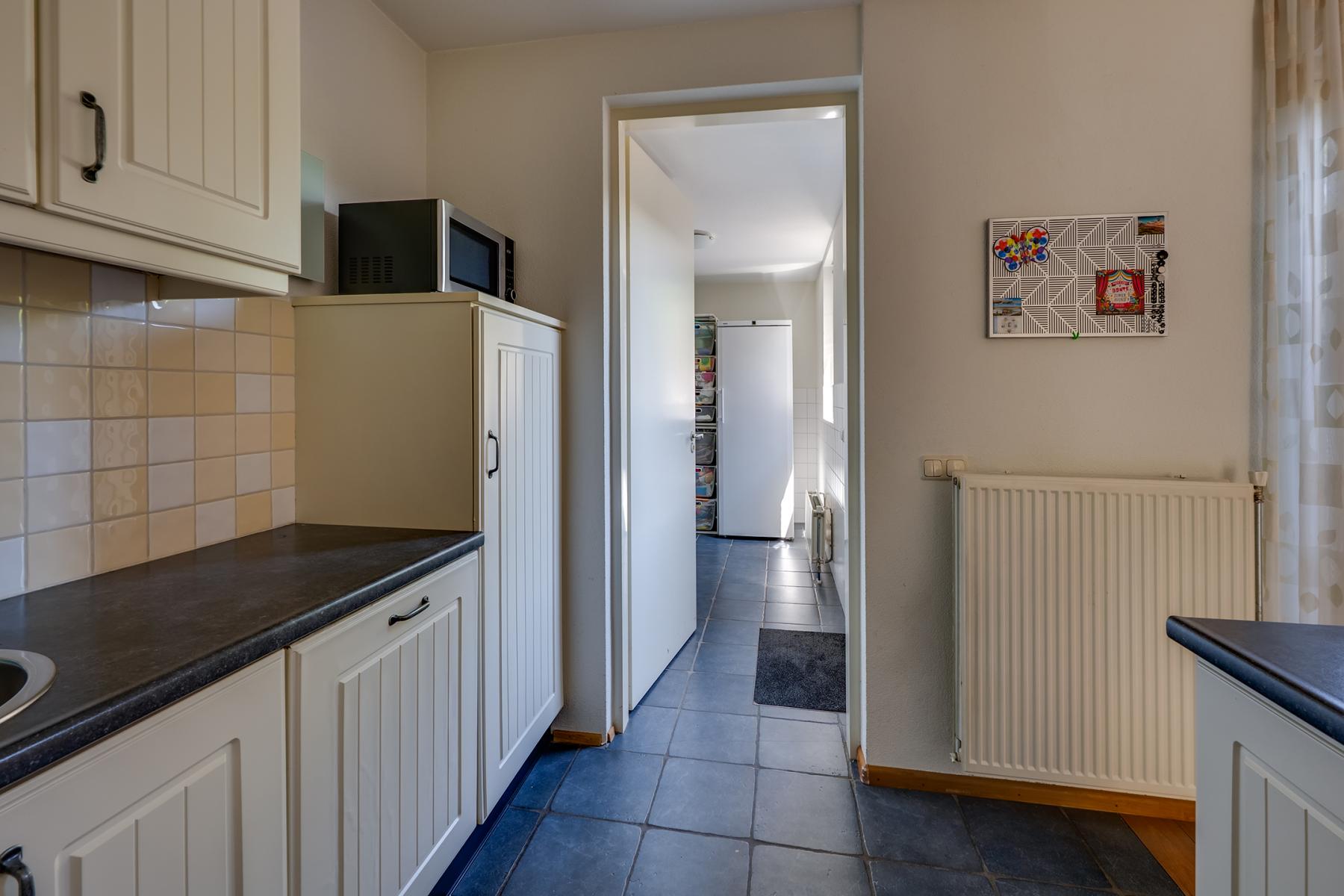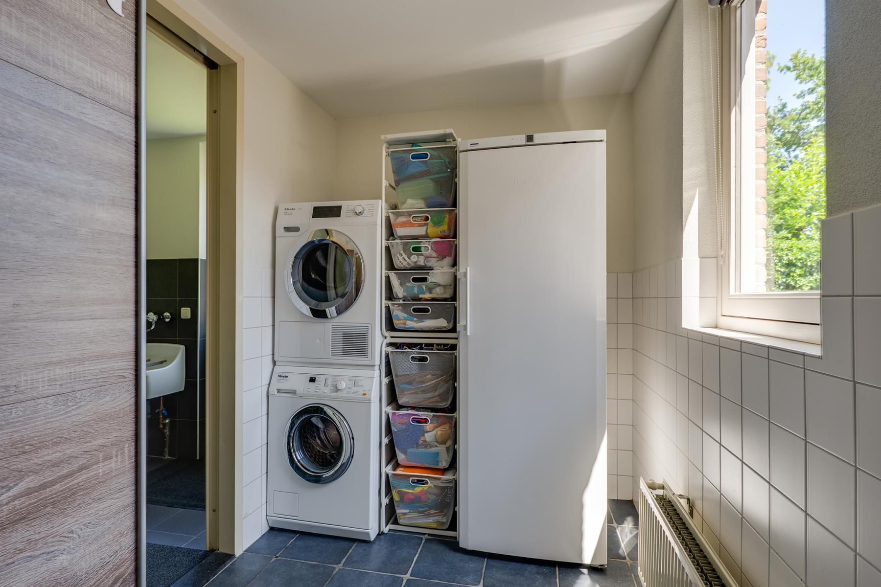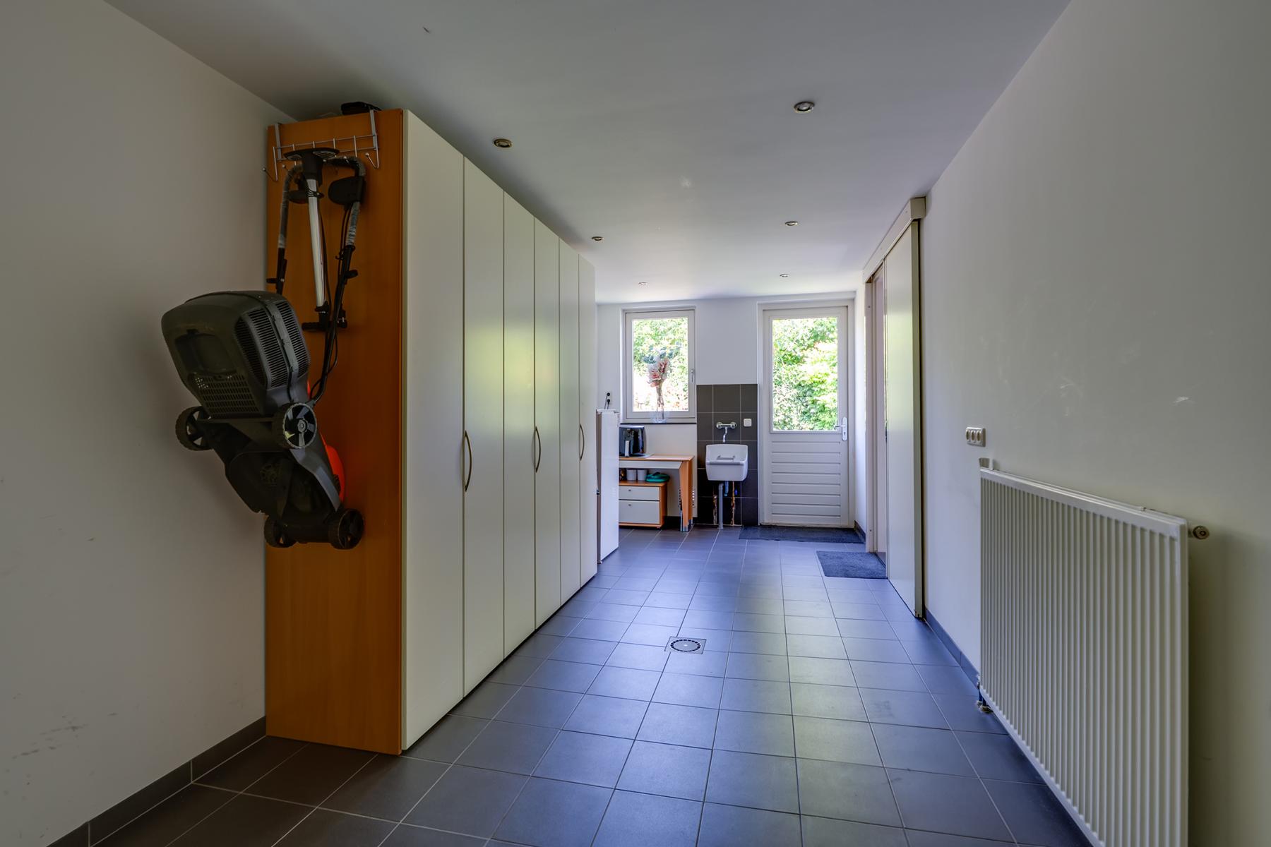 Aansluitend vind je de berging met wasmachineaansluiting, en van daaruit loop je zo door naar de garage. Deze ruime garage is verwarmd, geïsoleerd en beschikt over elektra en water – ideaal als klusruimte, extra opslag of zelfs hobbyruimte! Via de achterdeur in de garage kom je in de achtertuin.