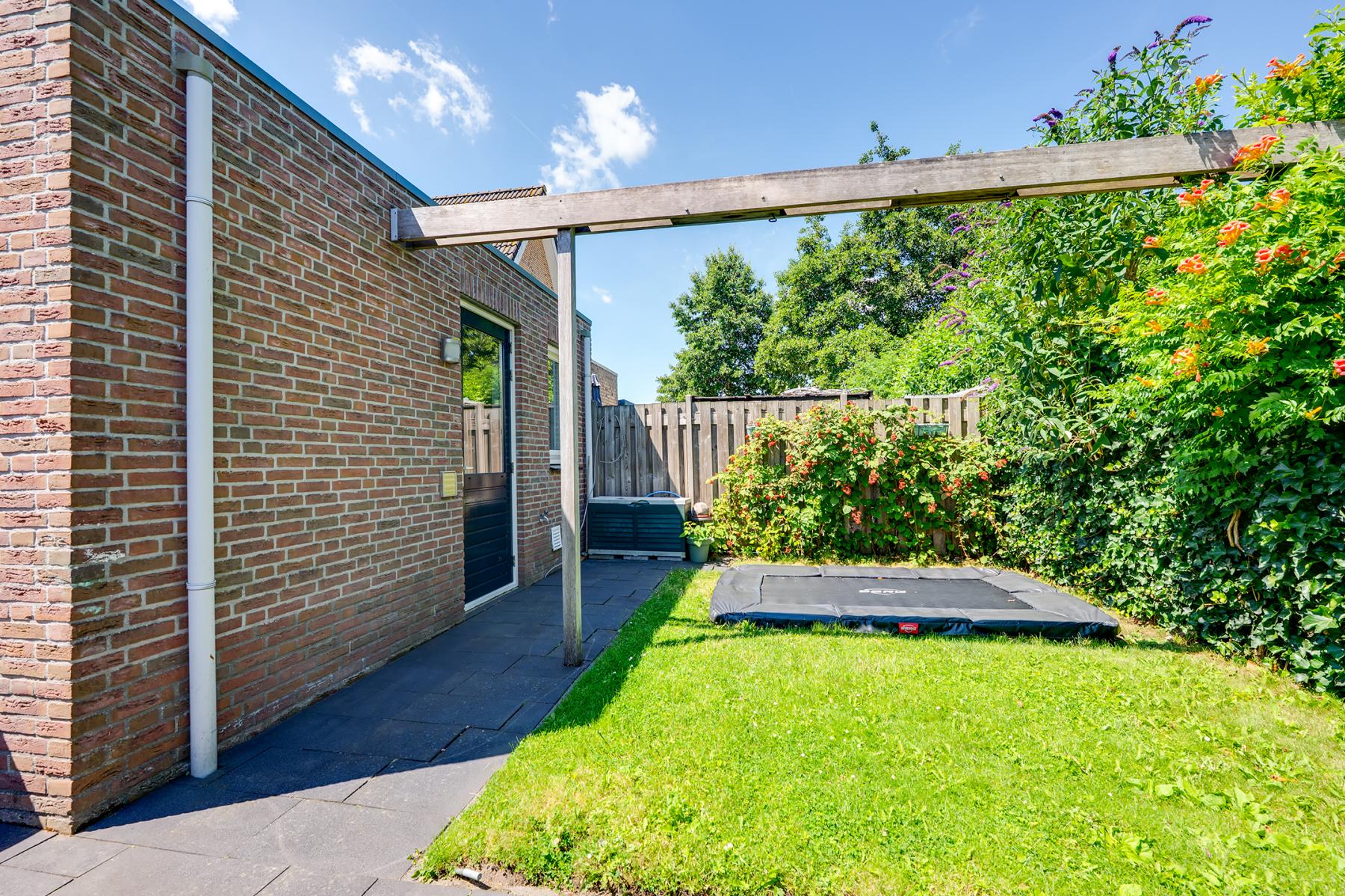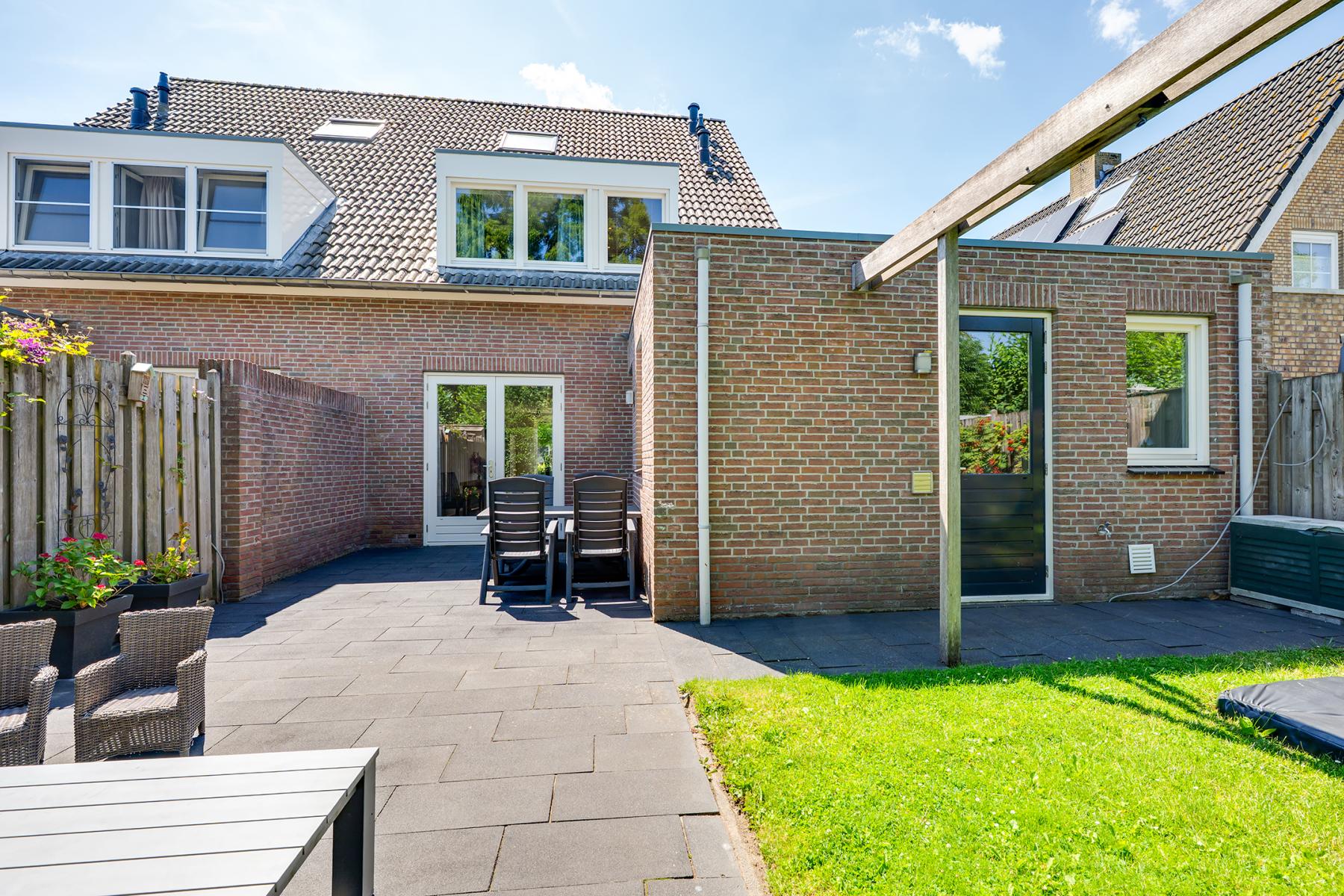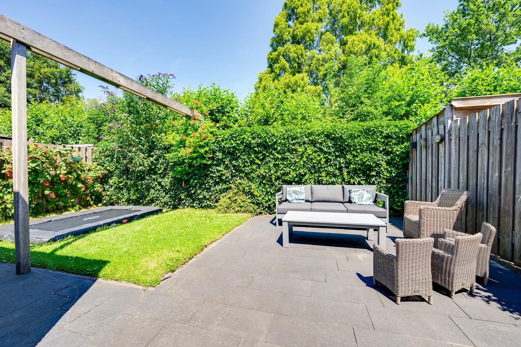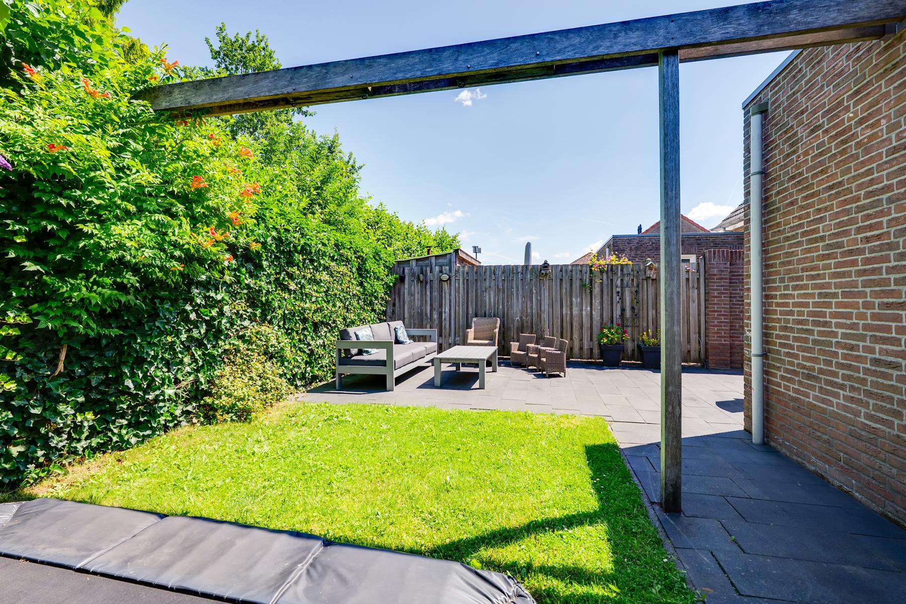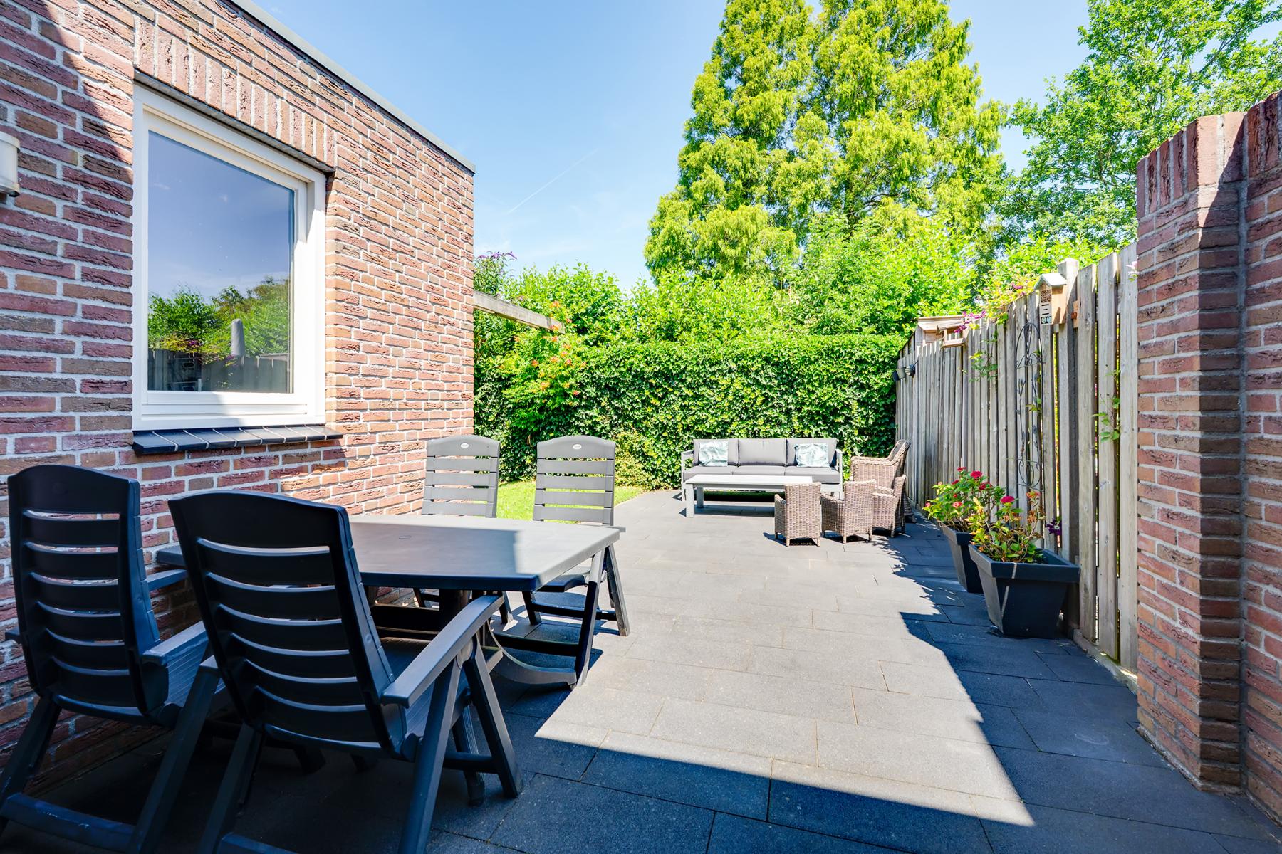 De achtertuin ligt op het noorden en biedt volop mogelijkheden om van het buitenleven te genieten. Er is genoeg ruimte voor meerdere zitplekjes en een stukje gras voor kinderen of een speeltoestel.