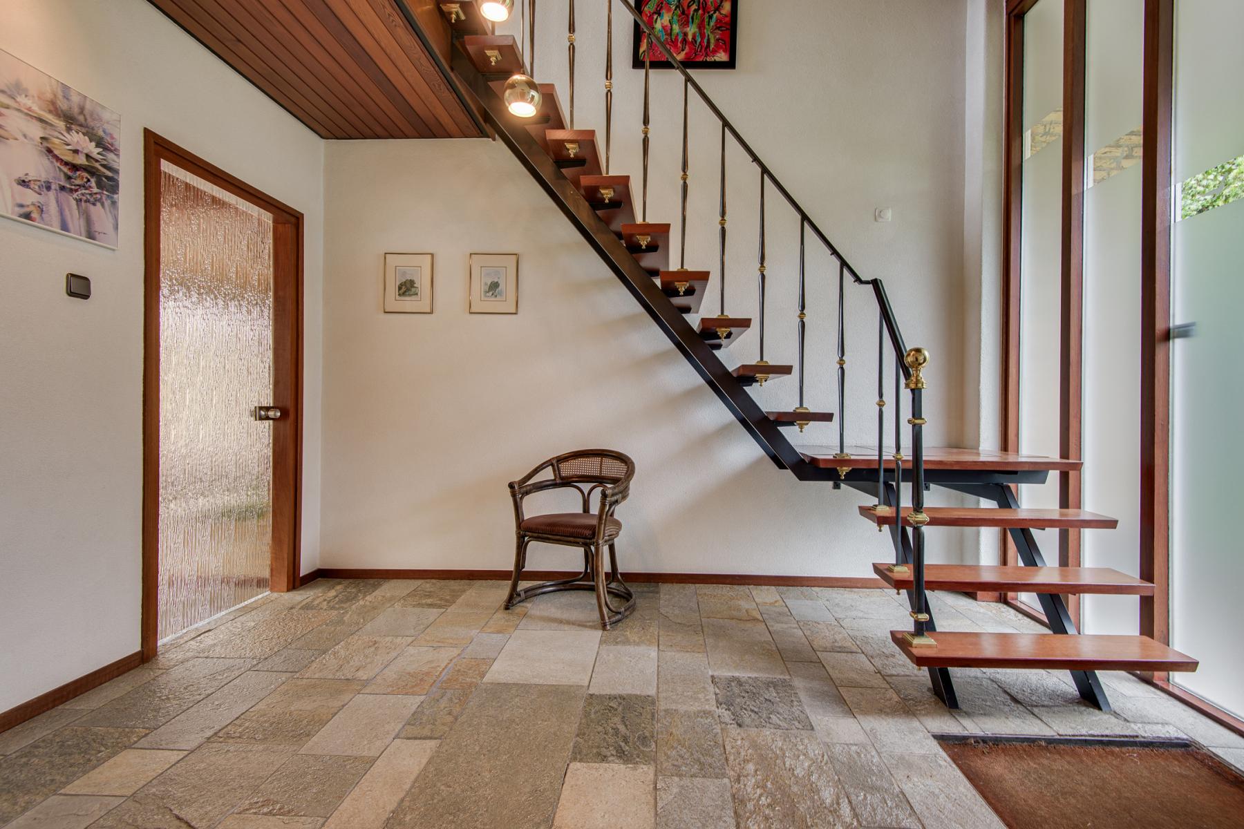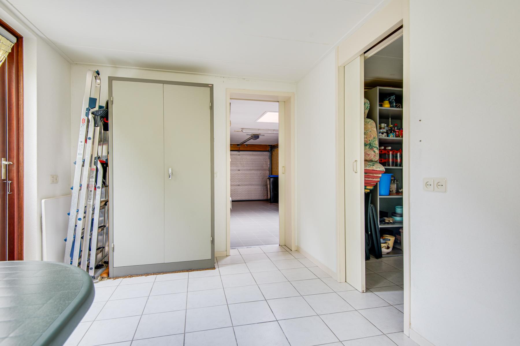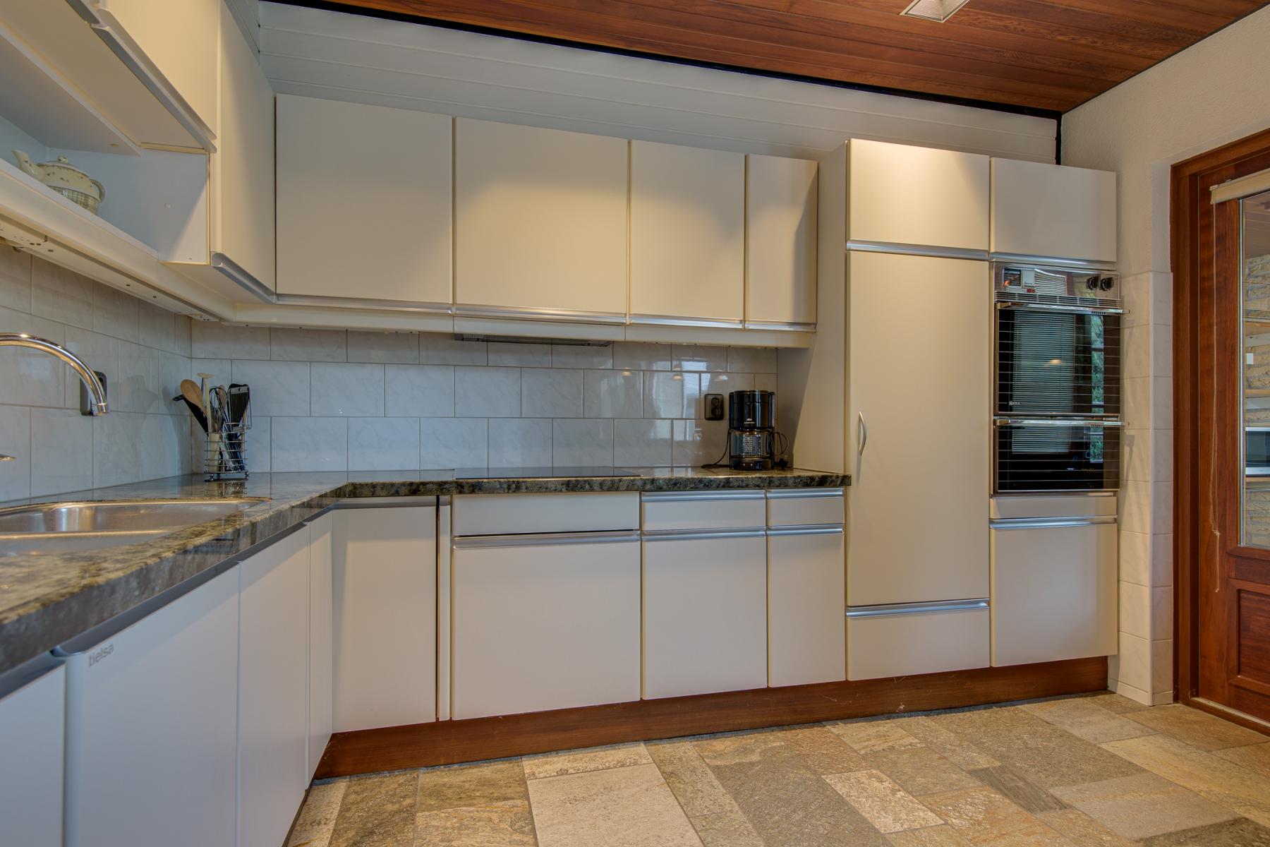 De halfopen Tiesla-keuken is voorzien van een granieten werkblad, inductiekookplaat, afzuigkap, oven, koelkast, vaatwasser en dubbele spoelbak. Via de keuken kom je in een halletje met toegang tot de garage, een extra berging en de stookruimte. Achter de garage zijn nog meer bergruimtes én een extra kamer te vinden – ideaal als werkplek of hobbyruimte.