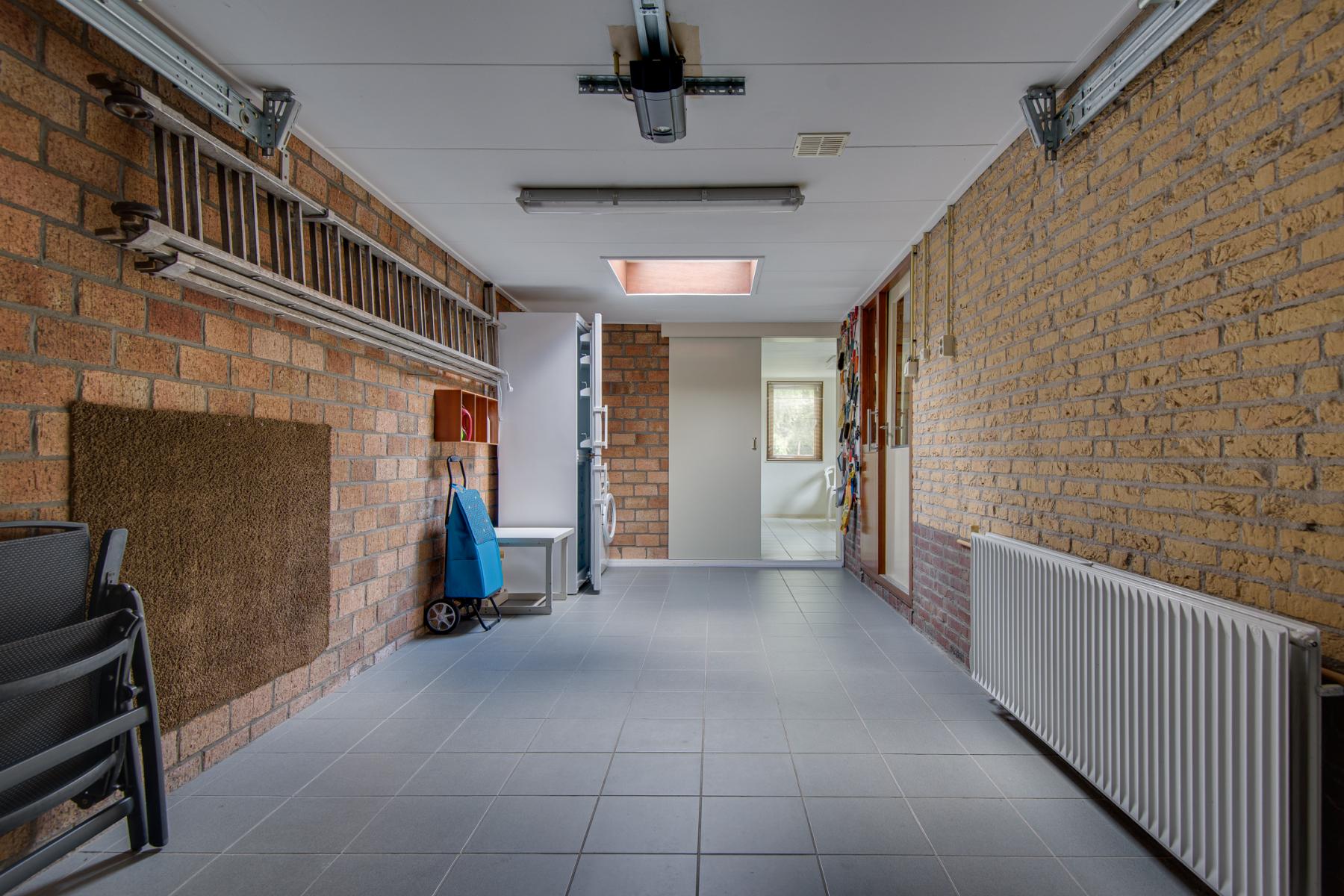De verwarmde garage beschikt over elektriciteit, water en een wasmachineaansluiting.