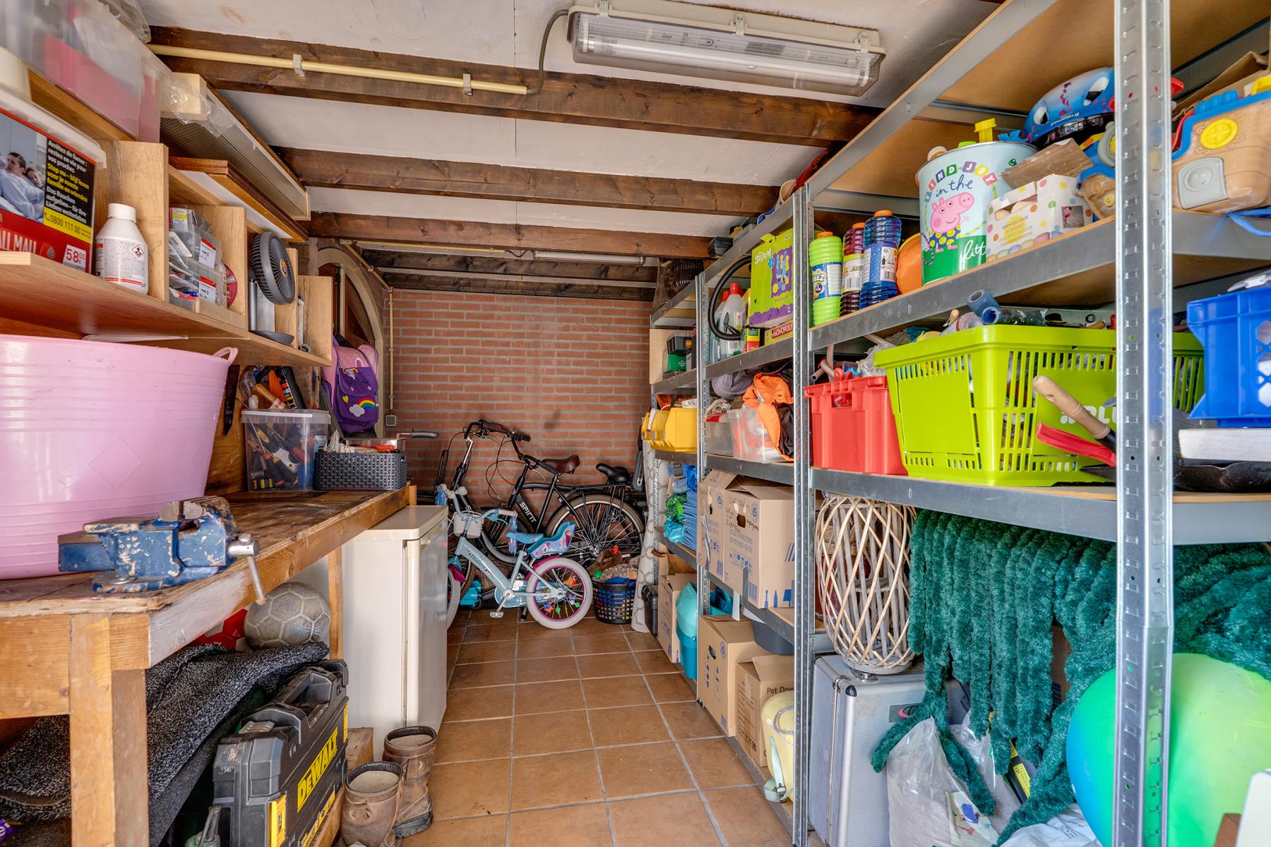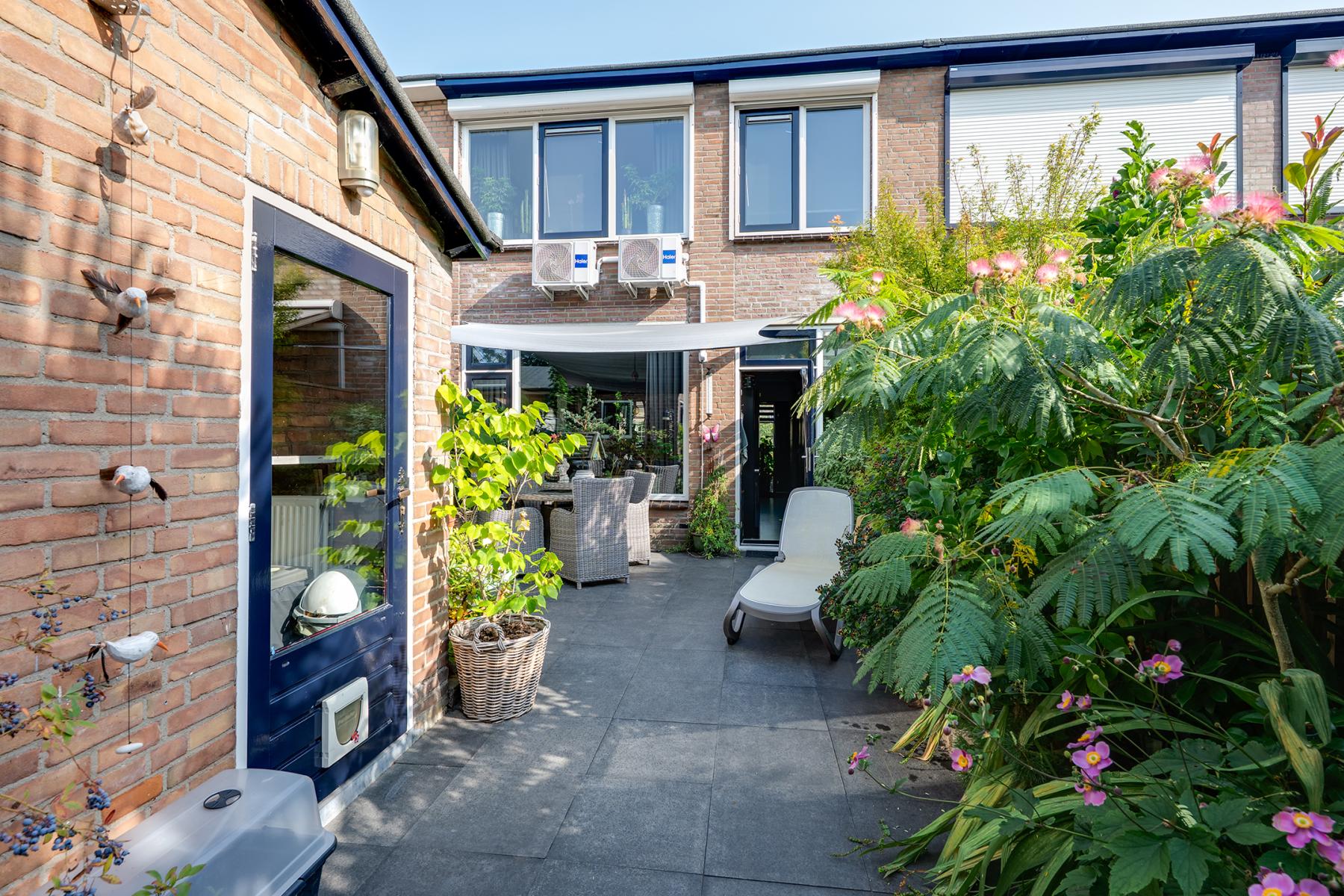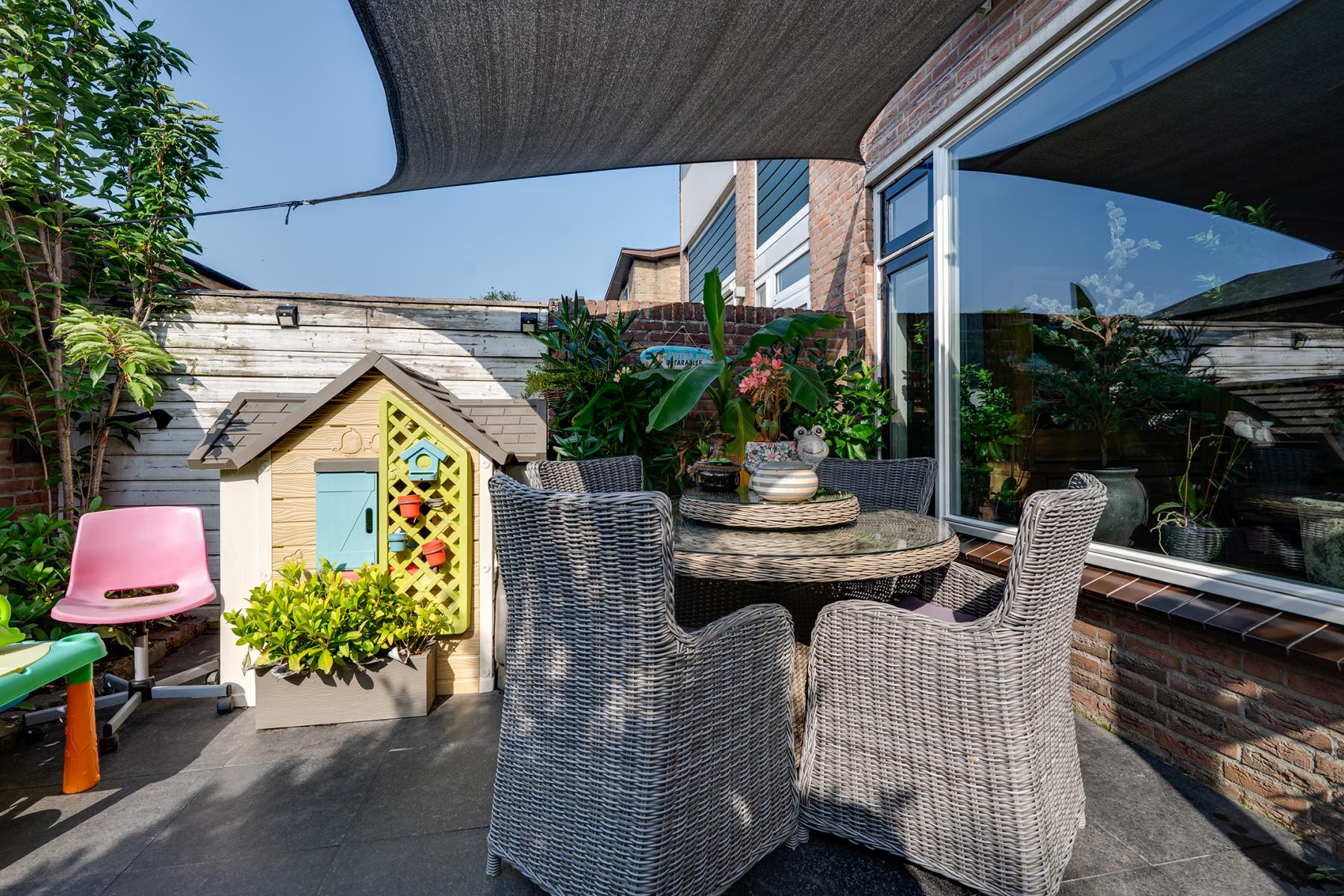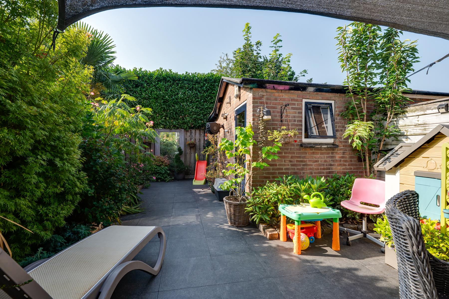 De achtertuin, betegeld met natuursteen, ligt op het zuiden. Dit betekent dat je hier de hele dag door van de zon kunt genieten. Of je nu wilt tuinieren, ontspannen met een boek of lekker buiten eten. Achterin de tuin staat een stenen berging met elektra en water; perfect voor het stallen van fietsen, wasruimte en extra berging.