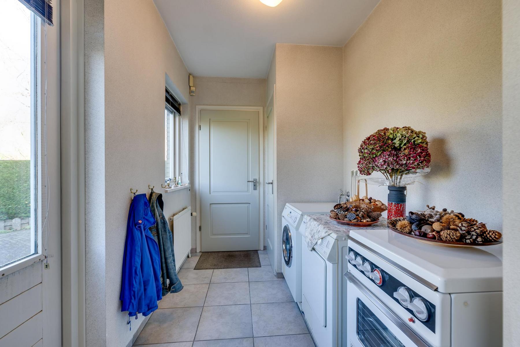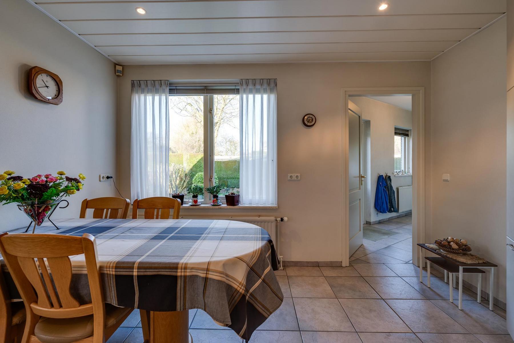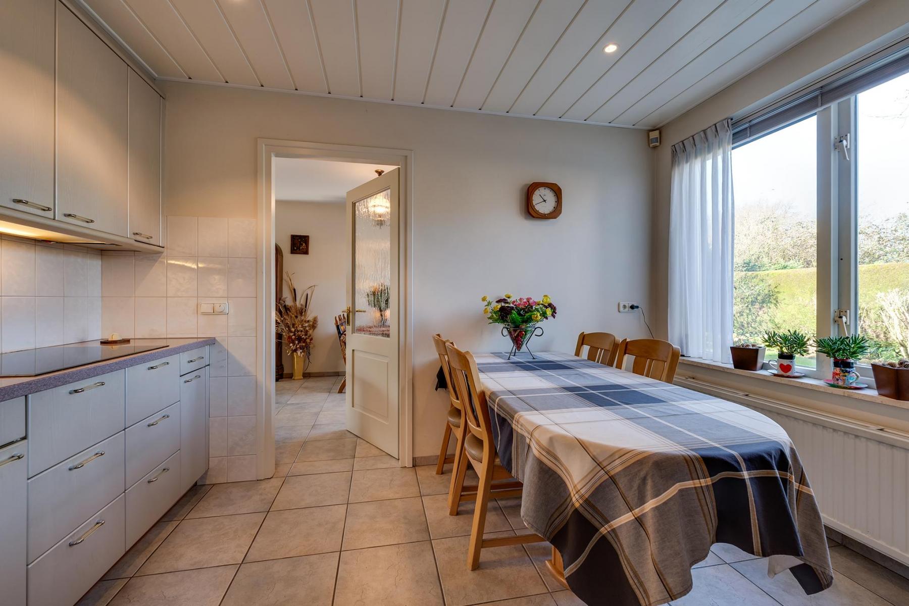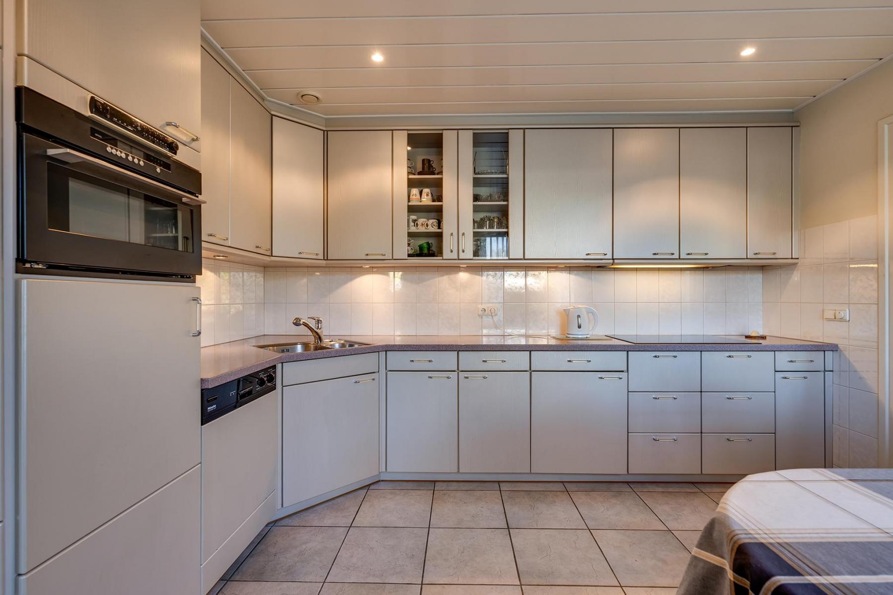 De aangrenzende woonkeuken is in hoekopstelling en is voorzien van een keramisch aanrechtblad, inductie kookplaat, afzuigkap, vaatwasser, combi-oven, 1,5 spoelbak en een apothekerskast. In de keuken is voldoende ruimte voor een extra eethoek. Achter de keuken bevindt zich de praktische bijkeuken met o.a. de aansluitingen voor het witgoed. Vanuit de bijkeuken heeft u toegang tot tuin.