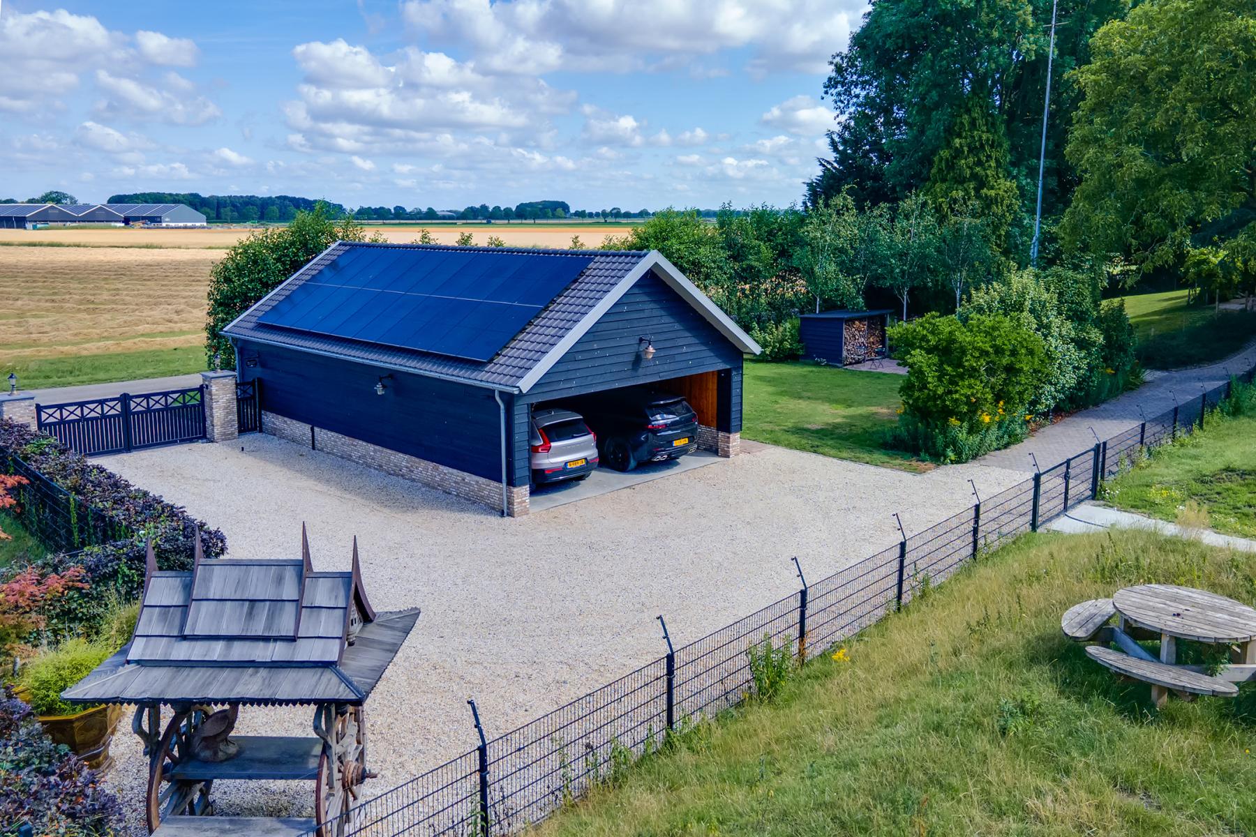 Aan de voorkant van het terrein staat een vrijstaande, volledig geïsoleerde houtgarage met een carport voor twee auto's. Deze is voorzien van elektriciteit en water. Daarnaast is er een ruime schuur aanwezig, ook met elektra en water, ideaal voor opslag of hobby. Een extra voordeel, de schuur is voorzien van 40 zonnepanelen, op zonnige dagen wek je daarmee meer stroom op dan je gebruikt – duurzaam een voordelig!