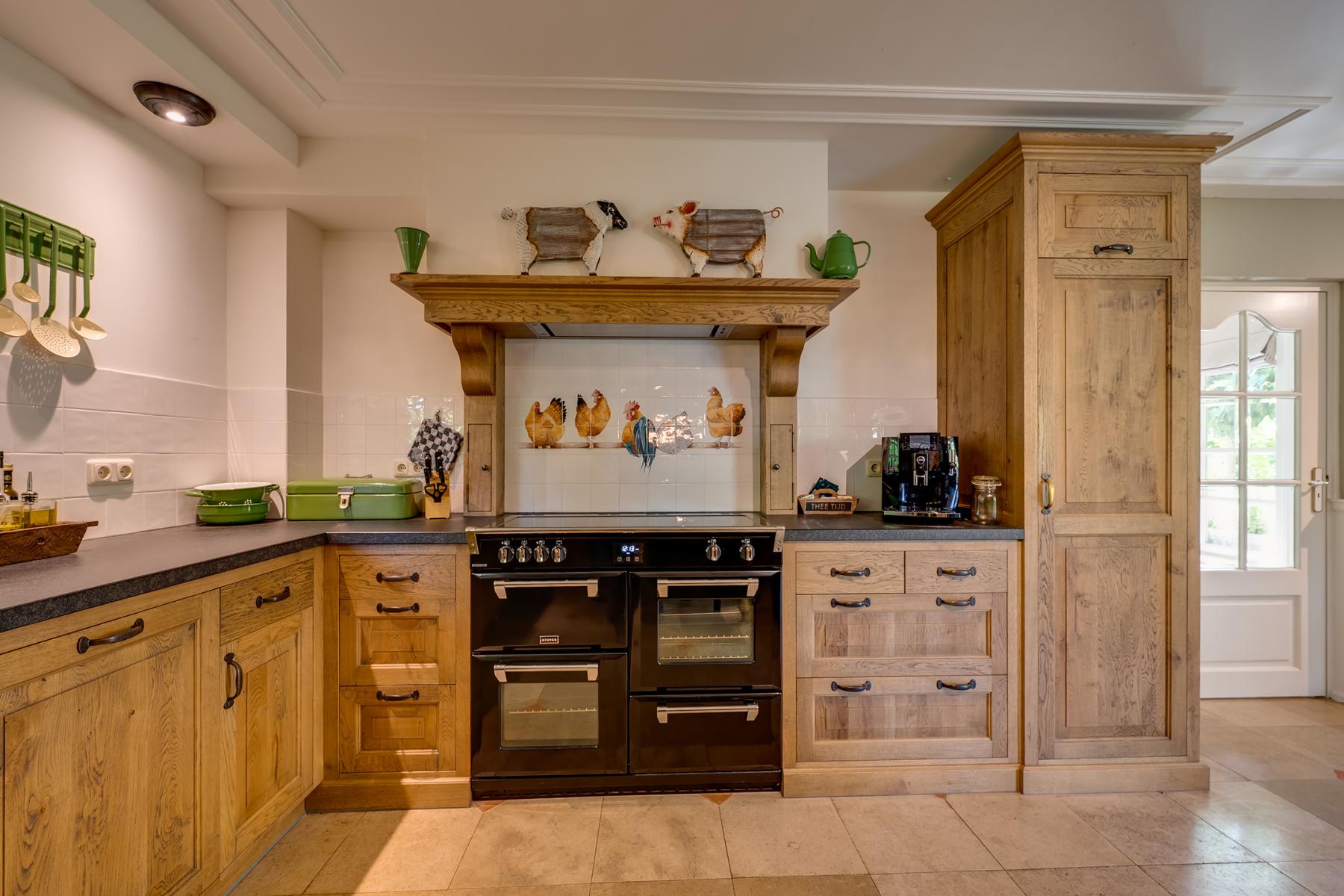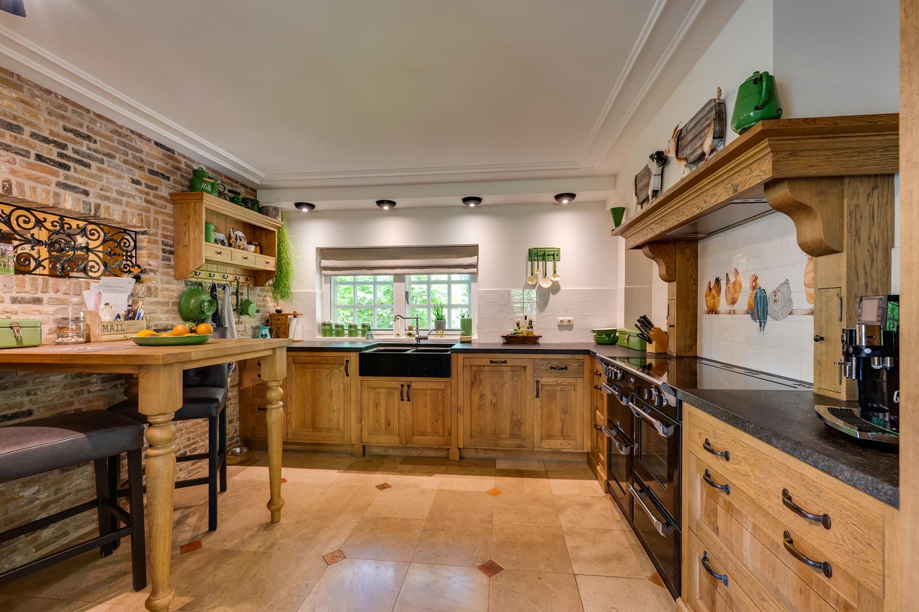 De linker woonkamer heeft een L-vormige indeling met een landelijke halfopen keuken en een gezellige houtkachel. De keuken is van alle gemakken voorzien: een plintboiler, 5-pits kookplaat, maar liefst vier ovens, twee spoelbakken, vaatwasser, koelkast, vriezer en een geïntegreerde afzuigkap.
