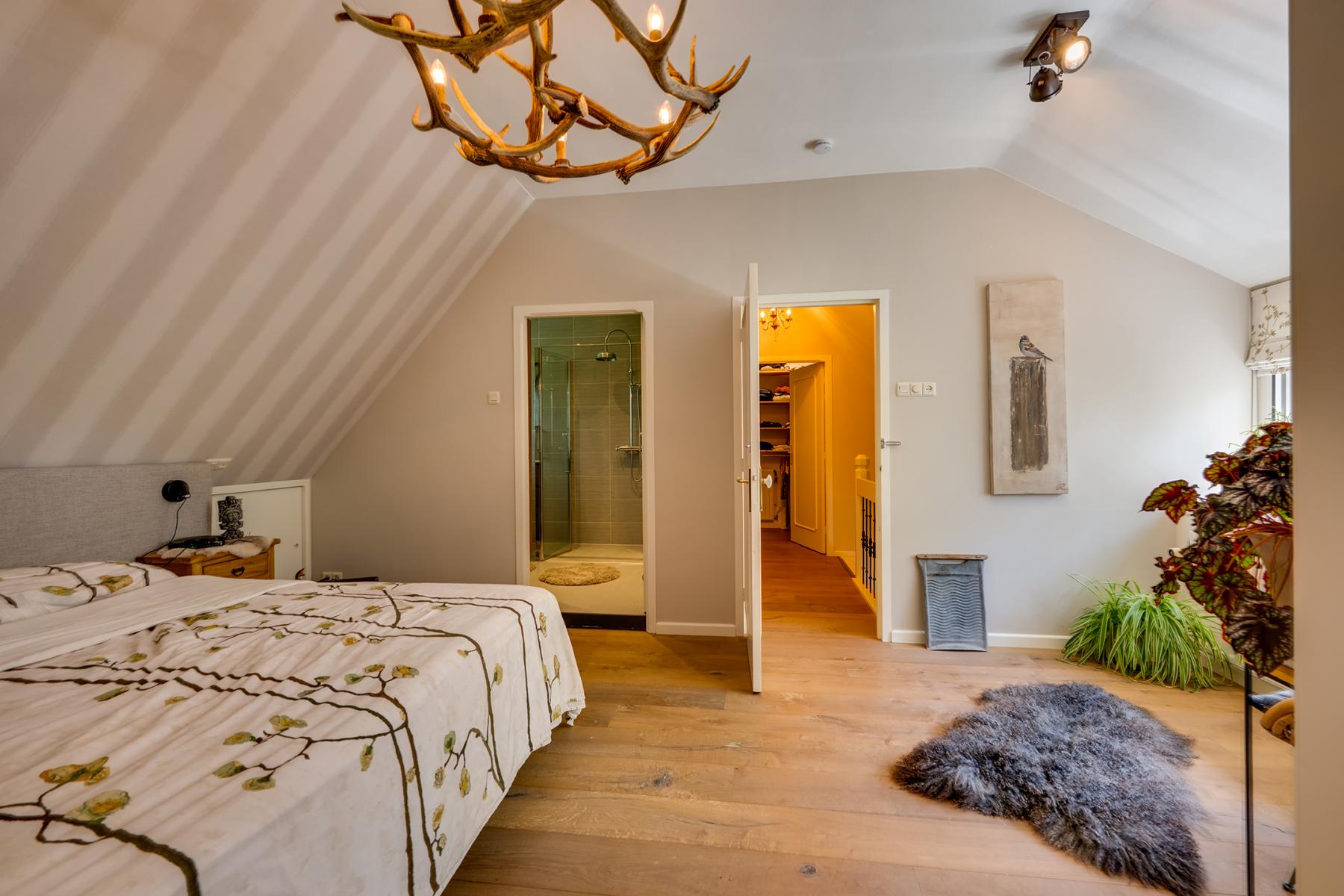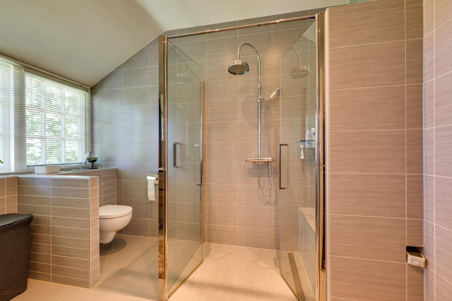 De trap in de woonkamer brengt je naar een overloop die grenst aan de master bedroom, een inloopkast én een luxe ensuite badkamer. Deze is voorzien van een wastafelmeubel, toilet en een douche met geïntegreerde sunshower infraroodfunctie.