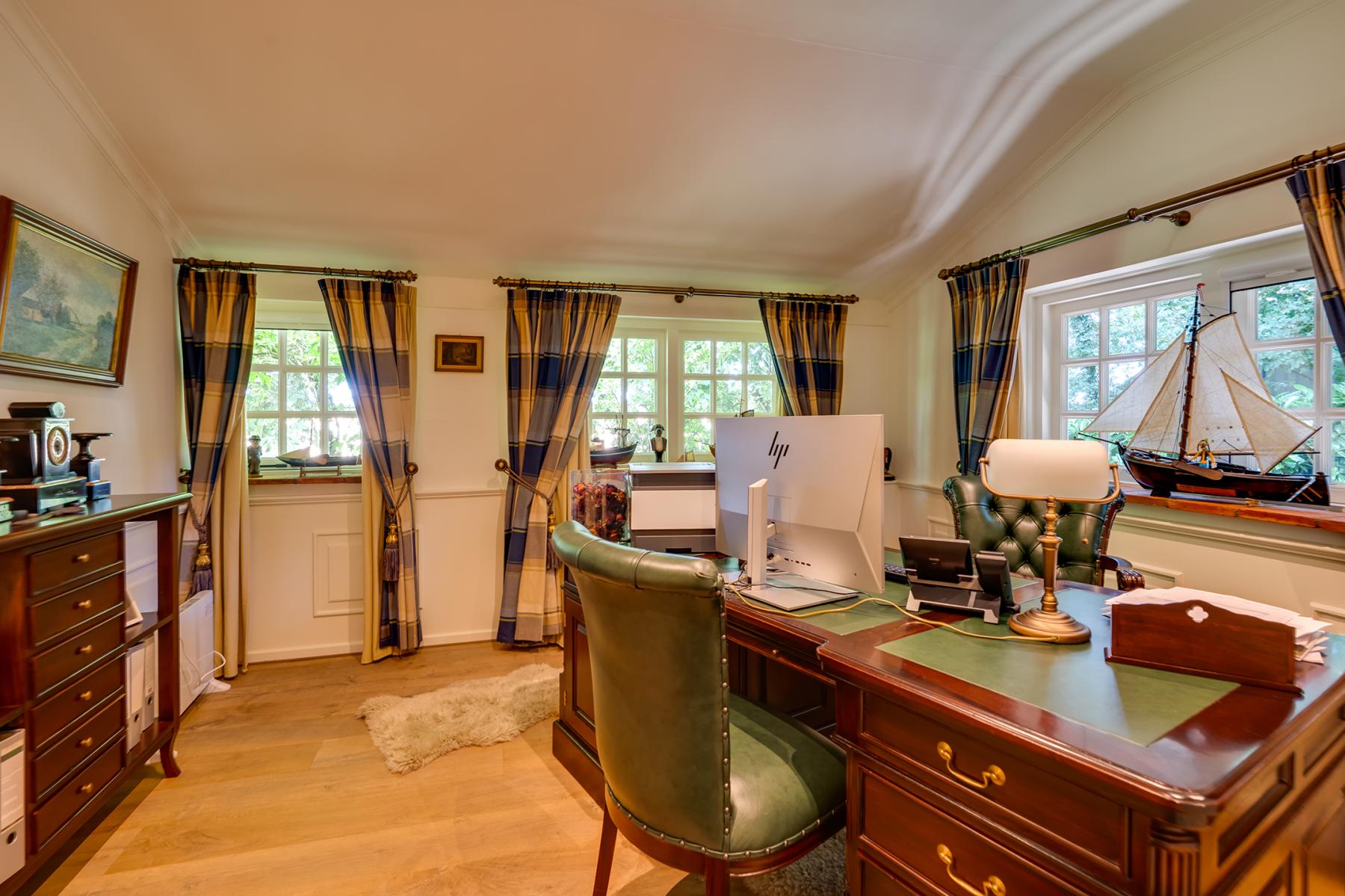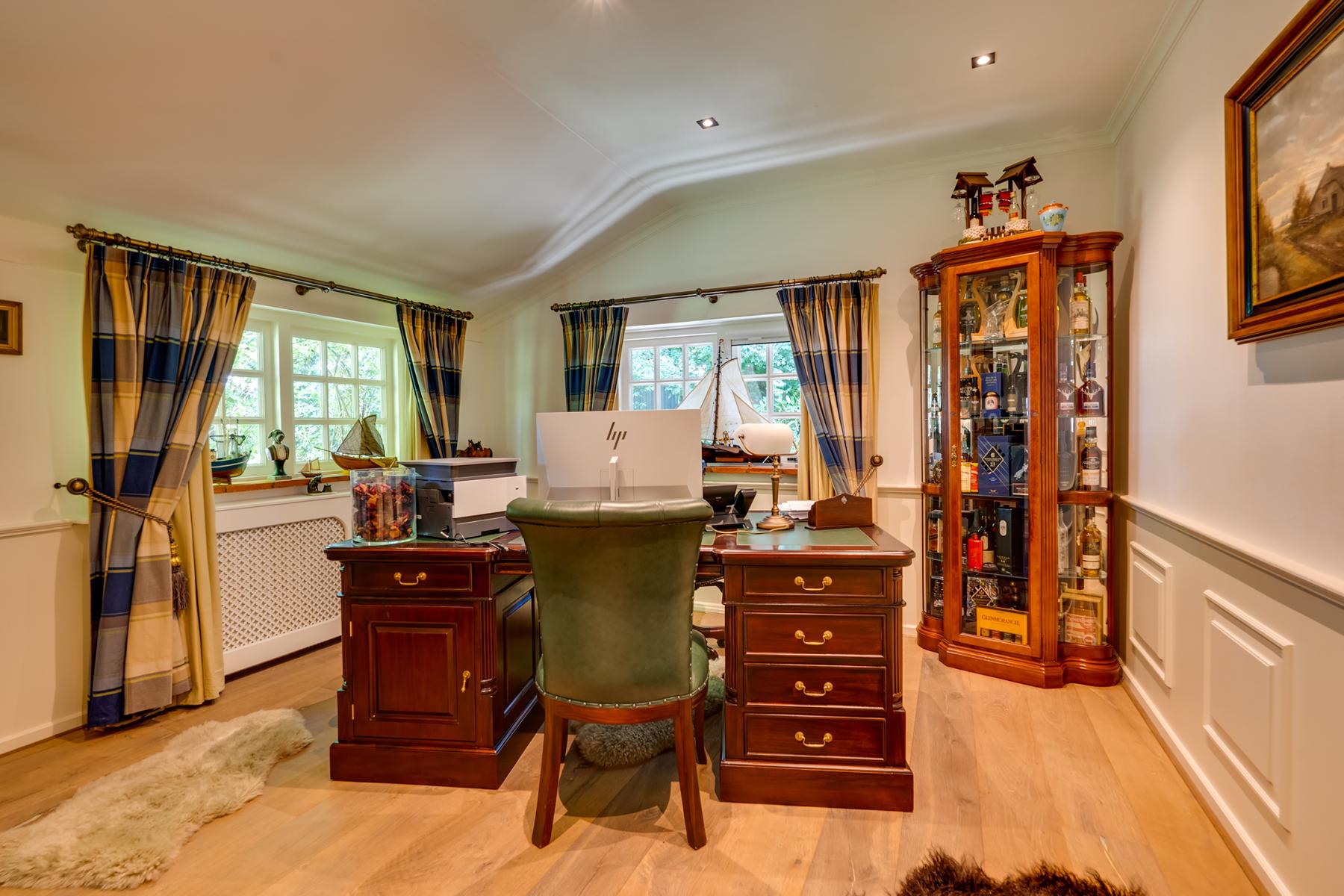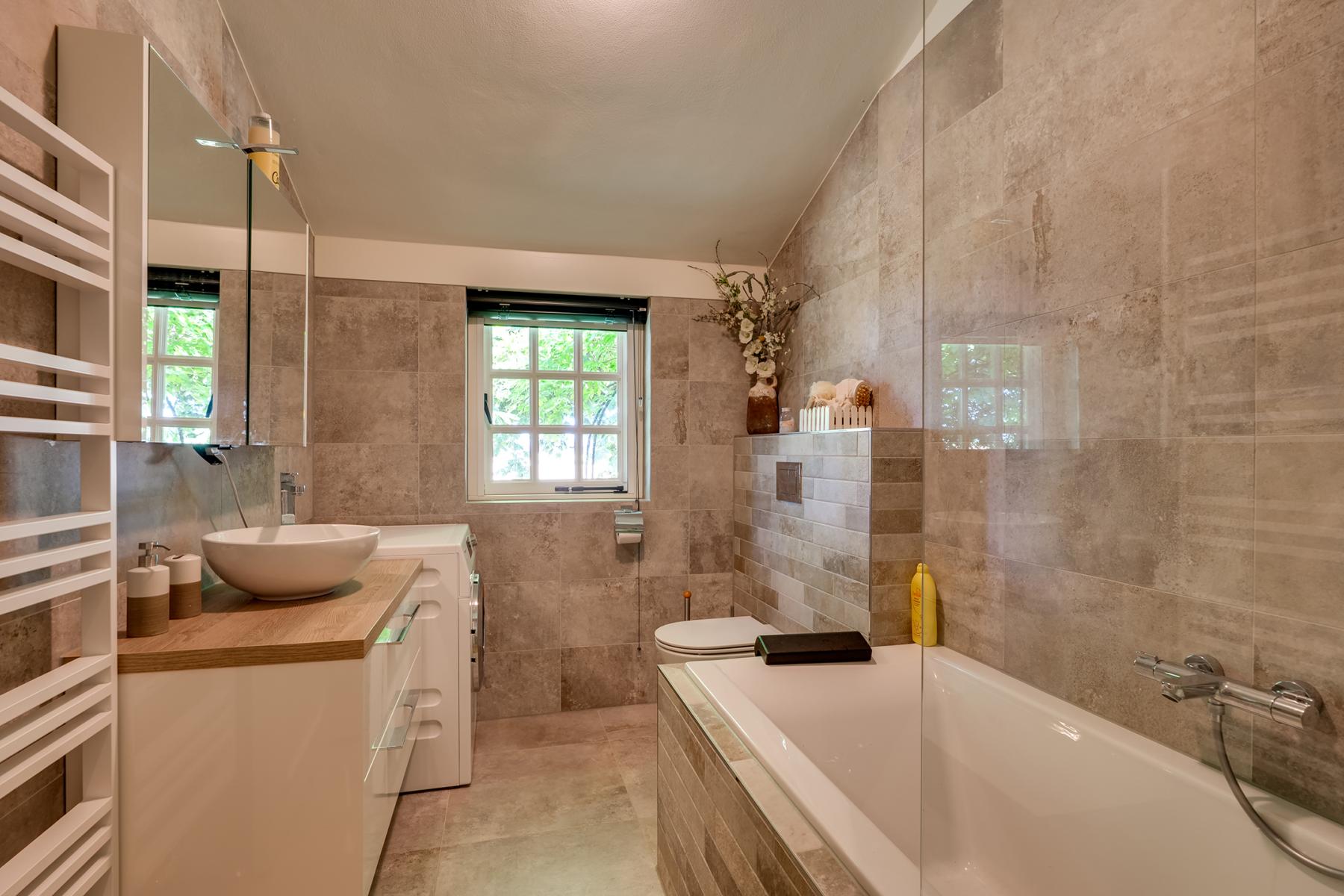 Op de begane grond vind je verder een ruime werkkamer, een slaapkamer en een badkamer. De badkamer is uitgerust met een ligbad, wastafelmeubel en wasmachine-aansluiting.