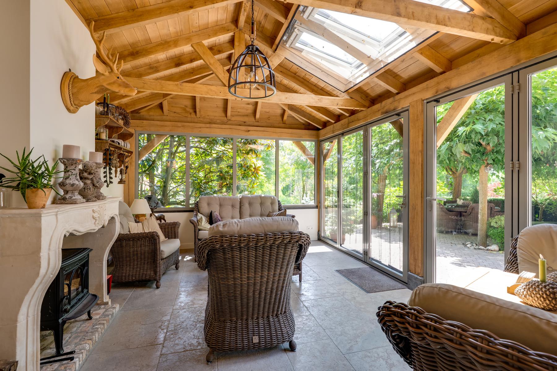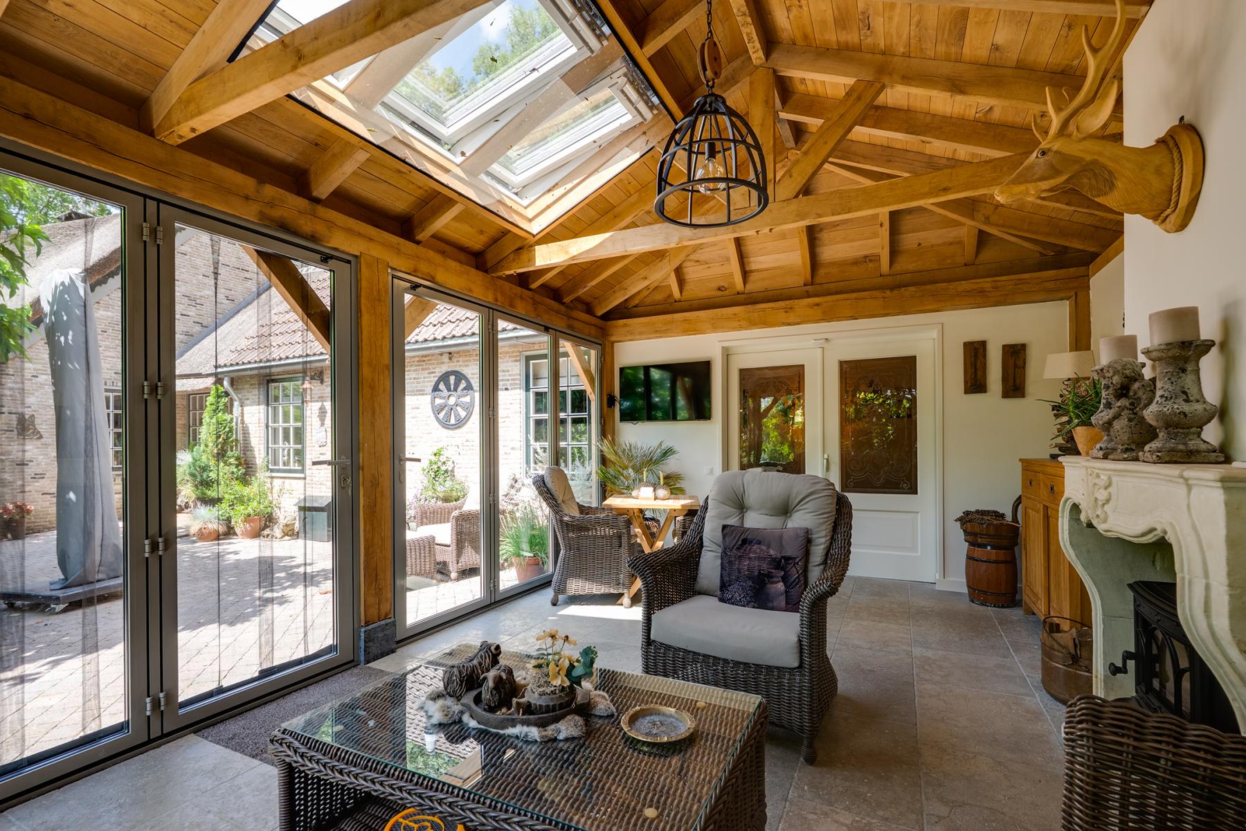 Via de entree – met praktische waskast – bereik je de rechter woonkamer, waar een open keuken is geplaatst met oven, vaatwasser, afzuigkap en spoelbak. Vanuit deze ruimte stap je zo de serre in. Dankzij de grote raampartijen rondom is het hier heerlijk licht. In de serre staat ook een houtkachel voor knusse avonden met uitzicht op de tuin.