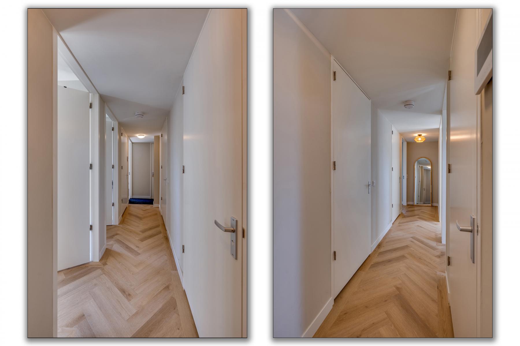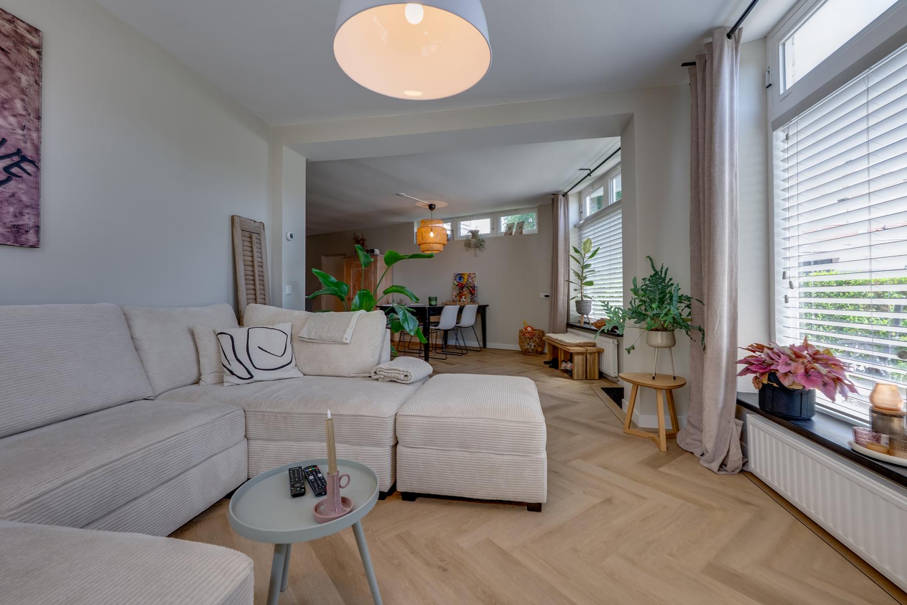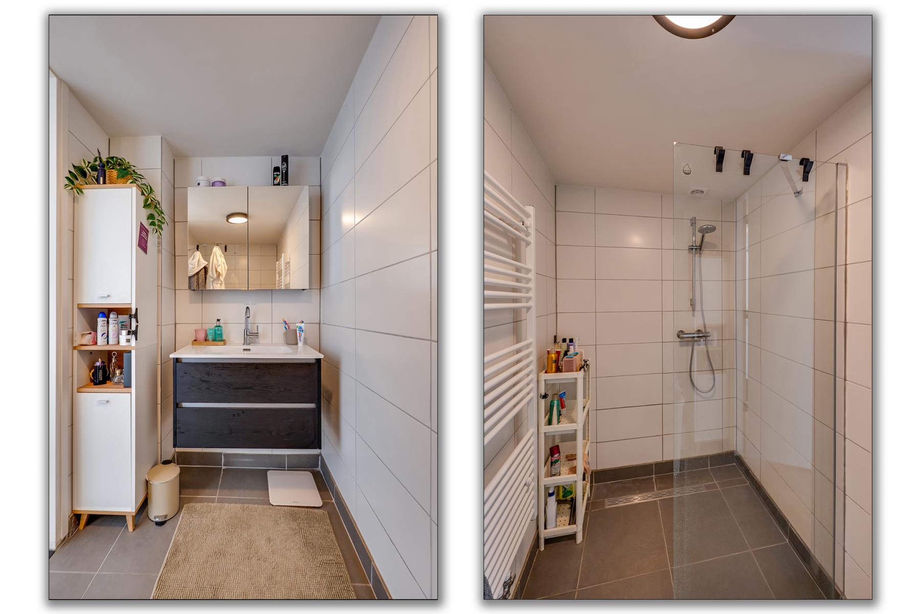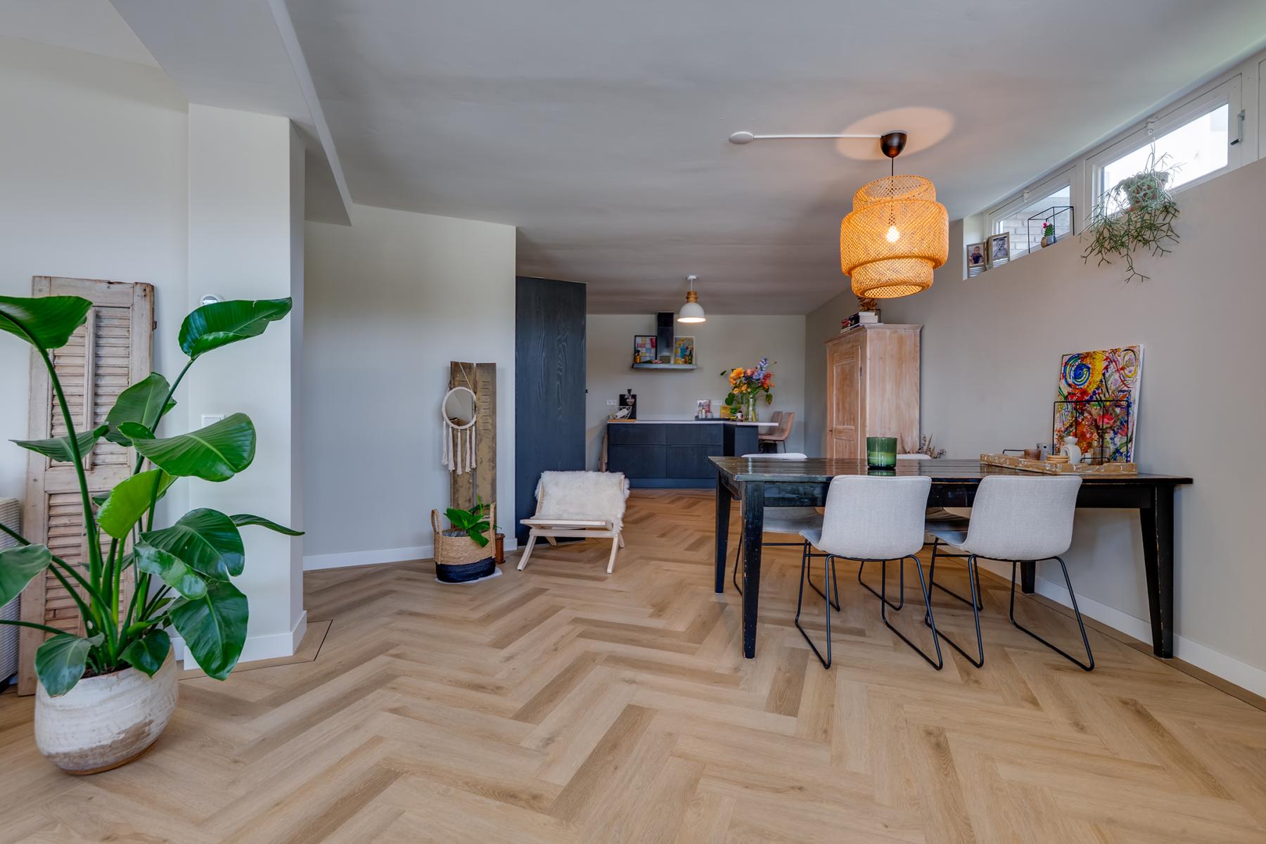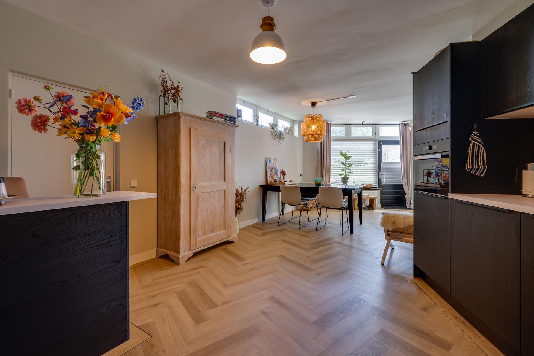 De woonkamer voelt ruim en toch knus dankzij de speelse hoek, ideaal voor een gezellige zit- én eethoek. De keuken heeft twee praktische keukenblokken en biedt toegang tot een extra berging met witgoedaansluiting. De keuken is voorzien van een combi-oven, spoelbak, vaatwasser, inductiekookplaat, en een recirculatie afzuigkap.