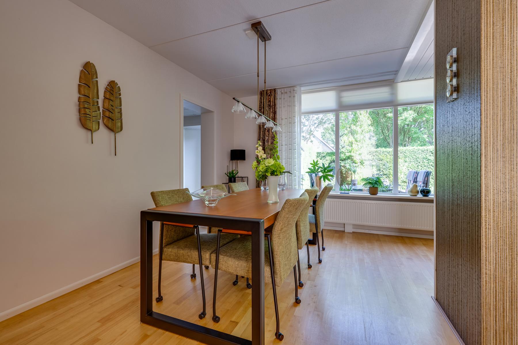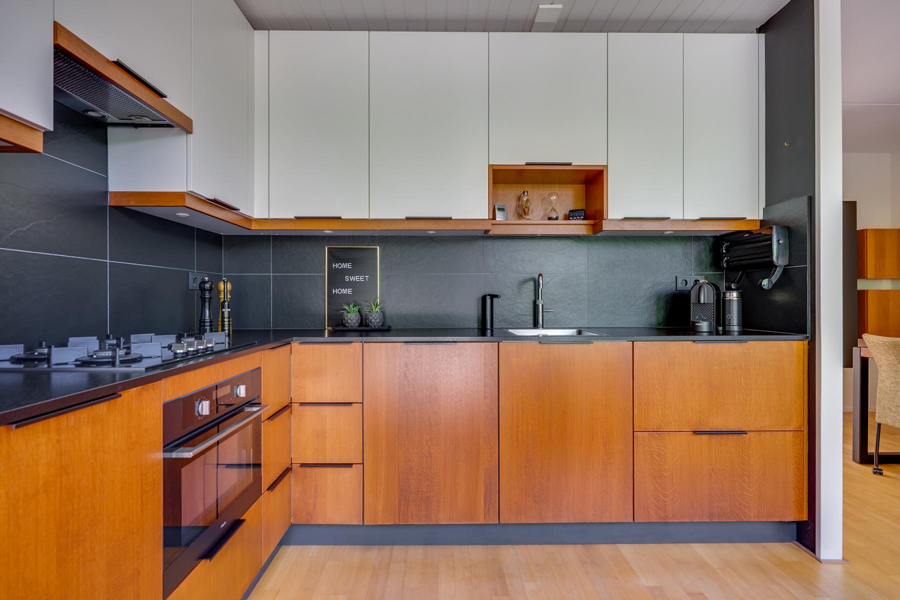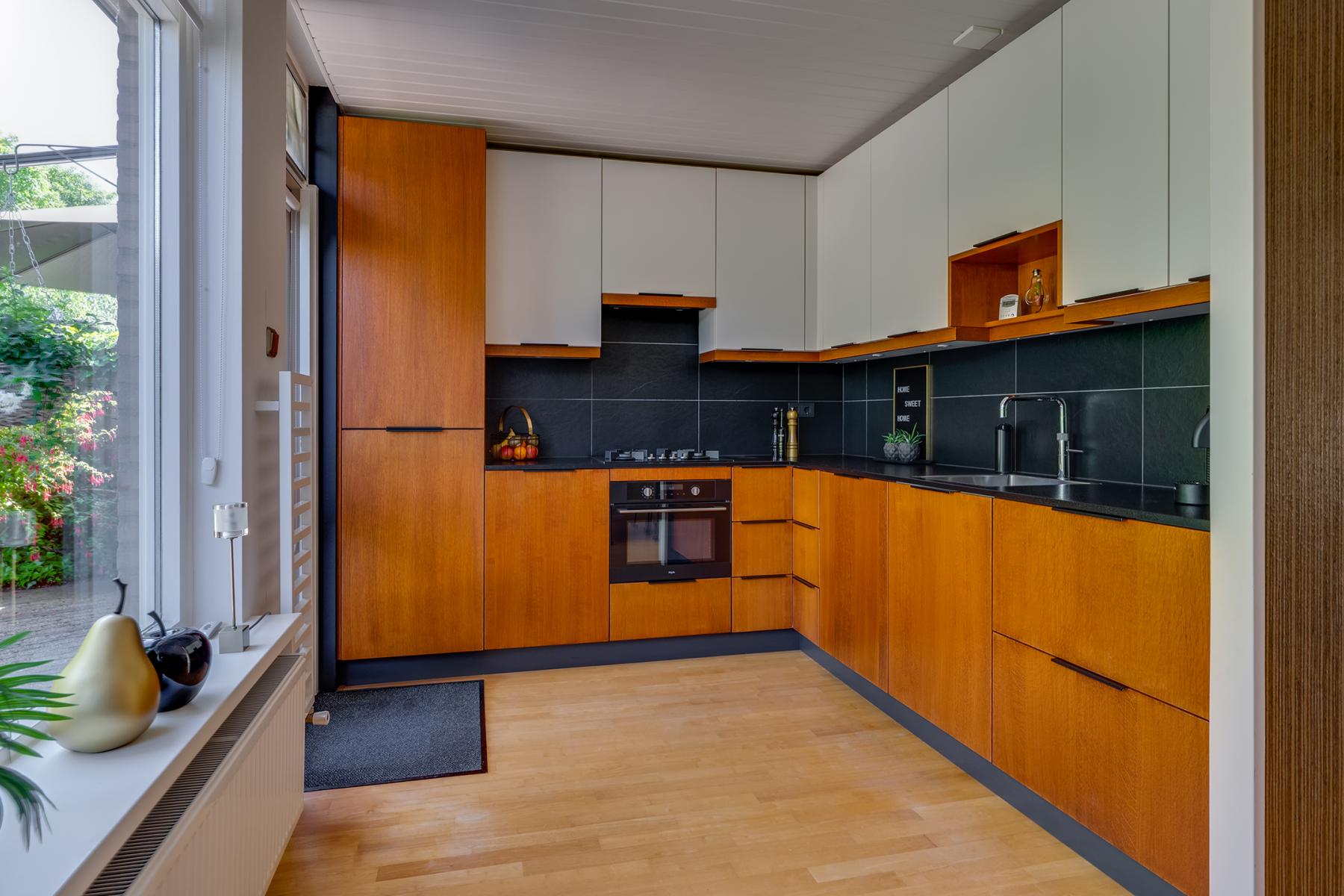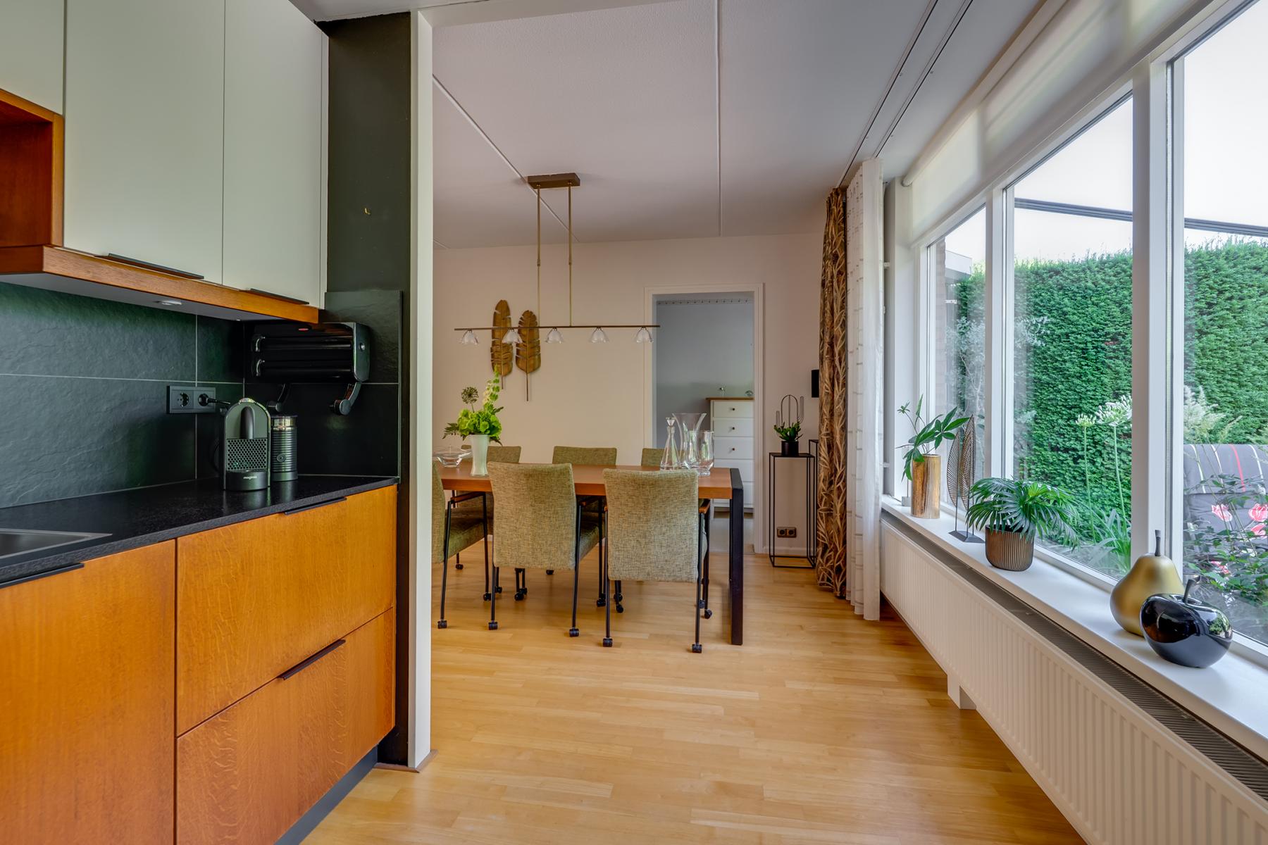 Aan de achterkant van de woning vind je de eetkamer met open keuken. Ook hier zorgt een groot raam voor een fijne, lichte sfeer. De keuken is van alle gemakken voorzien: een koel-vriescombinatie, vaatwasser, quooker, combi-oven, 4-pits gaskookplaat, afzuigkap en een ruime spoelbak. Via de achterdeur loop je zo de zonnige tuin in.