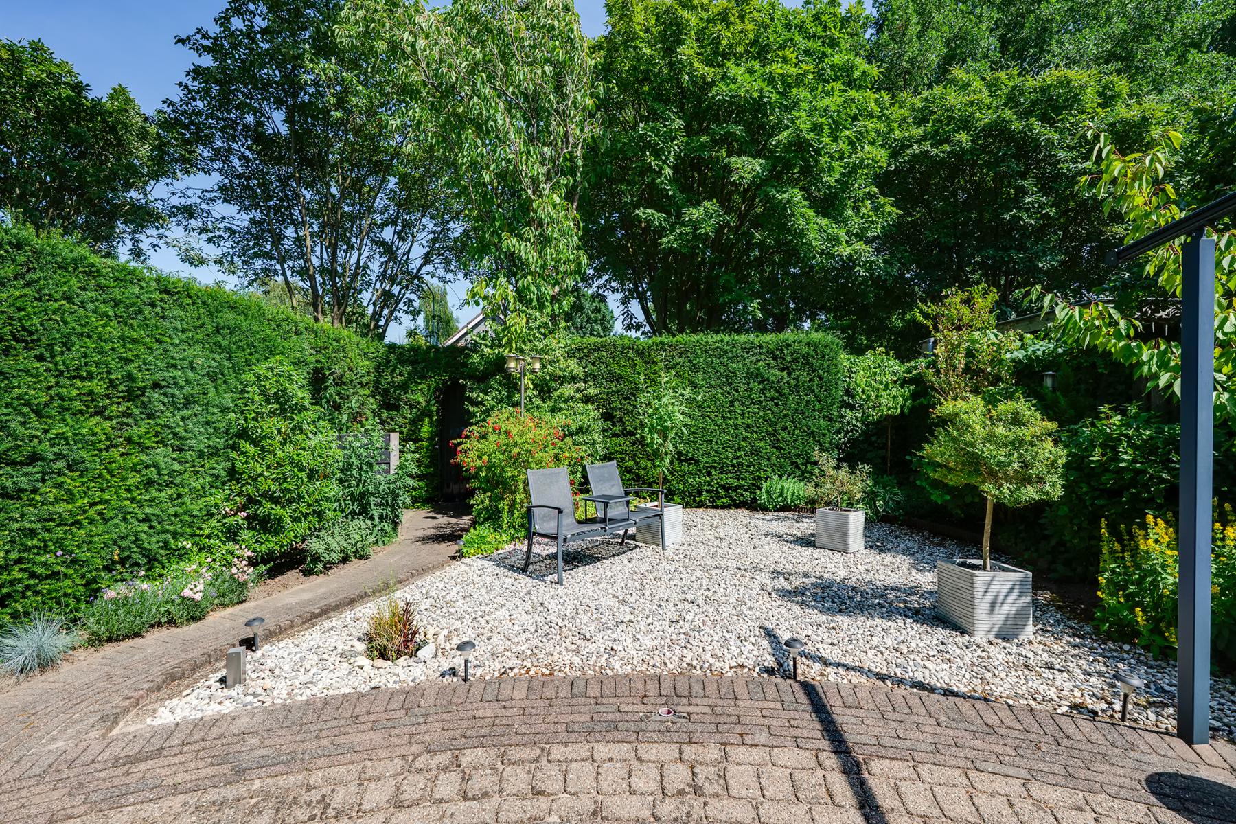 De verzorgde achtertuin ligt op het oosten en is een heerlijke plek om tot rust te komen. Direct aan het huis vind je een terras – perfect voor je tuinset – dat overloopt in een gedeelte met grind. Dankzij de groene hagen en planten rondom geniet je hier van veel privacy én een groen uitzicht.
