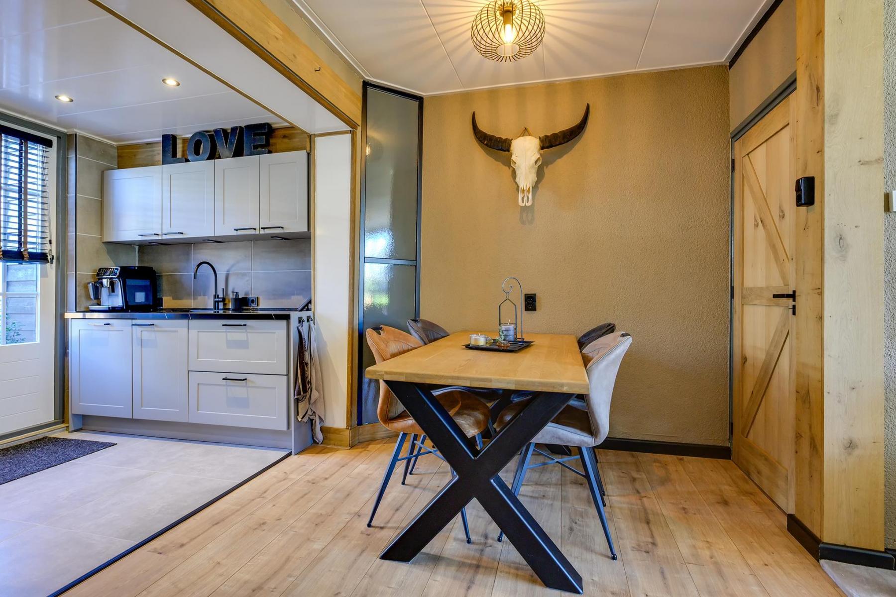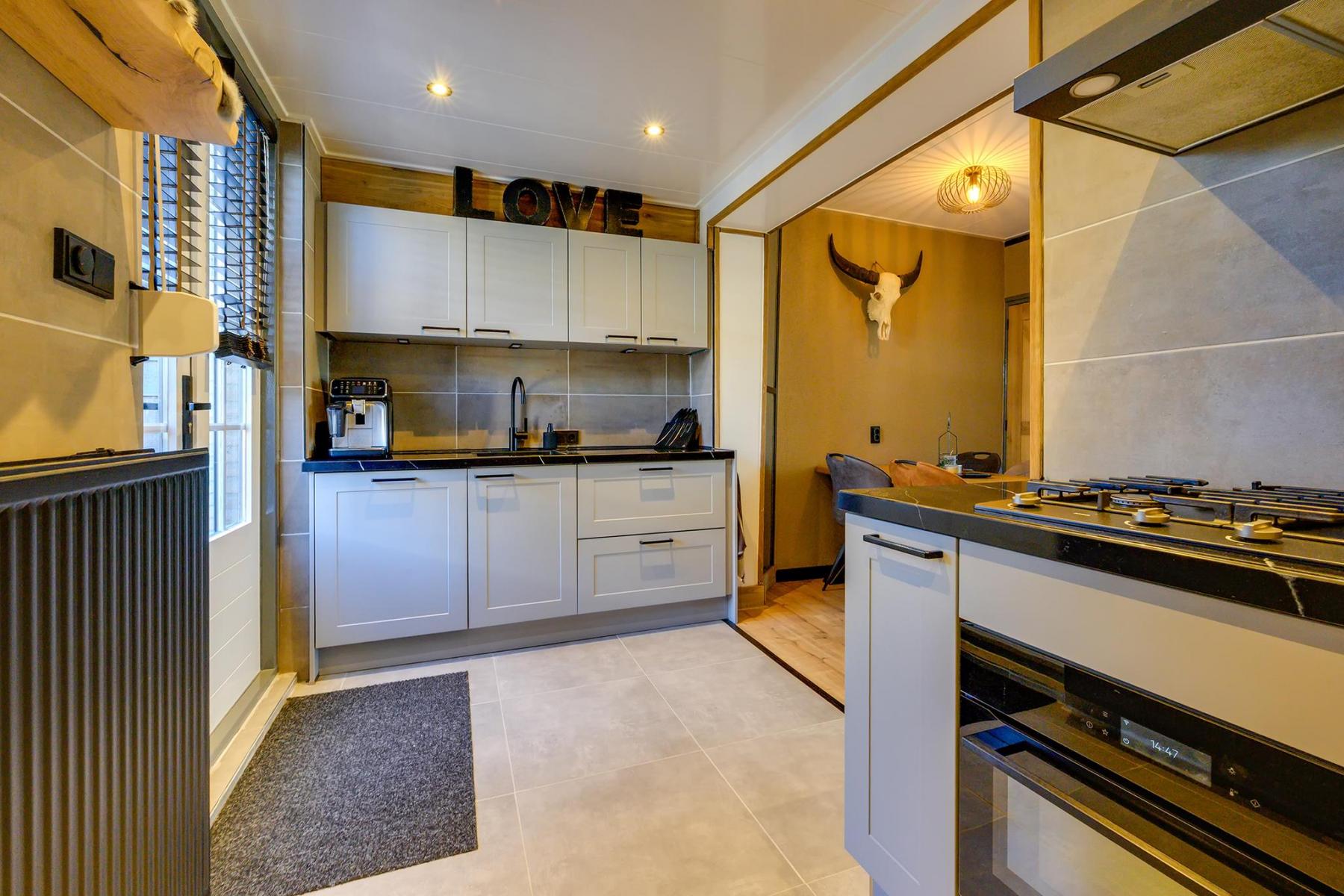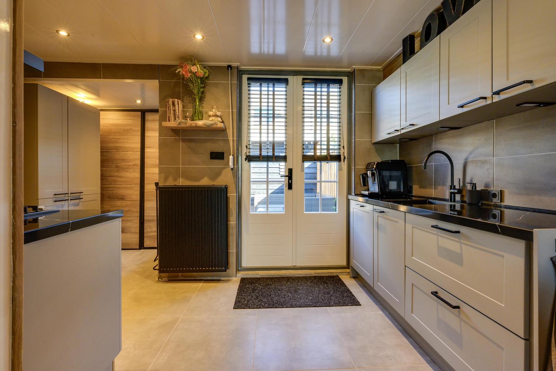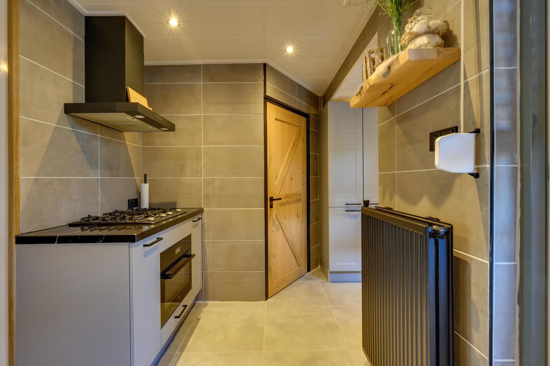 De ruime keuken, welke is opgedeeld in 2 blokken, is gesitueerd in de aanbouw. Er is een lang aanrechtblok met spoelbak, vaatwasser en veel kastruimte. Het andere blok is bedoeld voor het koken, met een 4-pits gasstel, afzuigkap en combi-oven. Daarnaast is er nog een grote losstaande koel-/vriescombinatie.