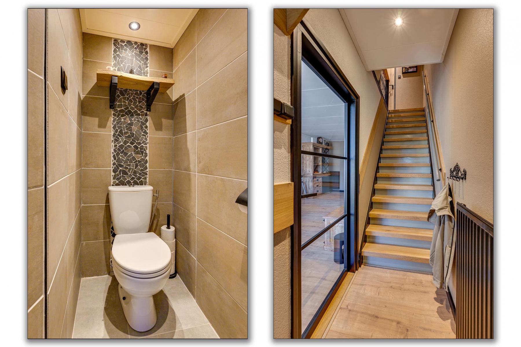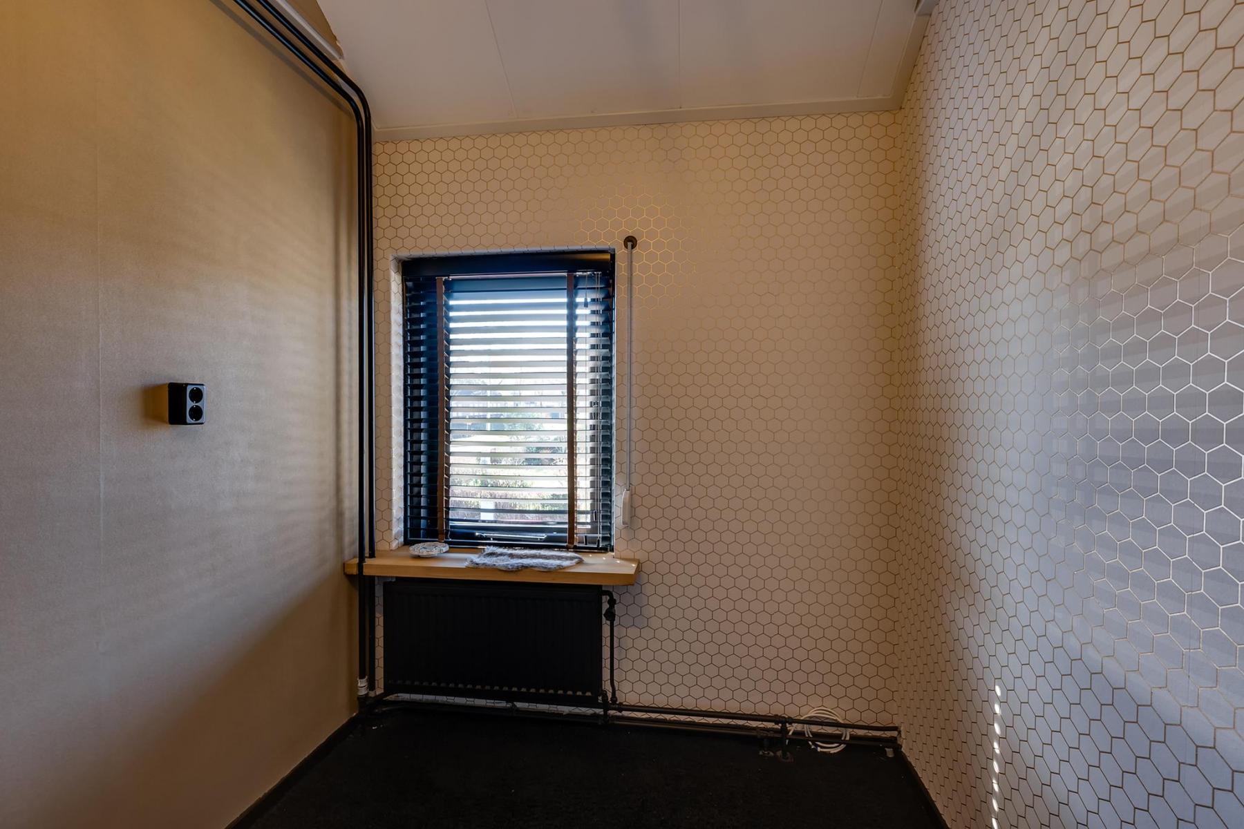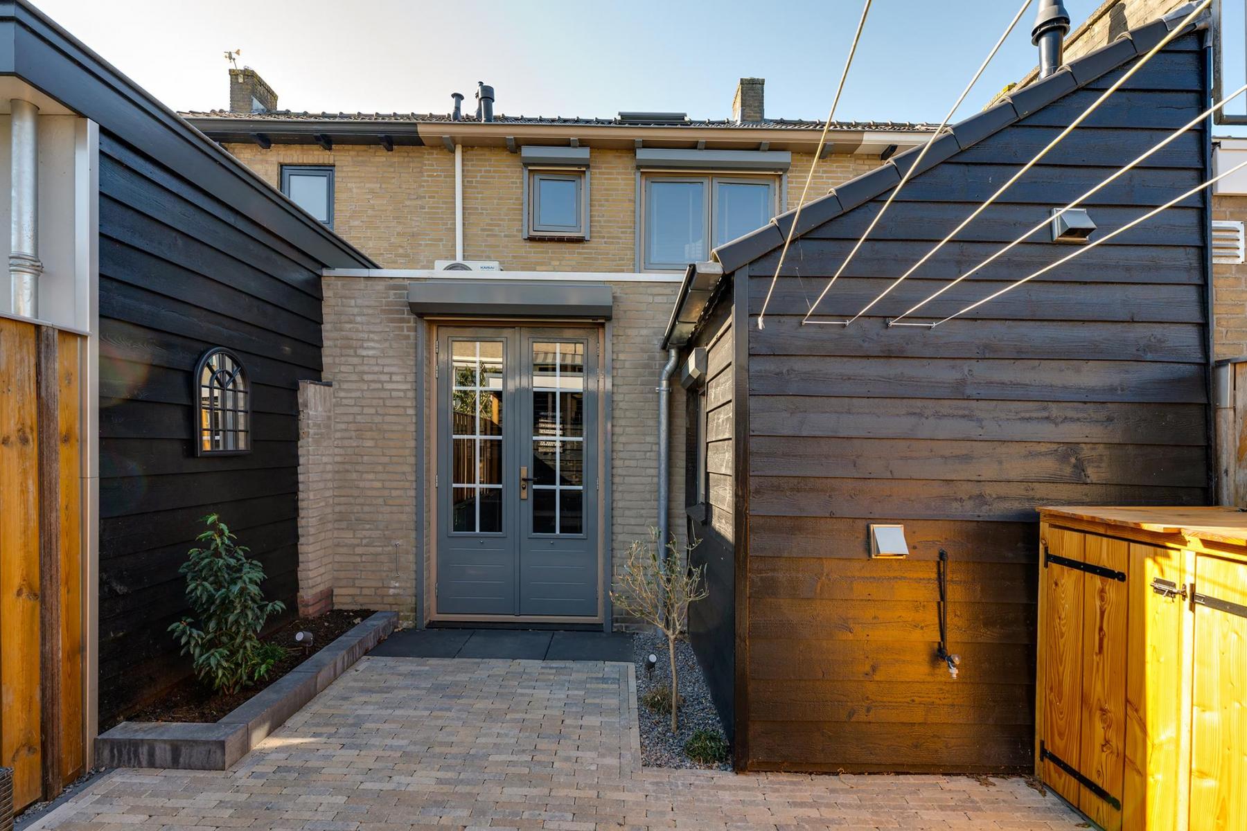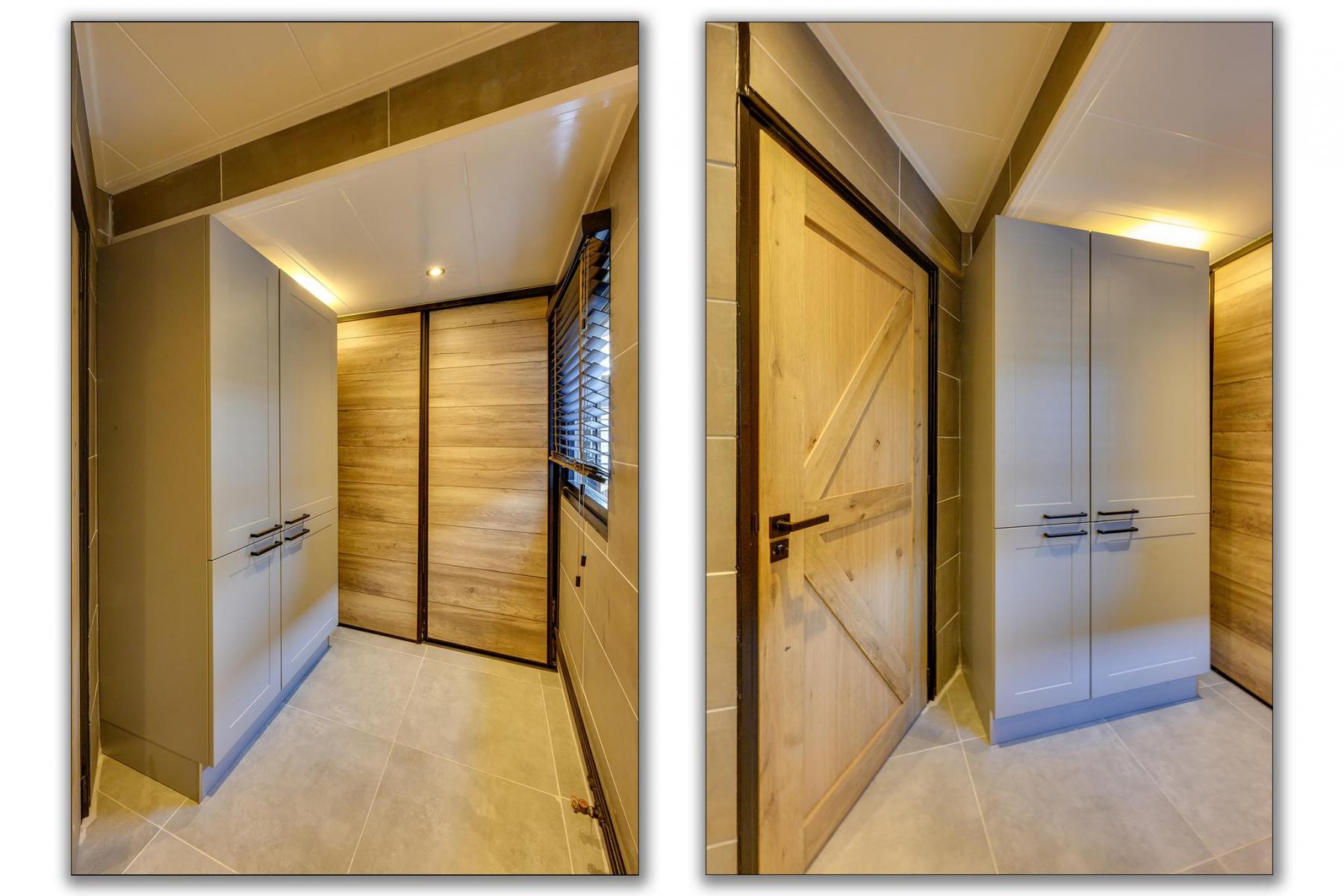 Verder bevinden zich in de keuken nog het toilet en een schuifkastenwand met daarin de aansluitingen voor de wasmachine en de CV-installatie. De openslaande deuren geven toegang tot de tuin.