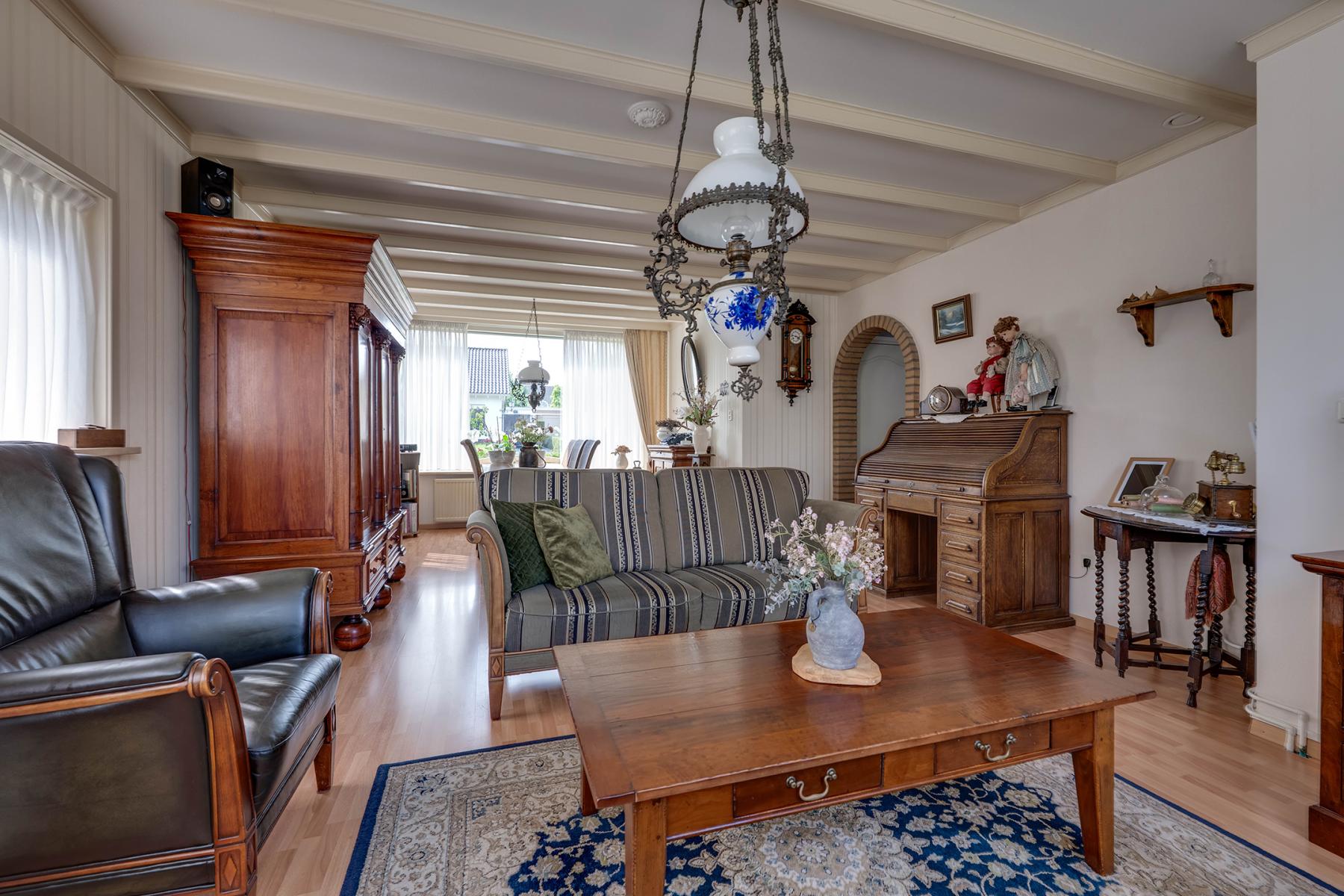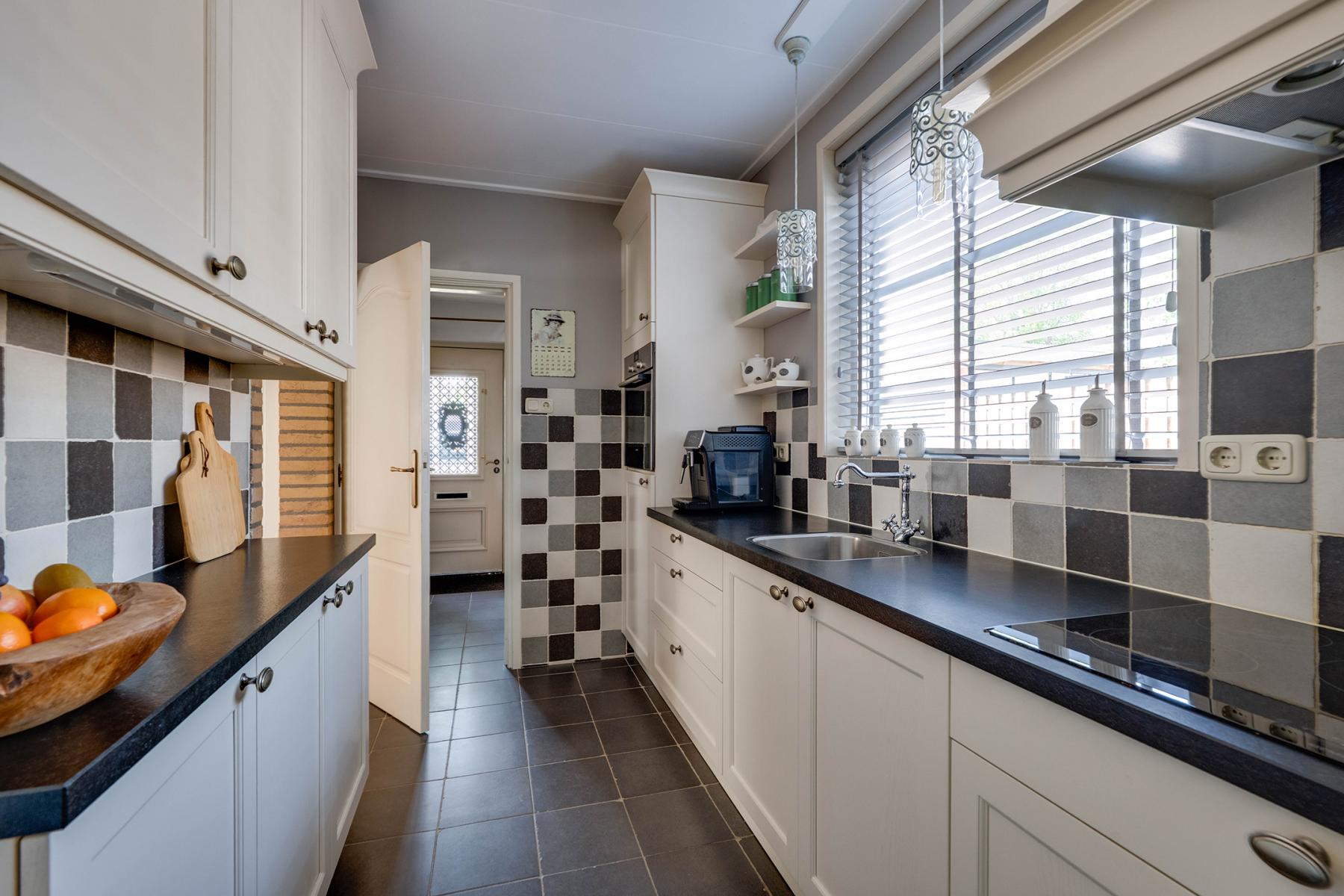 Via de hal met handige kelderkast loop je door naar de keuken. Deze granieten keuken is voorzien van een spoelbak, koelkast, oven, inductiekookplaat en afzuigkap. Vanuit hier heb je toegang tot de ruime woonkamer, die dankzij de grote ramen aan voor- én achterzijde veel licht binnen laten.
