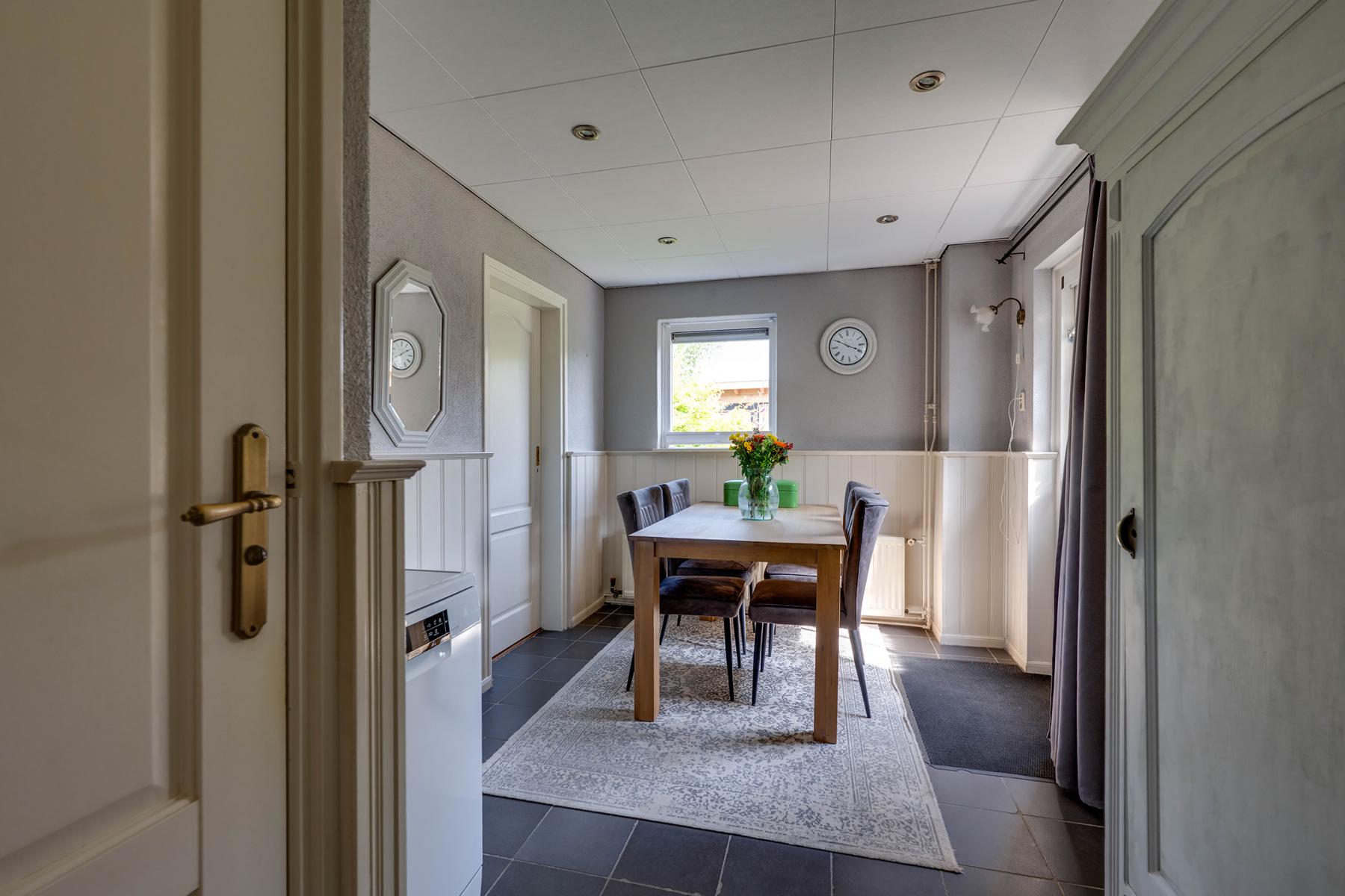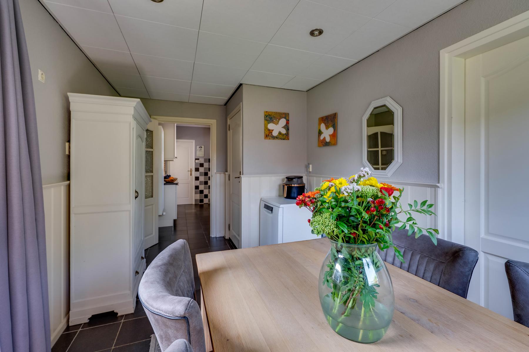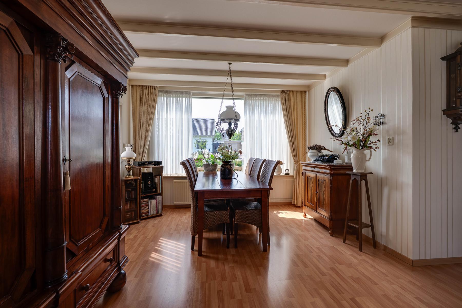 Naast de keuken ligt een aparte eetkamer – ideaal voor gezellige etentjes – en een separaat toilet. Vanuit de eetkamer bereik je zowel de aangebouwde garage als de grote achtertuin.