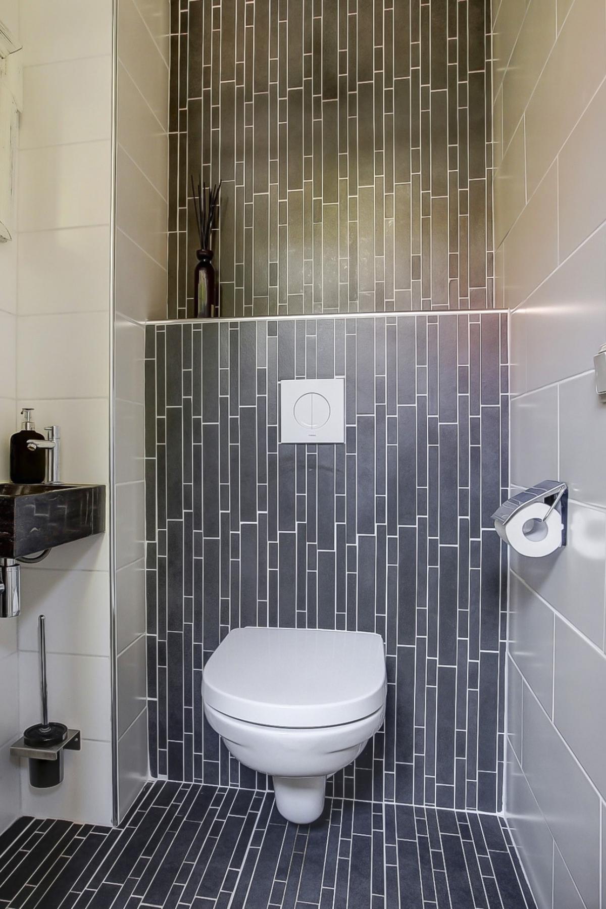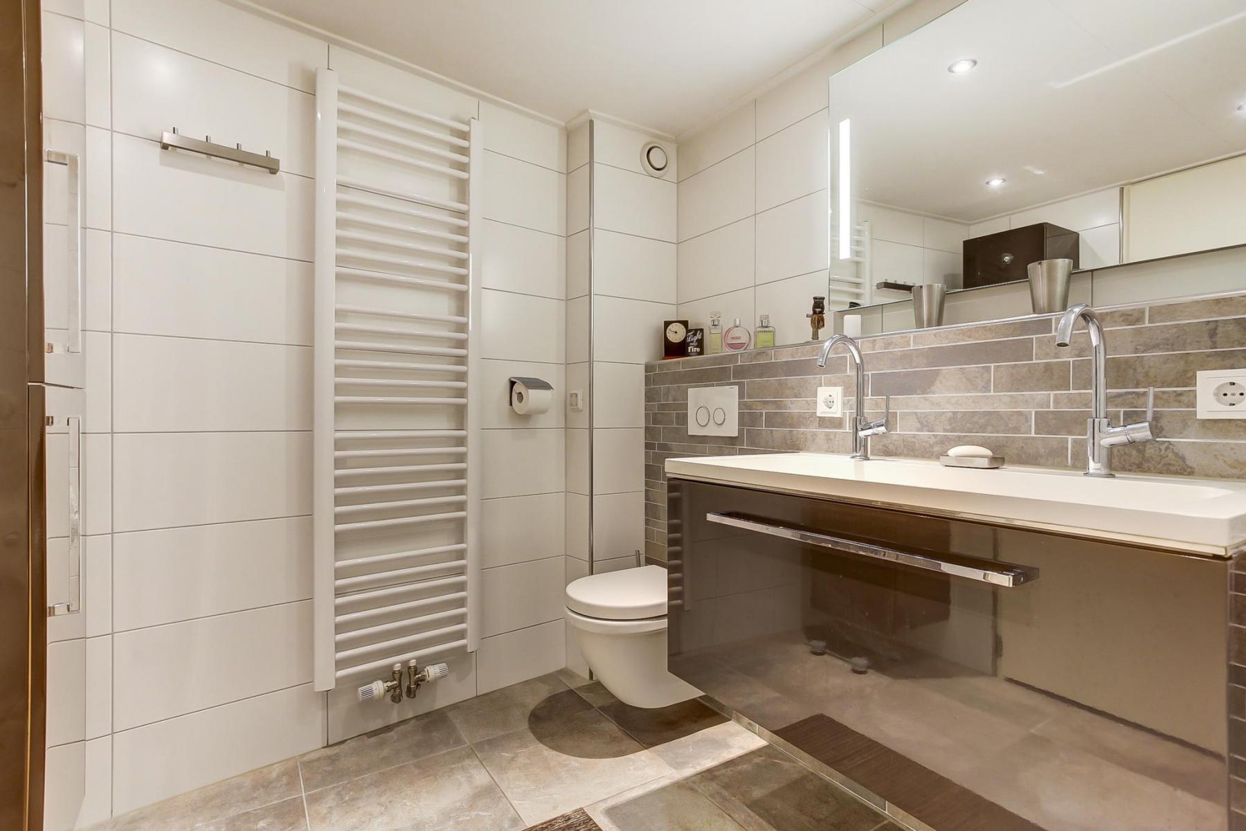 De verdieping is bereikbaar via de open spiltrap in de woonkamer. Op de verdieping een overloop, twee slaapkamers en de badkamer. De slaapkamer aan de voorzijde van de woning beschikt over een drietal inbouwkasten. De badkamer is voorzien van toilet, handdoekradiator, wastafelmeubel met dubbele wastafel en een inloopdouche. De badkamer is luxe ingericht en voorzien van een lichte tegel.