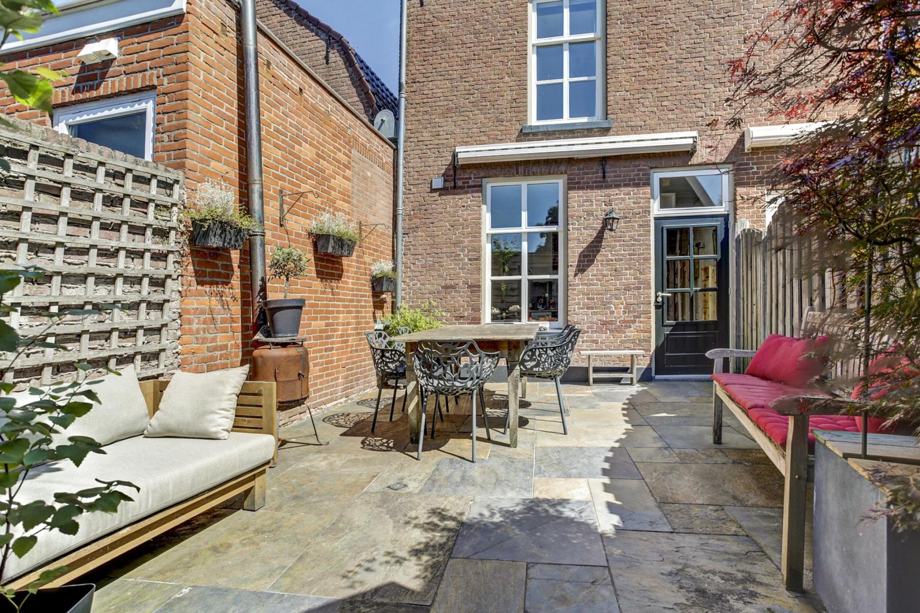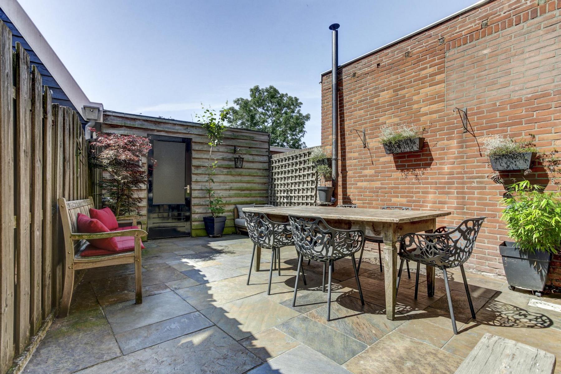 De tuin is gesitueerd op het zuiden en is voorzien van een siertegel. Hier is het heerlijk buiten zitten; een luxe binnen de vesting! En mocht het te warm worden in de zon, dan hangt er aan de achtergevel nog een zonnescherm, zodat u ook van de schaduw kunt genieten. Achterin de tuin staat een berging van ca. 16 m². Aan de achterzijde van de schuur is een deur, waardoor u zo de straat op loopt. Een elektrische auto kan hier opgeladen worden.