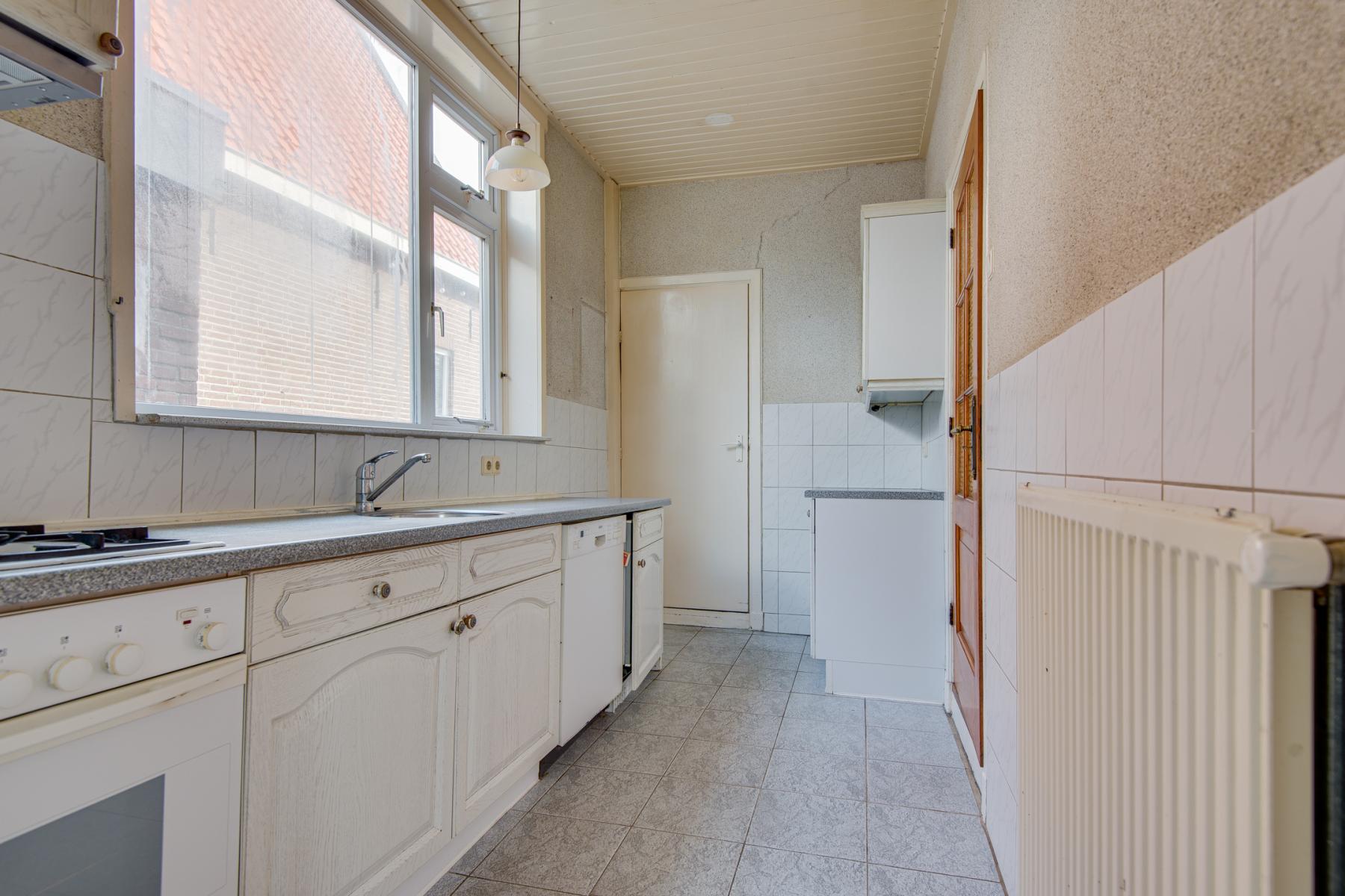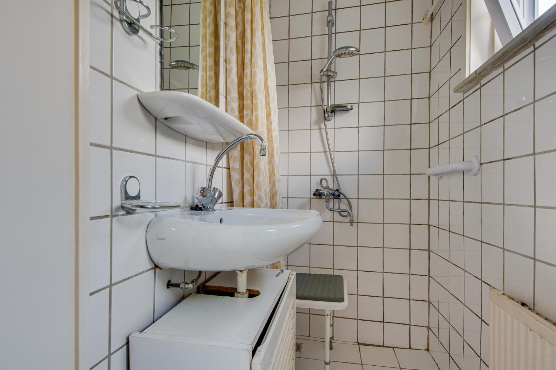 Op de begane grond vind je drie kamers, waaronder een slaapkamer – ideaal voor wie gelijkvloers wil wonen of een fijne werkplek zoekt. De hoge plafonds en grote ramen zorgen voor een lichte, open sfeer. De keuken grenst aan een halletje waar je het toilet en de eenvoudige badkamer vindt, voorzien van een wastafel en douche.